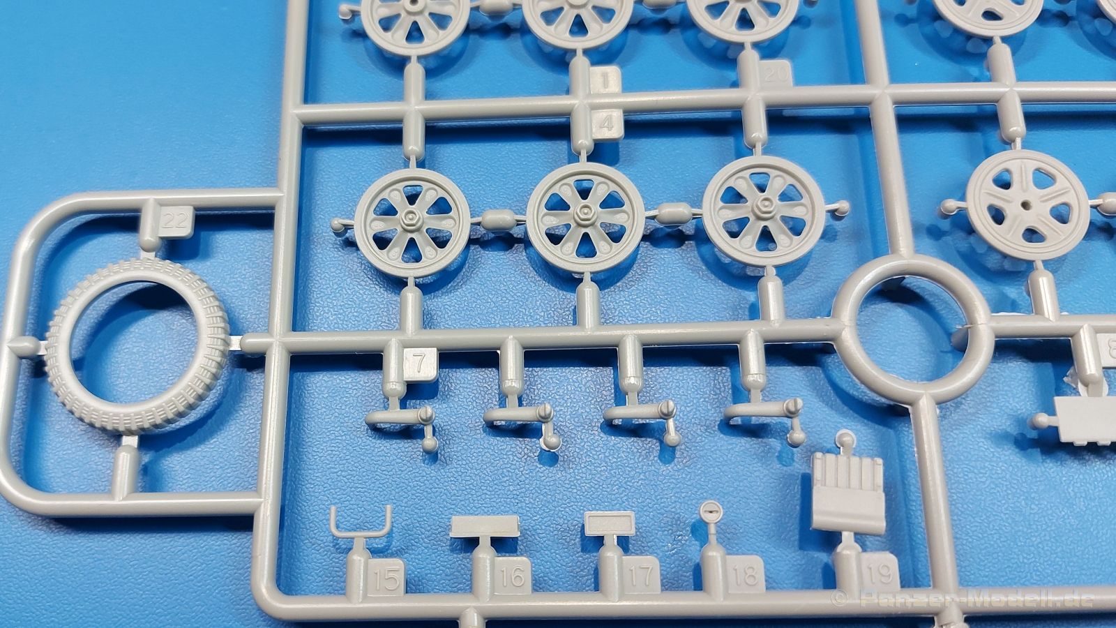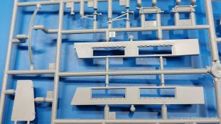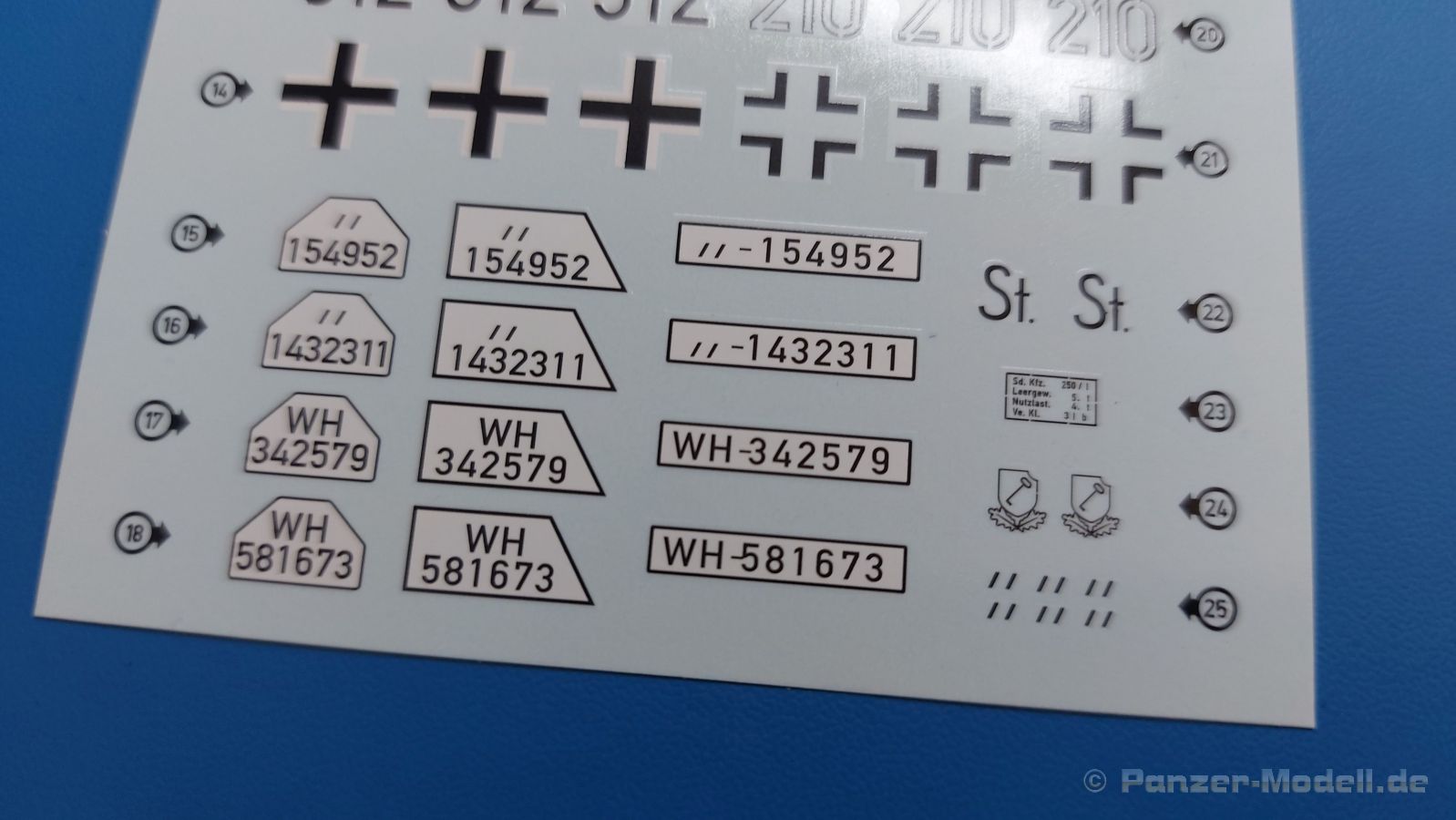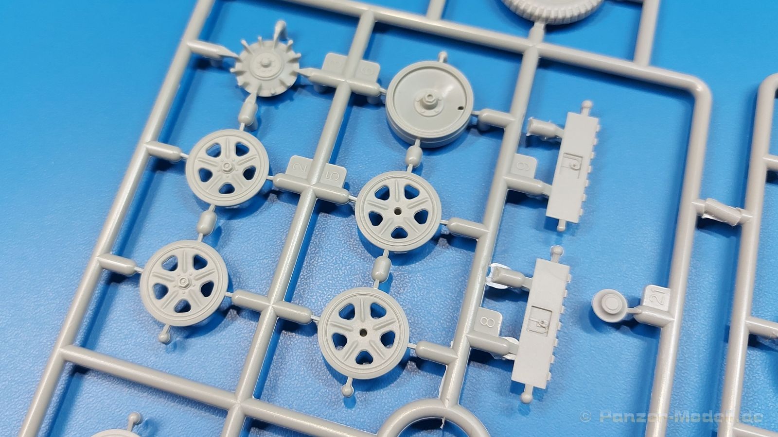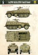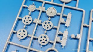 Das Original: Das Sd.Kfz. 250 war ein leichter Schützenpanzerwagen der Deutschen im 2. Weltkrieg, häufig in Panzeraufklärungs- und Kradschützenabteilungen an allen Fronten eingesetzt. Auf das Halbkettenfahrgestell des Sd.Kfz. 10 wurde ein Panzeraufbau aufgesetzt. Bei den älteren Fahrzeugen bestand der sehr verwinkelte Panzeraufbau aus 19 Panzerplatten, bei neueren Fahrzeugen war er gradlinig angeordnet und bestand nur noch aus 9 Panzerplatten. Erste Sd.Kfz. 250 kamen im Sommer 1941 zur Truppe, die neuere Form ab Juni 1943. Mit einem 100 PS Motor konnte der 5 Tonnen schwere Schützenpanzerwagen eine Geschwindigkeit bis zu 65 km/h erreichen. Die Besatzung bestand aus maximal 6 Soldaten. Je nach Einsatzzweck gab es verschiedene Varianten vom Sd.Kfz. 250/1 bis zum Sd.Kfz. 250/12. Das Sd.Kfz. 250/1 war die Schützenpanzer Version mit 6 Mann Besatzung und bis 2 MG Bewaffnung. Seltener in der Aufklärungsrolle eingesetzt, waren Sd.Kfz. 250 öfter zusammen mit Panzern im Gefecht, wobei der Kampf möglichst vom Fahrzeug aus geführt wurde. Der Bausatz: Das Werk belebt den Markt für Sd.Kfz. 250/1-neu Bausätze in Kooperation mit einem asiatischen Hersteller wieder. Der stabile Karton mit Stülpdeckel ist 390 x 255 x 85 mm groß. Darin befinden sich, in Klarsichttütchen verpackt, 10 hellgraue, 1 Klarsichtspritzling, eine Unterwanne, 1 PE-Platine, je ein Tütchen mit Kettengliedern und eines mit Kettenpolstern, 1 Decalblatt und die Bauanleitung. Die Spritzlinge sind einwandfrei, die Teile ohne Versatz oder Sinkstellen. Details sind gut herausgearbeitet. Die Klarsichtteile sind kratzer- und schlierenfrei. Für die Ketten liegt ein Tütchen mit vorgeschnittenen Einzelgliedern und eins mit Kettenpolstern bei, die man ohne weitere Arbeiten zusammenbauen kann. Nur ist etwas feiner Grat ist hier da vorhanden, der noch zu entfernen wäre. Eine Anzahl an PE-Teilen verbessert den bereits guten Detailgrad des Bausatzes. Zwar baut das Sd.Kfz. 250 auf dem Fahrgestell des Sd.Kfz. 10 auf, aber da es sich um ein gepanzertes Fahrzeug handelt, gibt es statt dem Fahrzeugrahmen eine Panzerwanne, die gleich zweimal vorhanden ist. Zum Bau dieses Fahrzeugs braucht man die Wanne Y. Die Wanne aus einem Stück zeigt uns schöne Nietenreihen, Schwingarmlager und Wartungsdeckel am Boden. Antriebsradachsen, Schwingarme, die Spannradachsen und die Kettenspanner werden separat montiert. Bei den Antriebrädern fällt die Wahl auf die je dreiteiligen Räder vom Spritzling H statt den einteiligen des A-Spritzlings. Durch die Dreiteilung kommen die Details besser hervor. Bei genauem Hinsehen erkennt man, dass die Rollenzähne etwas versetzt zu den Auflageflächen der Kettenglieder sind, was vollkommen korrekt ist für eine korrekte Auflage der Kette. Die Lauf- und Spannrollen gefallen mir gut mit ihren dreieckigen Durchbrüchen und hohlgegossenen Speichen. Die Ketten bestehen aus Kettengliedern, die ineinandergesteckt und mit den Kettenpolstern gesichert werden. Bei vorsichtiger Verwendung von Klebstoff bleibt die Kette beweglich. Glieder und Polster befinden sich einzeln in getrennten Klarsichttütchen und können fast ausschließlich ohne Nacharbeit aus der Tüte heraus verwendet werden. Die Vorderachse besteht aus dem querliegenden Blattfederpaket, jedes Federblatt gut erkennbar, der Achse mit den angegossenen Lenkachsen, Lenkgestänge und Stabilisatoren. Da die Lenkachsen angegossen sind, kann ein Lenkeinschlag nicht ohne weiteres bewerkstelligt werden. Die Vorderräder bestehen aus Felge und fünf Radscheiben, die so geformt sind, dass eine entsprechende Profiltiefe entsteht. Auf den äußeren Radscheiben sind in erhabenen Buchstaben/Ziffern Reifenangaben und Hersteller zu sehen. Wahrscheinlich aus Lizenzgründen ist der Herstellername geringfügig verfremdet, aber wenn man das U des letzten Buchstabens zu einem L abändert, kommt man der Wirklichkeit wieder näher. In der Felge ist das Ventilloch vorhanden. Wer mag, kann dort das Ventil aus heißgezogenem Plastik oder Draht für mehr Realismus selbst einsetzen. Es sind auch noch die alten Vorderräder am Spritzling vorhanden. Sie bestehen aus Felgeninnenseiten und dem Reifen mit eingegossener Außenfelge. Hier sind keine Hersteller-/Reifenangaben vorhanden. Der Innenraum hat so einiges zu bieten. Der Fahrerraumboden hat die Antriebsachsabdeckung mit Sitzunterbau bereits angegossen. Fahrer- und Funkersitz bestehen aus Sitzpolster und Rückenlehne. Die Polster sind leicht eingedrückt und wellig dargestellt, sehr glaubhaft. Die Rückenlehnen zeigen nach hin das Drahtgeflecht, auch sehr schön und gut einsehbar durch den oben offenen Kampfraum. Die Motortrennwand bekommt kampfraumseitig eine zweiteilige Kupplungsglocke mit einem Hebel, einen Elektrikkasten, einen Ersatz-Kinonblock (Panzerglas), Lenkstange mit dem Umlenkgetriebe und das Lenkrad selbst. Zwischen den Vordersitzen findet das Getriebe mit zwei Schalthebeln und einem Aufsatzpolster seinen Platz. Auf dem Kampfraumboden wird linksseitig eine Sitzbank, auch mit schönem Polster, montiert. Auf die rechte Seite kommt ein großer Schrank, leider nur mit verschlossenen Türen. Die Innenseiten des Aufbaus werden mit allerlei Ausrüstungsgegenständen ausgestattet – Feuerlöscher, Gasmaskenbüchsen, Kinonblöcken, Handgranatenhalter und Stilhandgranaten, Magazintaschen, Staukasten etc. Hier kommen die meisten Fotoätzteile (PE) zum Einsatz. Der Staukasten und seine Fahrzeughalterung bestehen komplett aus PE. Man kann die Halterung leer im Fahrzeug anbringen und Tragegurte am Kasten anbringen, um ihn dann irgendwo hinzustellen oder einer Figur (nicht enthalten) auf den Rücken zu schnallen. Auch im Aufbauoberteil findet weitere Ausrüstung wie Wasserflaschen, Kasten und Haltegriffe einen Platz. Die seitlichen Sichtblöcke sind aus Plastikmaterial, die vorderen Sichtklappen, die geöffnet oder geschlossen dargestellt werden können, aus Klarsichtmaterial, wobei die äußeren Panzerklappen eine raue Oberfläche haben, um 