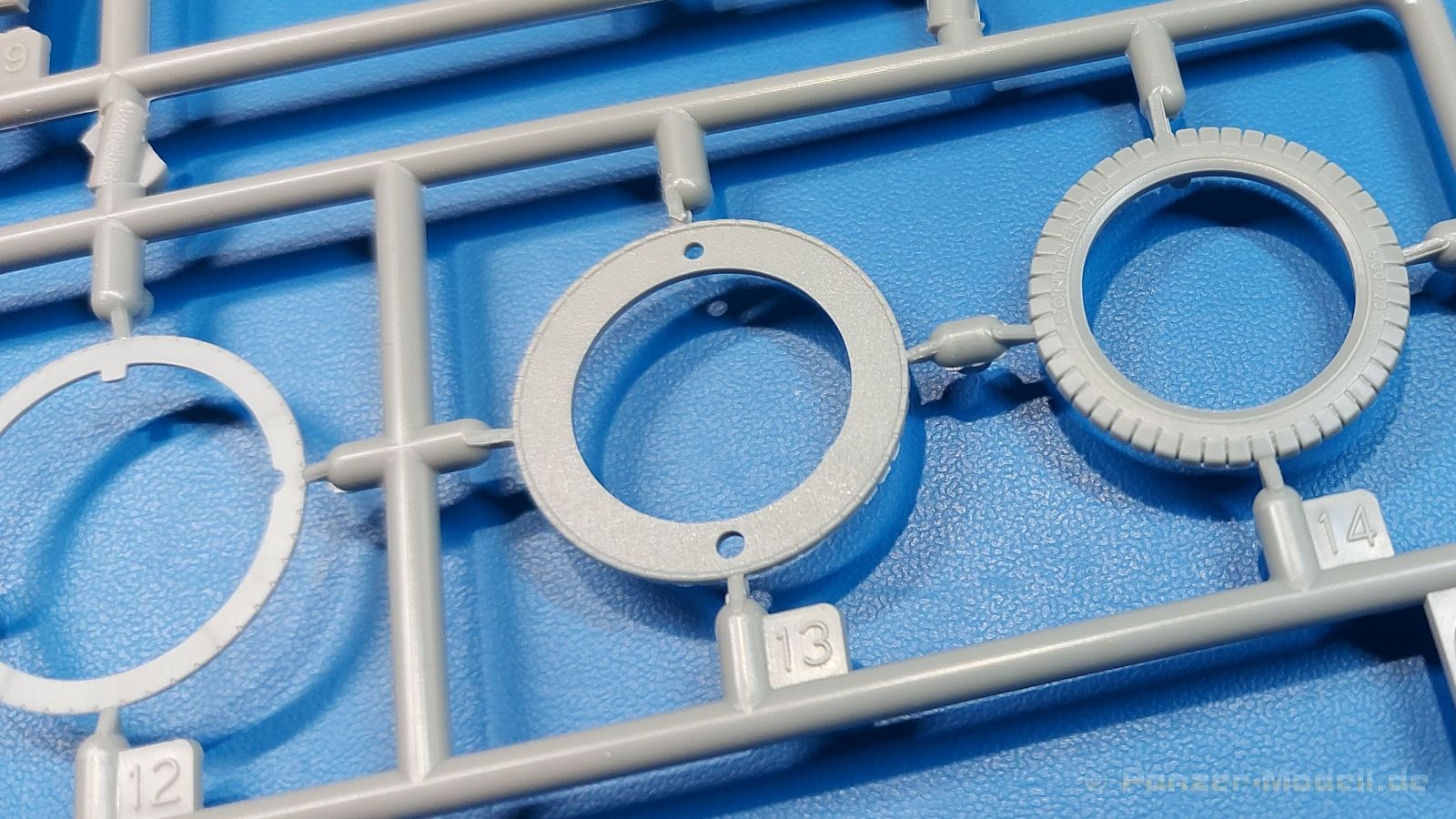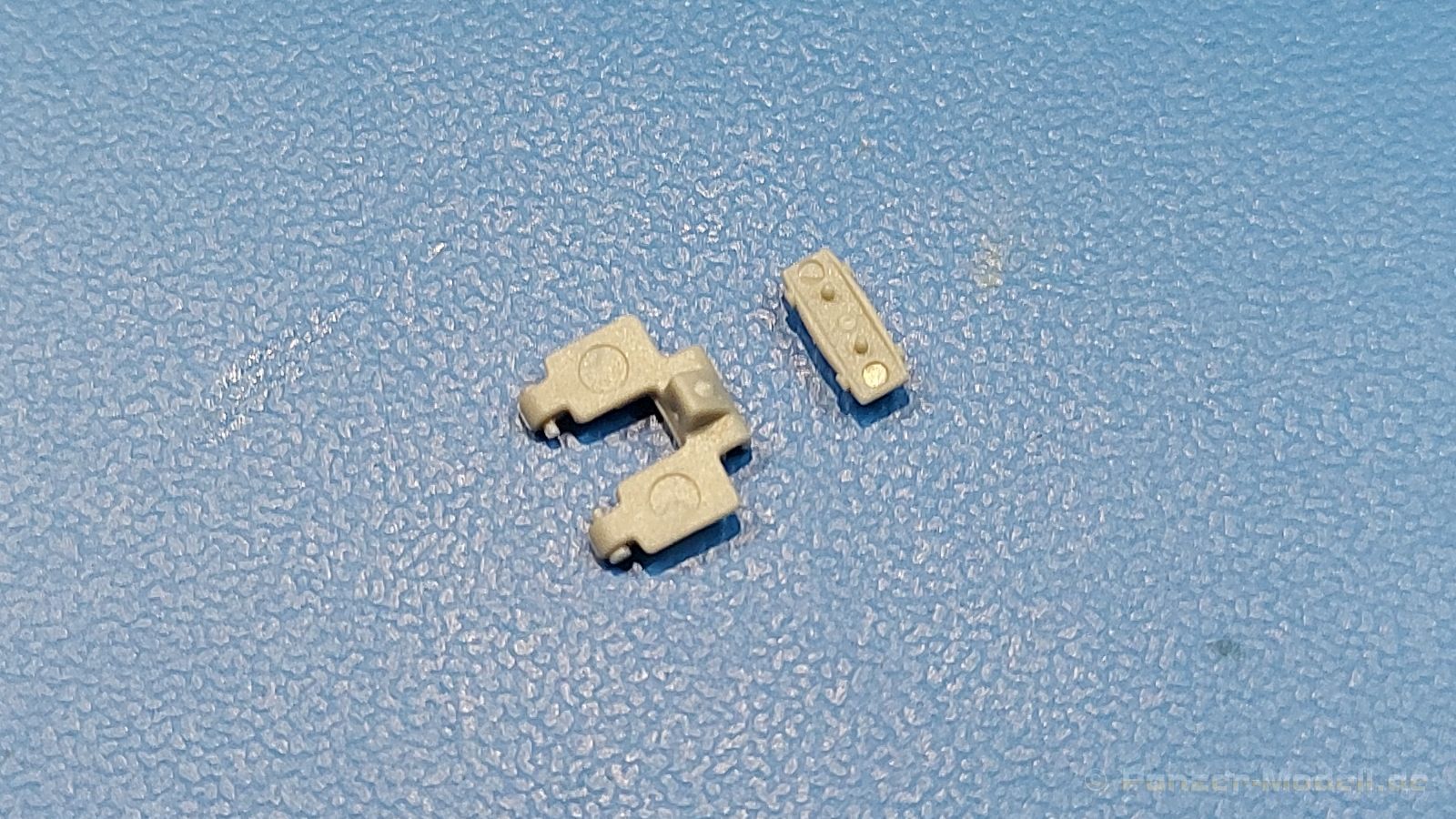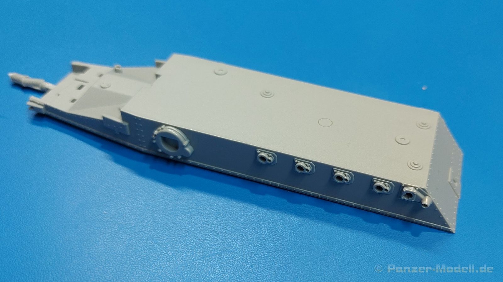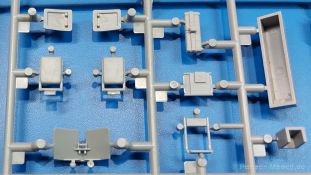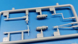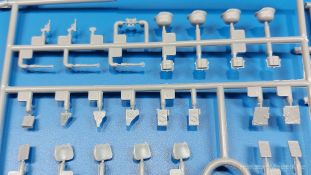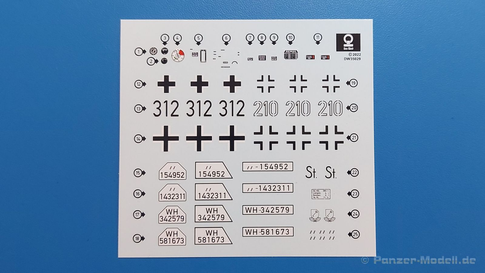 Das Original: Das Sd.Kfz. 250 war ein leichter Schützenpanzerwagen der Deutschen im 2. Weltkrieg, häufig in Panzeraufklärungs- und Kradschützenabteilungen an allen Fronten eingesetzt. Auf das Halbkettenfahrgestell des Sd.Kfz. 10 wurde ein Panzeraufbau aufgesetzt. Bei den älteren Fahrzeugen bestand der sehr verwinkelte Panzeraufbau aus 19 Panzerplatten, bei neueren Fahrzeugen war er gradlinig angeordnet und bestand nur noch aus 9 Panzerplatten. Erste Sd.Kfz. 250 kamen im Sommer 1941 zur Truppe, die neuere Form ab Juni 1943. Mit einem 100 PS Motor konnte der 5 Tonnen schwere Schützenpanzerwagen eine Geschwindigkeit bis zu 65 km/h erreichen. Die Besatzung bestand aus maximal 6 Soldaten. Je nach Einsatzzweck gab es verschiedene Varianten vom Sd.Kfz. 250/1 bis zum Sd.Kfz. 250/12. Das Sd.Kfz. 250/1 war die Schützenpanzer Version mit 6 Mann Besatzung und bis 2 MG Bewaffnung. Seltener in der Aufklärungsrolle eingesetzt, waren Sd.Kfz. 250 öfter zusammen mit Panzern im Gefecht, wobei der Kampf möglichst vom Fahrzeug aus geführt wurde. Der Bausatz: Das Werk belebt den Markt für Sd.Kfz. 250/1-neu Bausätze in Kooperation mit einem asiatischen Hersteller wieder. Der stabile Karton mit Stülpdeckel ist 390 x 255 x 85 mm groß. Darin befinden sich, in Klarsichttütchen verpackt, 10 hellgraue, 1 Klarsichtspritzling, eine Unterwanne, 1 PE-Platine, je ein Tütchen mit Kettengliedern und eines mit Kettenpolstern, 1 Decalblatt und die Bauanleitung. Die Spritzlinge sind einwandfrei, die Teile ohne Versatz oder Sinkstellen. Details sind gut herausgearbeitet. Die Klarsichtteile sind kratzer- und schlierenfrei. Für die Ketten liegt ein Tütchen mit vorgeschnittenen Einzelgliedern und eins mit Kettenpolstern bei, die man ohne weitere Arbeiten zusammenbauen kann. Nur ist etwas feiner Grat ist hier da vorhanden, der noch zu entfernen wäre. Eine Anzahl an PE-Teilen verbessert den bereits guten Detailgrad des Bausatzes. Zwar baut das Sd.Kfz. 250 auf dem Fahrgestell des Sd.Kfz. 10 auf, aber da es sich um ein gepanzertes Fahrzeug handelt, gibt es statt dem Fahrzeugrahmen eine Panzerwanne, die gleich zweimal vorhanden ist. Zum Bau dieses Fahrzeugs braucht man die Wanne Y. Die Wanne aus einem Stück zeigt uns schöne Nietenreihen, Schwingarmlager und Wartungsdeckel am Boden. Antriebsradachsen, Schwingarme, die Spannradachsen und die Kettenspanner werden separat montiert. Bei den Antriebrädern fällt die Wahl auf die je dreiteiligen Räder vom Spritzling H statt den einteiligen des A-Spritzlings. Durch die Dreiteilung kommen die Details besser hervor. Bei genauem Hinsehen erkennt man, dass die Rollenzähne etwas versetzt zu den Auflageflächen der Kettenglieder sind, was vollkommen korrekt ist für eine korrekte Auflage der Kette. Die Lauf- und Spannrollen gefallen mir gut mit ihren dreieckigen Durchbrüchen und hohlgegossenen Speichen. Die Ketten bestehen aus Kettengliedern, die ineinandergesteckt und mit den Kettenpolstern gesichert werden. Bei vorsichtiger Verwendung von Klebstoff bleibt die Kette beweglich. Glieder und Polster befinden sich einzeln in getrennten Klarsichttütchen und können fast ausschließlich ohne Nacharbeit aus der Tüte heraus verwendet werden. Die Vorderachse besteht aus dem querliegenden Blattfederpaket, jedes Federblatt gut erkennbar, der Achse mit den angegossenen Lenkachsen, Lenkgestänge und Stabilisatoren. Da die Lenkachsen angegossen sind, kann ein Lenkeinschlag nicht ohne weiteres bewerkstelligt werden. Die Vorderräder bestehen aus Felge und fünf Radscheiben, die so geformt sind, dass eine entsprechende Profiltiefe entsteht. Auf den äußeren Radscheiben sind in erhabenen Buchstaben/Ziffern Reifenangaben und Hersteller zu sehen. Wahrscheinlich aus Lizenzgründen ist der Herstellername geringfügig verfremdet, aber wenn man das U des letzten Buchstabens zu einem L abändert, kommt man der Wirklichkeit wieder näher. In der Felge ist das Ventilloch vorhanden. Wer mag, kann dort das Ventil aus heißgezogenem Plastik oder Draht für mehr Realismus selbst einsetzen. Es sind auch noch die alten Vorderräder am Spritzling vorhanden. Sie bestehen aus Felgeninnenseiten und dem Reifen mit eingegossener Außenfelge. Hier sind keine Hersteller-/Reifenangaben vorhanden. Der Innenraum hat so einiges zu bieten. Der Fahrerraumboden hat die Antriebsachsabdeckung mit Sitzunterbau bereits angegossen. Fahrer- und Funkersitz bestehen aus Sitzpolster und Rückenlehne. Die Polster sind leicht eingedrückt und wellig dargestellt, sehr glaubhaft. Die Rückenlehnen zeigen nach hin das Drahtgeflecht, auch sehr schön und gut einsehbar durch den oben offenen Kampfraum. Die Motortrennwand bekommt kampfraumseitig eine zweiteilige Kupplungsglocke mit einem Hebel, einen Elektrikkasten, einen Ersatz-Kinonblock (Panzerglas), Lenkstange mit dem Umlenkgetriebe und das Lenkrad selbst. Zwischen den Vordersitzen findet das Getriebe mit zwei Schalthebeln und einem Aufsatzpolster seinen Platz. Auf dem Kampfraumboden wird linksseitig eine Sitzbank, auch mit schönem Polster, montiert. Auf die rechte Seite kommt ein großer Schrank, leider nur mit verschlossenen Türen. Die Innenseiten des Aufbaus werden mit allerlei Ausrüstungsgegenständen ausgestattet – Feuerlöscher, Gasmaskenbüchsen, Kinonblöcken, Handgranatenhalter und Stilhandgranaten, Magazintaschen, Staukasten etc. Hier kommen die meisten Fotoätzteile (PE) zum Einsatz. Der Staukasten und seine Fahrzeughalterung bestehen komplett aus PE. Man kann die Halterung leer im Fahrzeug anbringen und Tragegurte am Kasten anbringen, um ihn dann irgendwo hinzustellen oder einer Figur (nicht enthalten) auf den Rücken zu schnallen. Auch im Aufbauoberteil findet weitere Ausrüstung wie Wasserflaschen, Kasten und Haltegriffe einen Platz. Die seitlichen Sichtblöcke sind aus Plastikmaterial, die vorderen Sichtklappen, die geöffnet oder geschlossen dargestellt werden können, aus Klarsichtmaterial, wobei die äußeren Panzerklappen eine raue Oberfläche haben, um 