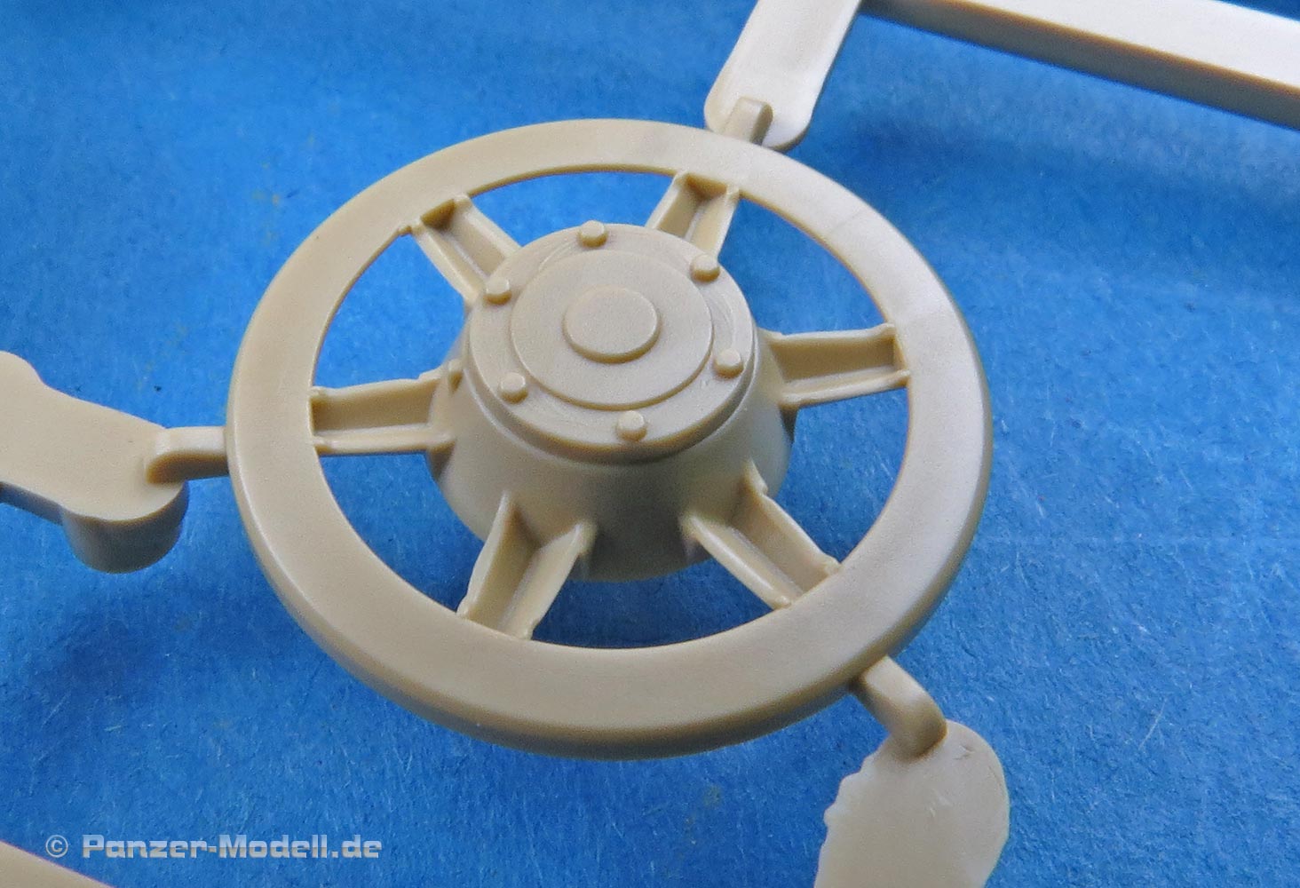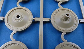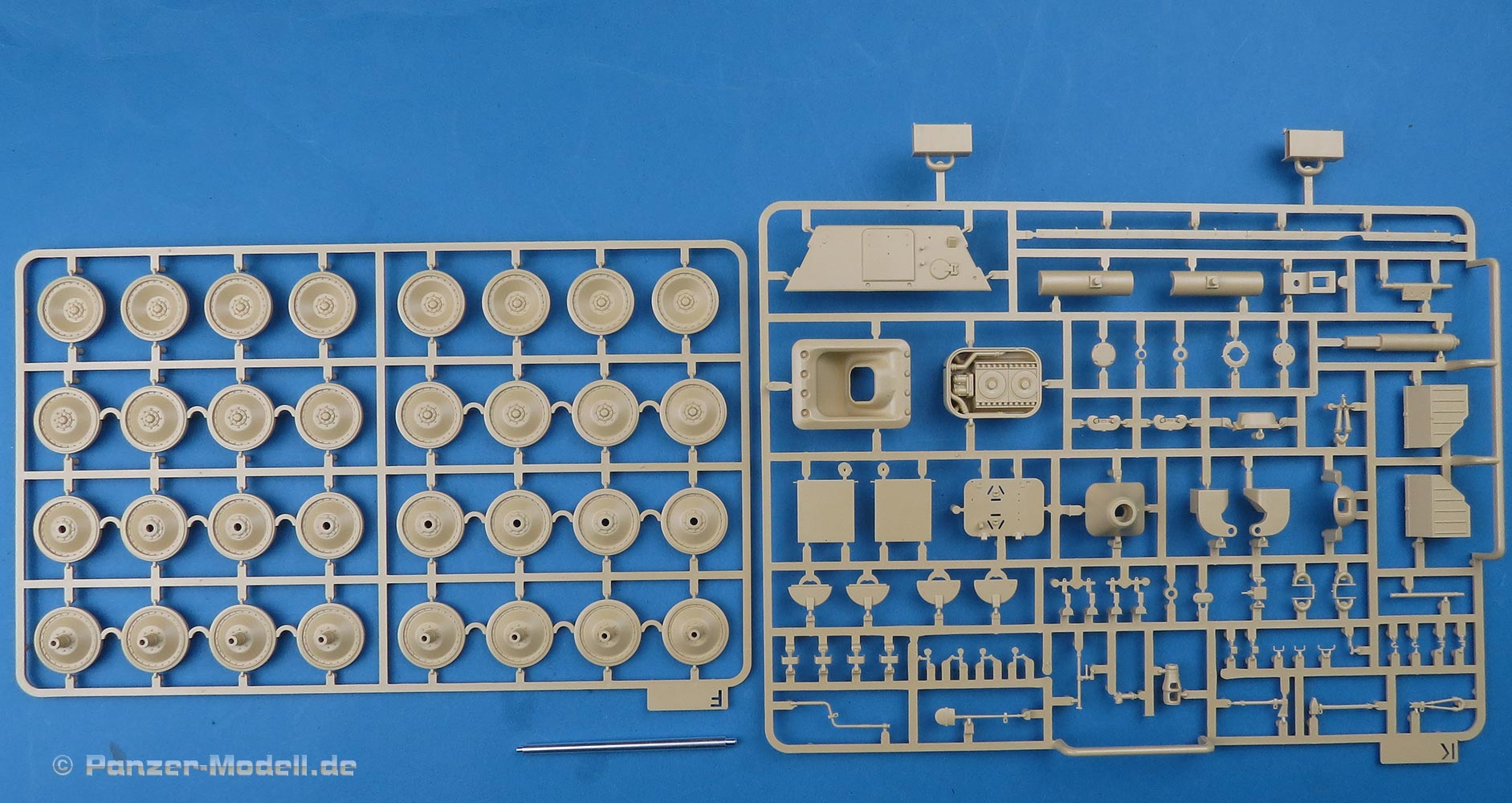 Die Unterwanne ist einteilig und hat die wichtigsten Details des Laufwerks bereits mit angespritzt. Die Laufrollen kommen in den inneren Reihen als zusammenhängende Spritzguss Teile, die dadurch mit wenigen Angüssen auskommen und mit einem Rutsch auf dem Laufwerk sind. Hier spart man eine Menge Zeit und man kommt gleich zu Anfang schnell voran, was gut für die Motivation ist. Die Details der Laufrollen können sich absolut sehen lassen, schöne, scharfe Details und Ausformung der Felgen und Gummierung. Sogar eine superfeine Beschriftung auf den Gummierungen ist zu finden!