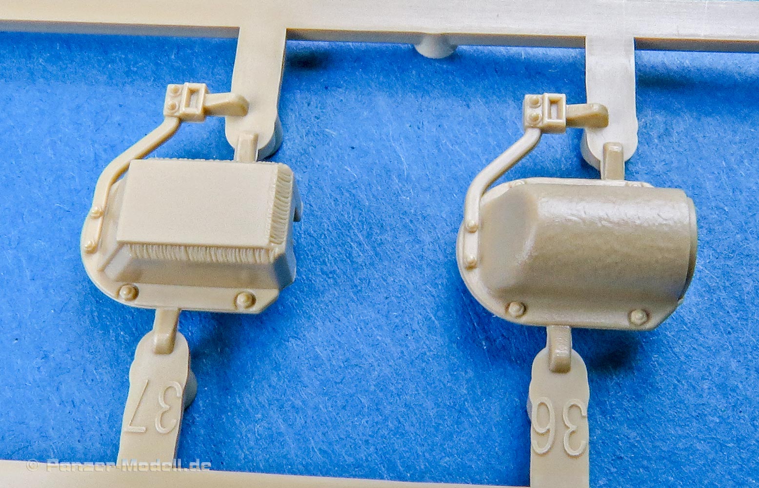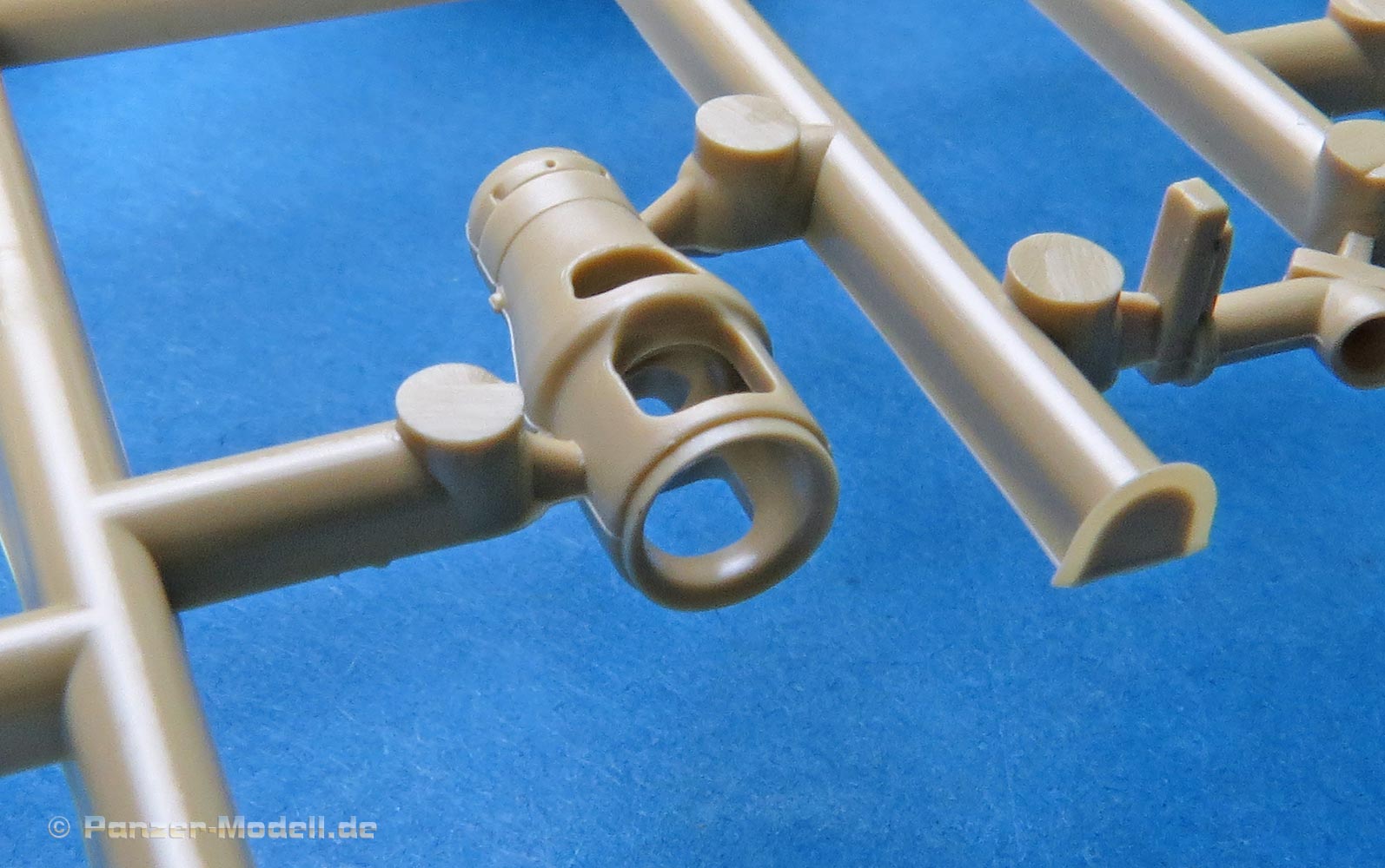 Am Wannenheck bietet der Bausatz einige erfreuliche Optionsteile - zum einen zwei unterschiedliche Auspuffbasen und die Flammvernichter in zwei Versionen. Auch die Staukästen liegen in zwei verschiedenen Versionen bei!