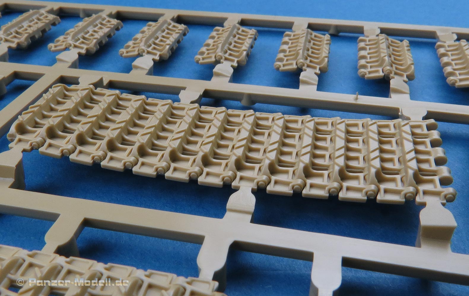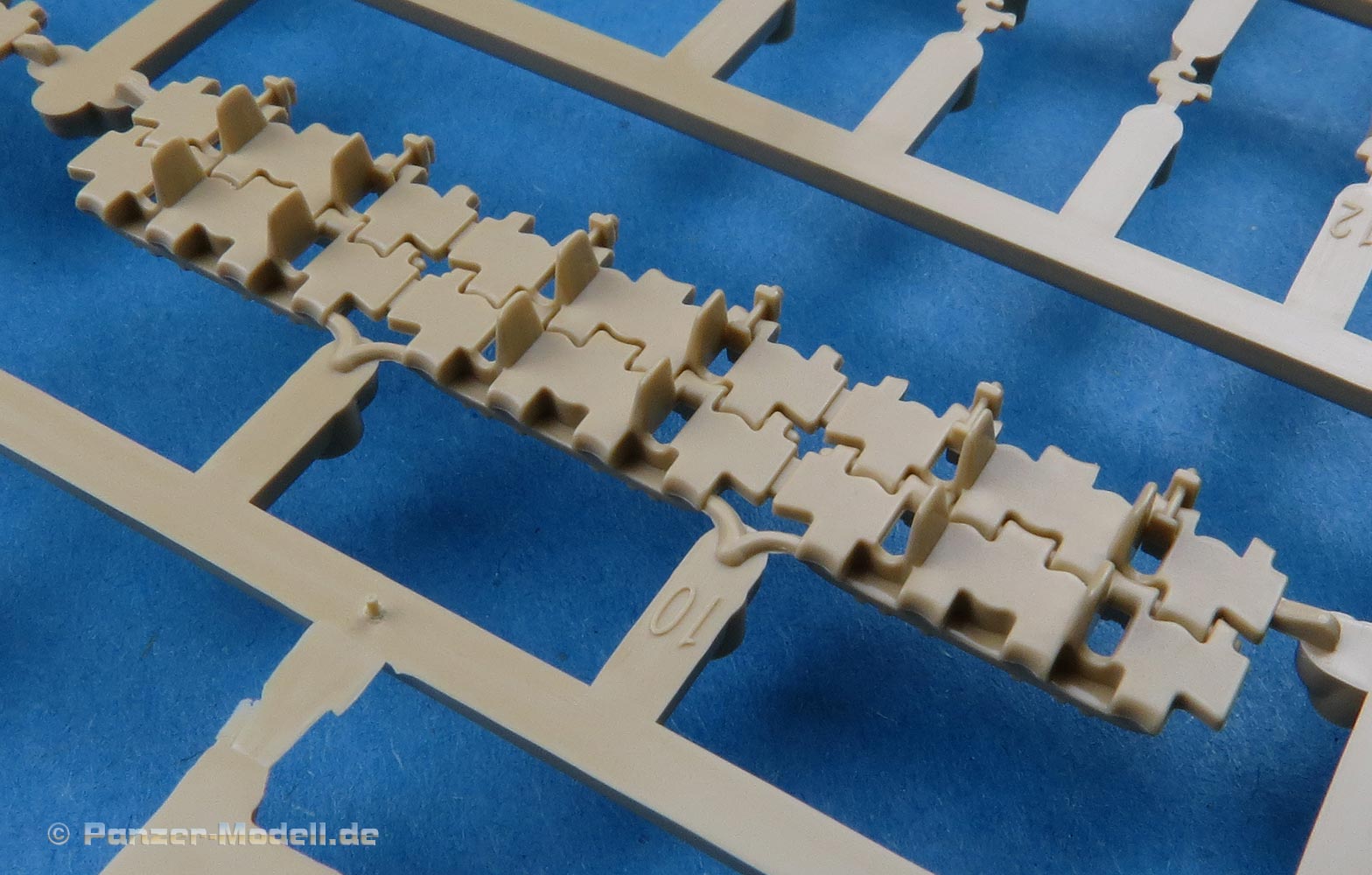 Die Kette ist eine sehr gut gemachte Segmentkette, die statt einem Haufen Einzelglieder für die Umläufe bereits passend abgewinkelte Zweierpacks behinhaltet. Alle Segmente sind je einteilig und dabei schön und sauber detailliert. Die langen Segmente sind je nach Position auch bereits mit entsprechenden "Durchhang" versehen. Sehr realistische Wirkung und damit keine Mühen für den Modellbauer. Auch höchst erfreulich, dass quasi keine Auswerfermarken zu sehen sind - das ist etwas das sonst oft bei anderen Hersteller unangenehm ins Auge fällt. Dadurch dass die Kettenteile einteilig sind mit angespritzten Führungszähnen, sind diese mit den späten, geschlossenen Zähnen dargestellt. Nicht falsch verstehen: Es gibt definitiv Panther Ketten mit geschlossenen Führungszähnen, man sieht aber wenige Originalfotos, die diese an Jagdpanthern zeigen.
