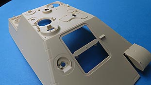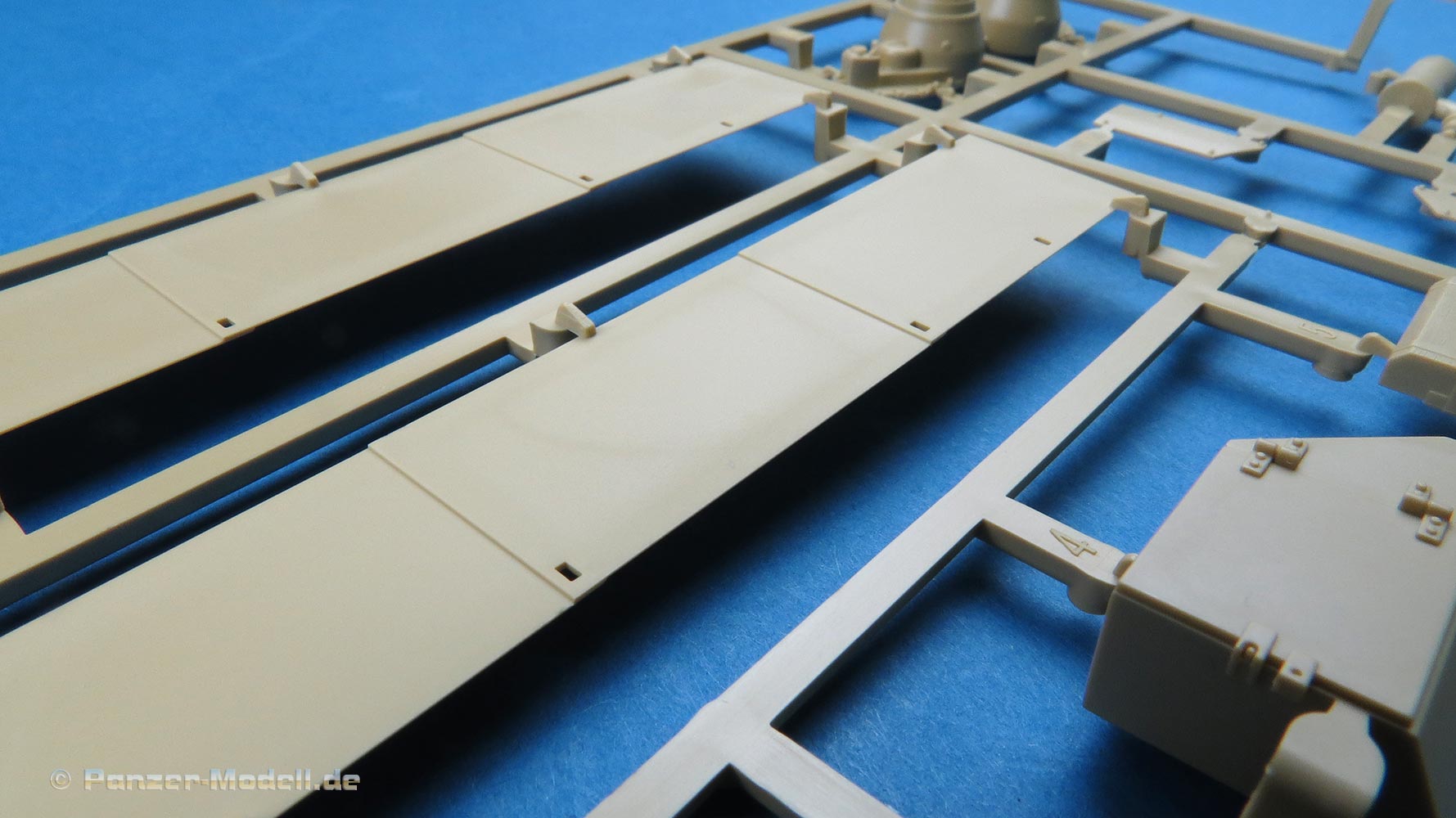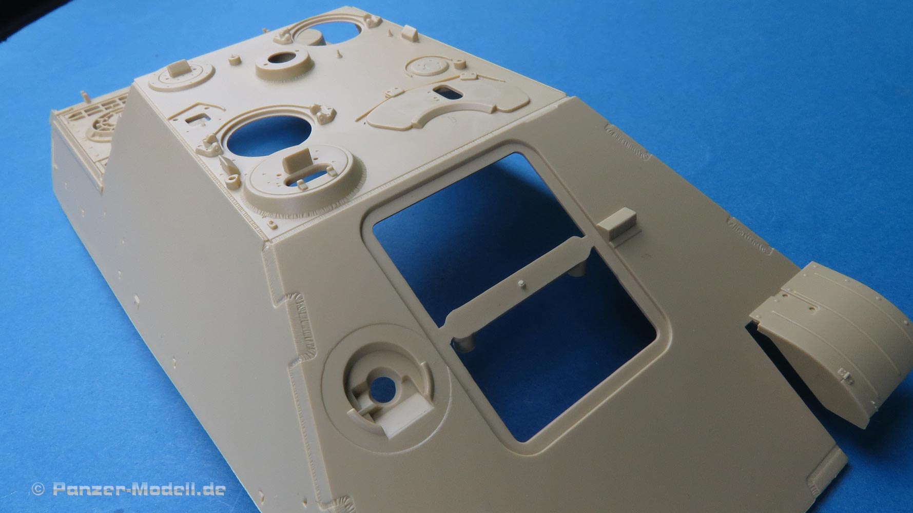Die Oberwanne ist ebenfalls einteilig mit vielen schönen Details angespritzt. Die Verzahnung und Schweißnähte der Panzerplatten vorn ist wirklich gut gelungen. Die Kampfraumrückwand ist einzeln einzusetzen zur Vervollständigung der Oberwanne. Die Heckluke it mit angespritzt und kann danher nicht offen dargestellt werden, aber da eh kein Innenraum vorhanden ist, machte s auch wenig Sinn.