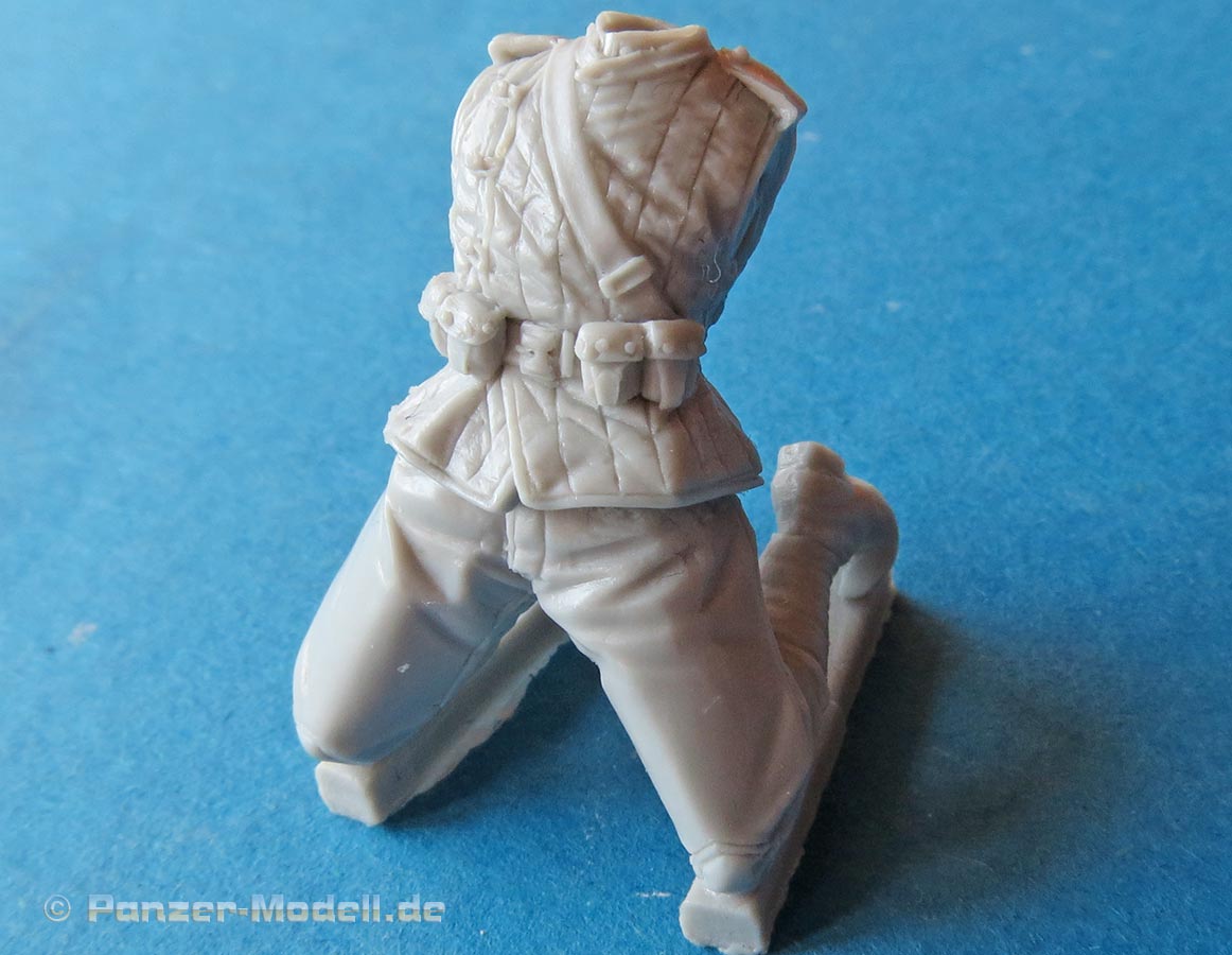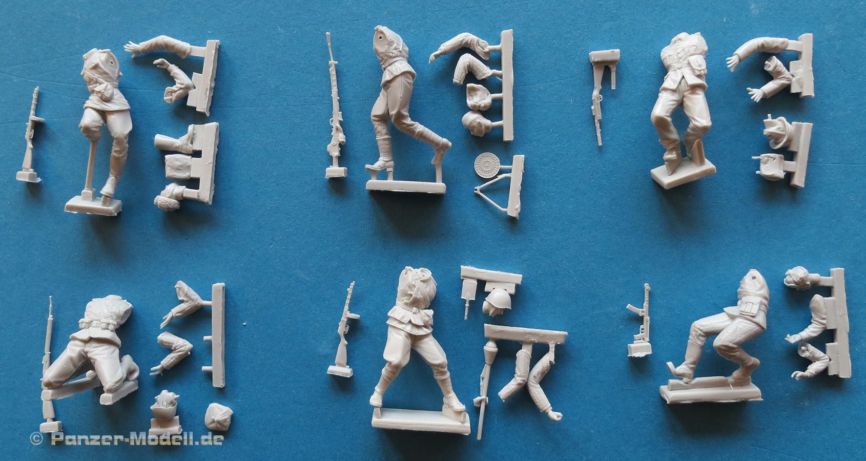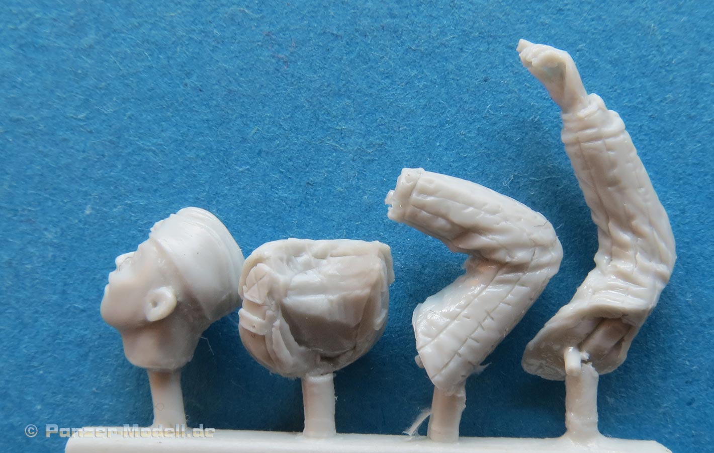 Die Figuren müssen in der Regel nur noch mit dem Kopf und beiden Armen sowie Zubehör wie Klappspaten, Taschen oder auch Waffen wie Panzerfaust, MP40, Karanbiner oder auch PPSch. Die Handwaffen sind auch sehr fein und detailliert gegossen, wobei beim Karabiner sich eine leichte Biegung feststellen lässt. In heißem Wasser sollte sich das aber wieder richten lassen.