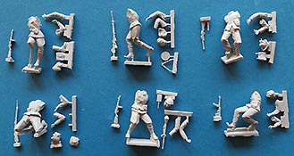 In der recht großen Schachtel finden wir 6 einzelne Tütchen die jeweils die Resinteile für die 5 russischen und einen Volkssturmmann Figuren beinhalten - diese setzen sich aus jeweils 5 bis 8 Einzelteilen zusammen - diese beinhalten unter Umsatänden auch Waffen und Zubehör.