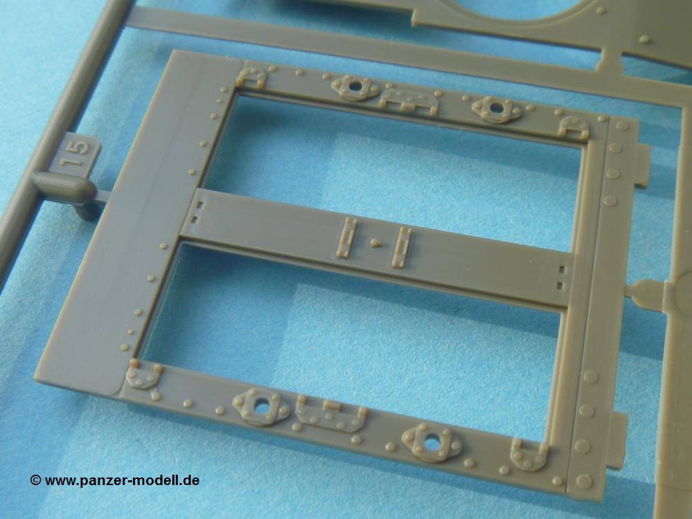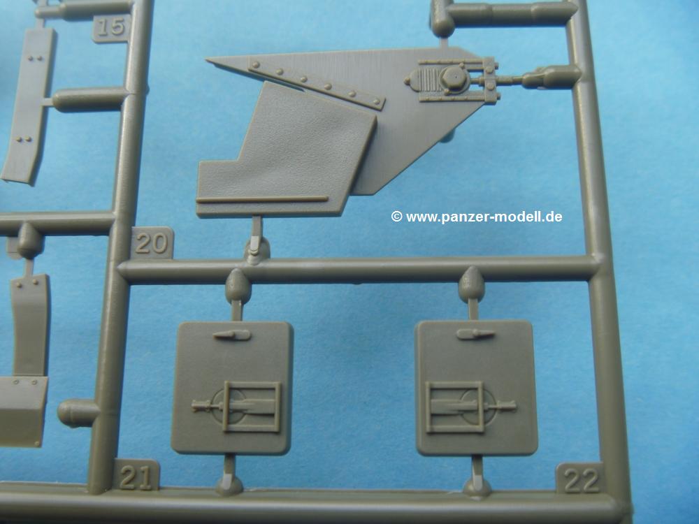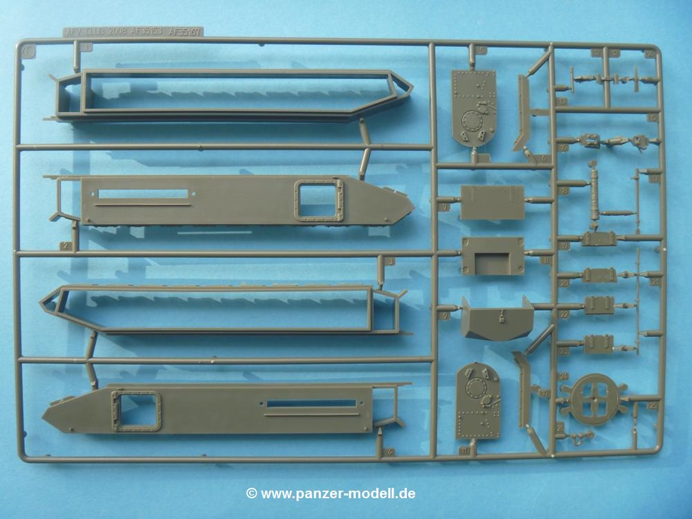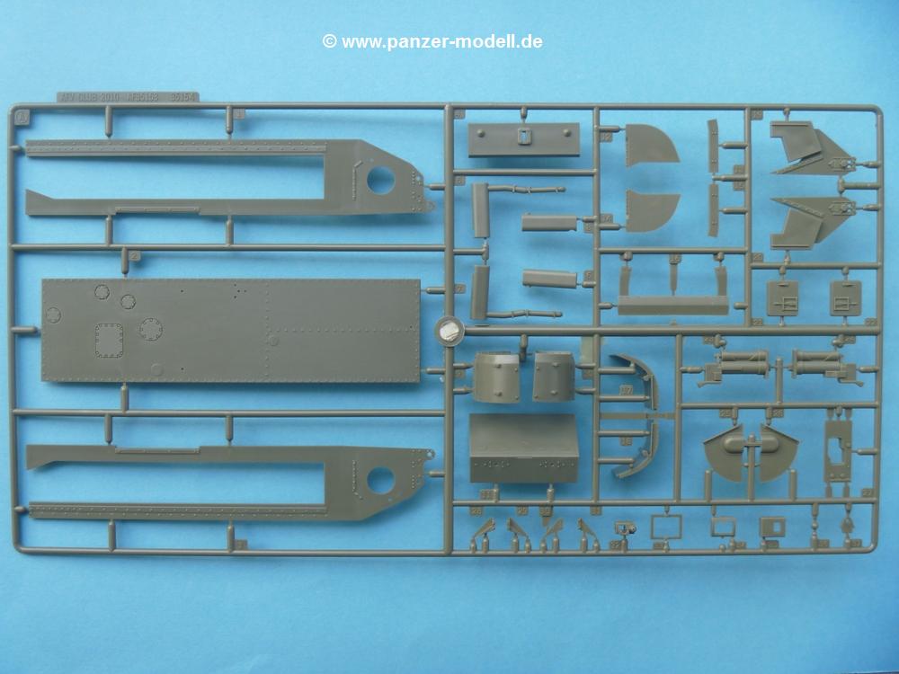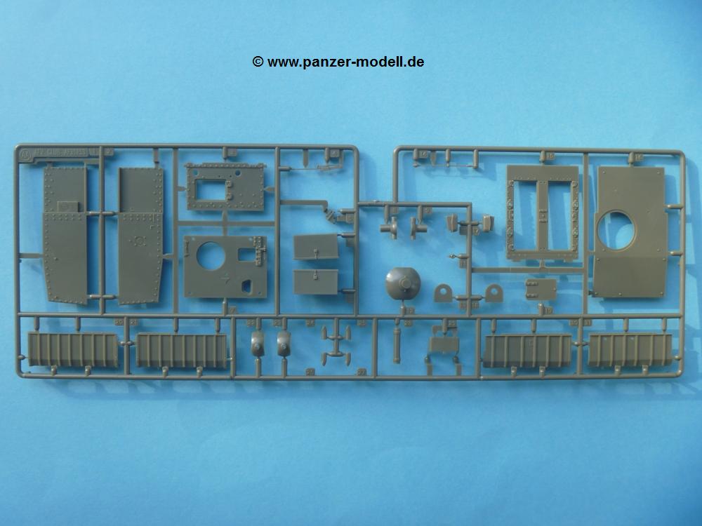- A (1x): Bodenplatte, untere Heckplatte, innere Fahrwerksseitenteile, Auspuff und -abdeckung, innere Kettenspanner, vordere/hintere Kettenbleche, Seitenluken, Kanone, Kanonenblende, Bug-MG Halterung