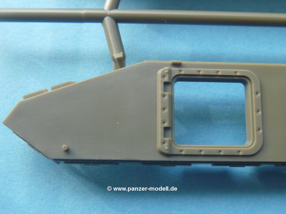 An Stelle des Turms erhält der Snake einen erhöhten kastenförmigen Aufbau. Die Öffnung für die 3 inch Kanone ist vorhanden, wird aber mit einem PE Teil verschlossen. Auch ein geändertes Motordeck kommt zum Einsatz. Die Motorraumklappen erhalten sogar auf den Innenseiten Riegel, die aber nur Sinn machen, wenn man die Klappen offen lassen könnte. Dazu müsste dann aber ein Aftermarket-Churchill Motor erst kommen, denn der Motorraum ist leer.