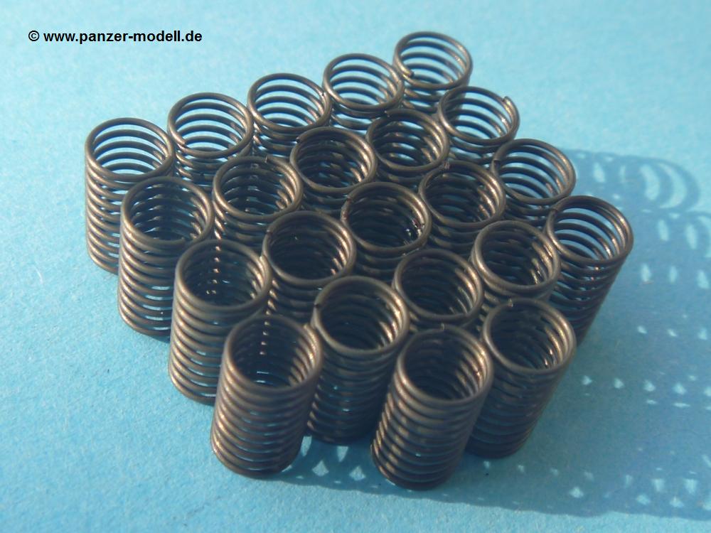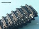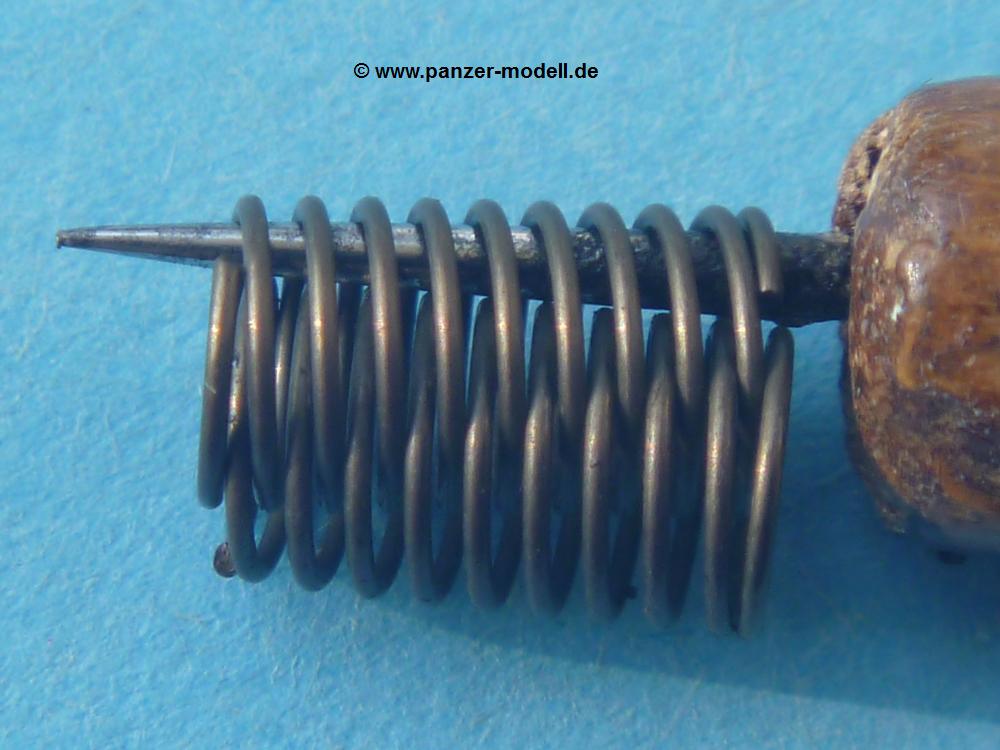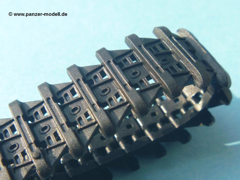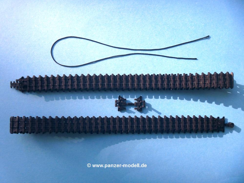 Das Fahrwerk finde ich immer wieder faszinierend. Umfangreich und komplex zu bauen, erhält man aber ein funktionierende Federung durch die metallenen Spiralfedern. Schreck am Anfang - 22 Federn sollten es sein. Ich hatte nur 11 gesehen, weil sie ineinandergeschoben waren. Mit einer Reißnadel konnte ich sie dann ohne Verbiegen trennen. Auch die Kette, obwohl aus Vinyl, verdient Beachtung, da sie sehr schön detailliert ist. Hier muss man nicht unbedingt nach Einzelgliederketten schielen.