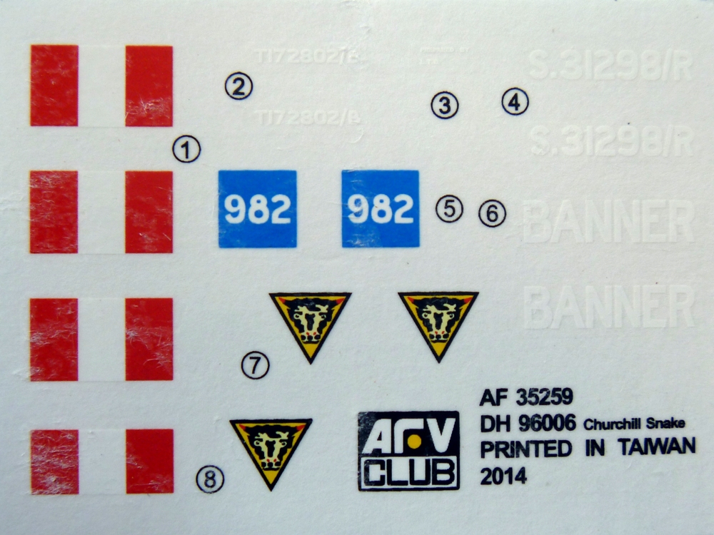 Von den Decals aus dem in Deutschland noch nicht erschienenen Bausatz AF35259 Churchill AVRE with Snake Launcher braucht man nur die Nummern S.31298/R und eine Markierung auf der Seitenschürze. Es gibt keine Angaben zur Einheit.