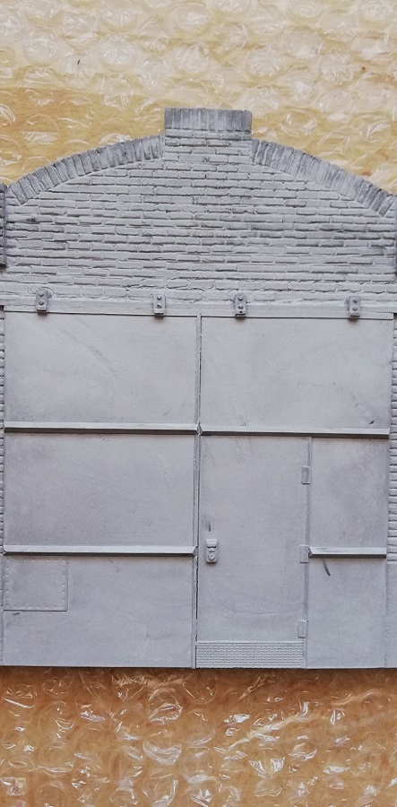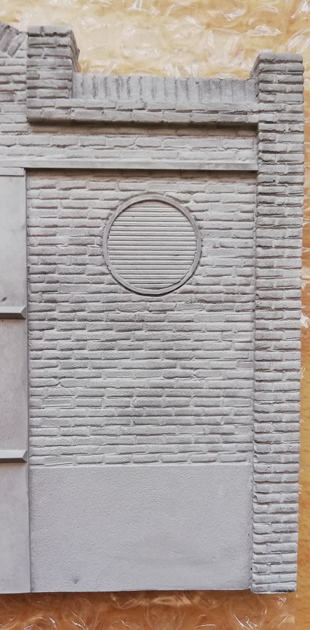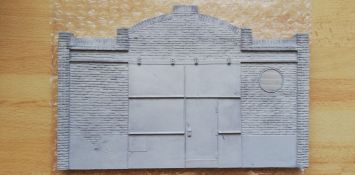diodump Industrial facade; DD049 Die Firma diodump stellt Dioramenzubehör aus Gießkeramik u.a. im Maßstab 1:35 in für uns Militärmodellbauer relevanten Epochen her. Die empfindlichen Bauteile werden in einem schlichten, aber sehr stabilen Pappkarton ausgeliefert. Ein kleines, farbliches Deckelbild verrät Inhalt und Hersteller. Das vorsichtige Öffnen des Klappdeckels offenbart zunächst Verpackungsmaterial. Dieses stabilisiert die Bauteile, so dass beim Transport ein Verrutschen kaum möglich ist. Die 3 Gießkeramikteile sind wiederum gut verpackt in Blisterfolie. Zudem finden wir einen Pappstreifen, vier Resinplättchen und einen Decalbogen sowie den Bauplan. Die Bauanleitung ist kurz und schlicht gehalten. Sie zeigt in einem Schema die einzelnen Bauteile mit Hinweisen zum Verkleben. Diese Form der Anweisung ist bei einer Fassade durchaus ausreichend. Das dominierende Bauteil ist die Front der Werkhalle mit dem zweigeteilten Schiebetor. Die Details am Tor sind fein gegossen. Die Laufrollen des Tores abgerundet, deren Halterungen mit Achsenden sowie Bolzen gut nachgebildet. Die beiden Torseiten werden verstärkt durch zwei Querbalken, die an den Enden angeschrägt sind. Die Eingangstür zeigt flache Scharniere und einen mit Riffelblech verstärkte unteren Abschluss sowie ein Vorhängeschloss. Ein nettes Detail ist eine Ausbesserung der linken Türhälfte durch ein angenietetes Blech. Die Industriegebäude wurden seinerzeit mit Ziegelsteinen gemauert und, damit die Wände nicht so eintönig waren, mit Vorsprüngen oder versetzten Steinen verziert. Dies ist alles sehr schön in der Fassade wiedergegeben und macht bereits im ungefärbten Zustand einen abwechslungsreichen Eindruck. Die Ziegel sind ebenfalls unterschiedlich gestaltet, mal beschädigt, mal glatt, mal porös. Selbst die Fugen weisen, seinerzeit als reine Handarbeit, entsprechend überstehende Reste oder kleinere Unregelmäßigkeiten auf. Der untere Teil der Front ist verputzt, wobei auch hier durch eine Abplatzung das Ganze interessanter wirkt. Wo gearbeitet wird, sollte gelüftet werden, daher wurde bei der Fassade auch an ein Lüftungsgitter gedacht, dass selbstverständlich nicht plan im Rahmen hängt, sondern etwas verkantet ist. Die Fassade wird mit den vier Resinteilen komplettiert, denn mit diesen werden die Halbsäulen an den beiden Ecken der Fassade bzw. jeweils neben dem Bogen oberhalb des Tores abgedeckt. Die beiden Seitenteile machen ebenfalls einen schön detaillierten Eindruck. Und nein, sie sind nicht identisch, sondern individuell ausgestaltet. Dies gilt sowohl für die Ziegel als auch für den verputzten Bereich, der auf einer Seite wieder beschädigt ist. Die Rückseiten der drei Gußkeramikteile sind unbearbeitet. Das angedeutete Wellblechdach liegt als Pappe bei. Das Dach sitzt auf den beiden seitlichen Elementen und ist dem Halbrund der Fassade nachzuführen. Hierbei helfen Prägungen in der Pappe, damit die Biegung passgenau nachvollzogen werden kann. Das Dach ist, als weiteres Detail, an einigen Stellen leicht eingedellt. Dem Bausatz liegen vier Decals bei. Man weiß demnach auf Deutsch und Russisch, dass es sich um eine „Produktionshalle“ bzw. russische "Gießerei" handelt und „Rauchen verboten“ ist. Mein Fazit: Für einen Preis von knapp 23 Euro erhält man eine schön geprägte Werksfassade, um beispielsweise davor einen der vielen Panzerprototypen, die aktuell am Markt, sind zu platzieren. An den Details konnte ich die Liebe des Herstellers zu seinem Produkt förmlich spüren. Für mich verdient diodump mehr Aufmerksamkeit. Seine interessante Produktpalette ist leider nur via Internet oder auf größeren Messen zu erwerben.