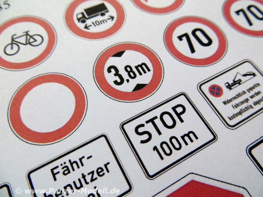 Die Auswahl der Schilder ist sehr gut und lässt dem Modellbauer viele Möglichkeiten. Vorfahrtsstraßen, wie auch Stoppschilder sind enthalten wie Geschwindigkeitsbegrenzung 70, Überholtverbot, Aufhebungszeichen, Halteverbote, Durchfahrtsverbote, usw.