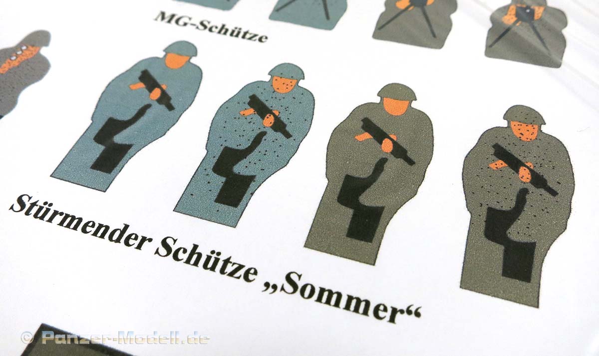 Insgesamt sind 21 Schießscheiben enthalten von 5 verschiedenen "Kameraden", wie den liegenden Schützen, den MG Schützen, den knieenden Schützen und jeweils stürmende Schützen Sonner und Winter - wobei mir die Winterversion nie untergekommen ist.