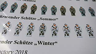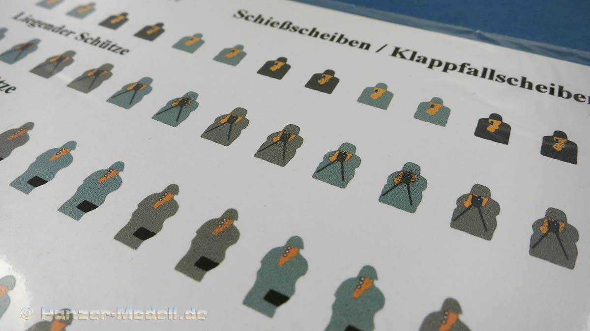 Insgesamt sind 74 Schießscheiben enthalten von 5 verschiedenen "Kameraden", wie den liegenden Schützen, den MG Schützen, den knieenden Schützen und jeweils stürmende Schützen Sonner und Winter - wobei mir die Winterversion nie untergekommen ist.