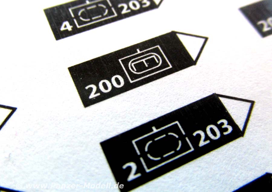 Insgesamt sind 135 Schilder auf diesem Bogen abgedruckt. Darunter die Abzeichen z.B. Stab PzBrig.21, LogBtl.7, PzBtl.203, PzGrenBtl.212, PzPioKp.200, PzArtBtl.215, AufklKp.210, InstKp.210. Für die einzelnen Bataillone sind entsprechende Schilder der einzelnen Kompanien natürlich ebenfalls enthalten.