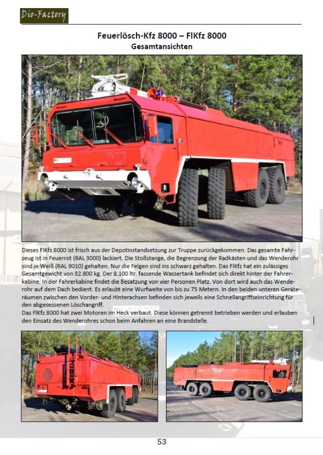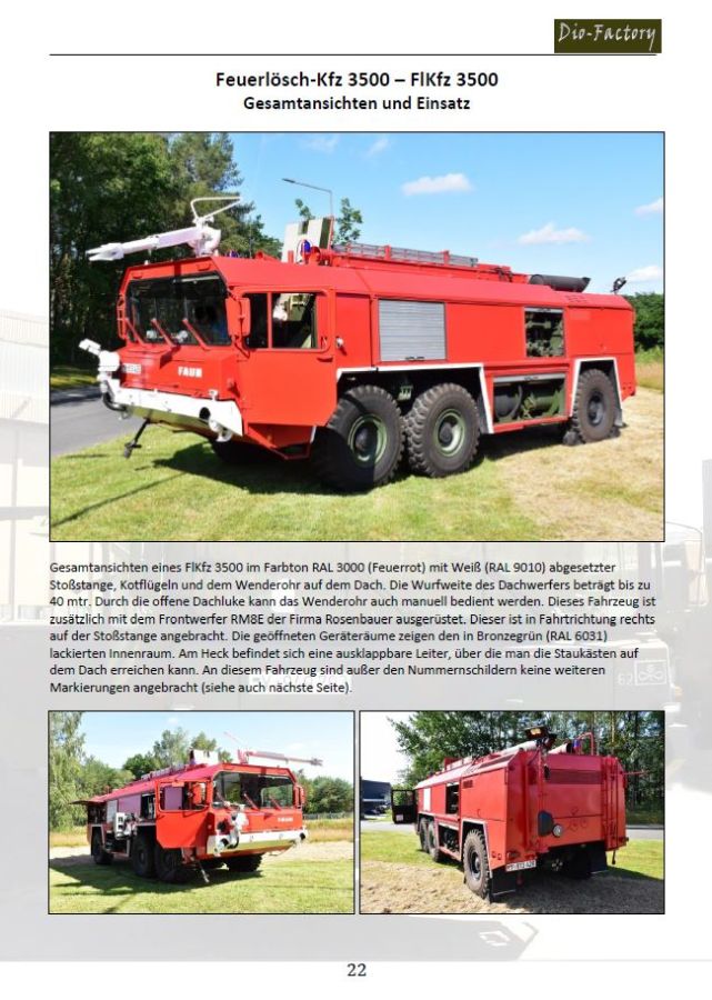 Dio-Factory ist ja bereits bekannt durch sein Diorama-Zubehör und Foto-CDs, speziell auf das Thema Bundeswehr zugeschnitten. Vor einer Weile startete die WalkAround Serie und heute halte ich das zweite Heft in der Hand. Wie schon das erste, geht es nicht um Fahrzeuge „von der Stange“, sondern um ein paar besondere - die Faun Feuerlösch-Kfz 3000 (2-achsig), 3500 (3-achsig) und 8000 (4-achsig), die von der Bundeswehr als Flugfeldlöschfahrzeuge eingesetzt wurden, bzw. noch werden. Als WalkAround erwartet man viele Bilder und das 82-seitige Heft im A4-Format enttäuscht nicht. Es gibt viel auf die Augen - 323 Bilder, die, bis auf 4 Aufnahmen von Vorserienfahrzeugen, durchweg farbig und meist auch gestochen scharf sind. Auch wenn die Bilder für sich sprechen, gibt es reichlich Erklärungen dazu. Die Themenblöcke sind, soweit möglich, für jedes Fahrzeug gleich gehalten, so dass man die Typen auch miteinander vergleichen kann. Die Überschriften geben da Auskunft: · Einleitung Faun Feuerlösch-Kraftfahrzeug (FlKfz) FlKfz 3000 - FlKfz 3500 - FlKfz 8000 Die Einleitung gibt Auskunft über den Fahrzeughersteller, warum man eine 2. Generation Feuerlöschfahrzeuge brauchte und einen Ausblick auf die 3. Generation. Es wird auch kurz auf die Unterstützungsfahrzeuge wie Einsatzleitfahrzeug und Unimog mit Pilotenrettungsbühne eingegangen. Für jedes der drei Fl.Kfz gibt es eine Beschreibung, unterstützt von einer Seitenansichtszeichnung und einem Datenblatt mit technischen Daten. Technik und Einsatz und Gesamtansichten und Einsatz zeigen sehr schöne Ausnahmen der Fahrzeuge in Gänze. Interessant dabei ist auch die Farbgebung, die von einfarbiger Tarnfarbe über NATO-3-Farb- und Afghanistan-Tarnung bis hin zum Feuerwehr-Rot geht. Dabei ist von frisch lackiert bis hin zum verblichenen Lack alles dabei. Mich hat es fasziniert zu sehen, dass die feuerwehrroten Fahrzeuge am Rahmen und im Innenraum dennoch das militärische Grün tragen. Die Detailansichten gehen weit ins Eingemachte und zeigen nicht nur einen Blick auf die Armaturen im Fahrerhaus, sondern auch hinter fast jede Klappe und auf die verwendete Löschausrüstung. Die Ausbildungsfahrzeuge, die erstaunlicherweise doch sehr von den Einsatzfahrzeugen abweichen, beschließen das Heft. Für mich ein Heft mit Wow-Faktor. Sicherlich interessant nicht nur für technisch interessierte und Feuerwehrleute! Die Fahrzeuge in ihren kantigen Ansichten machen schon echt was her, die Präsentation im Heft in der Mischung aus Fotos und Erklärungen ist toll. Modellbauer im kleinen Maßstab finden hier klasse Vorlagen zur Bemalung und Scratch-Modellbauer haben massig Material, um solch ein Fahrzeug auf die Räder zu stellen. Möge sich noch ein Hersteller finden, der die Fahrzeuge auch im größeren Maßstab auf den Markt bringt, damit man alles umsetzen kann, was das Heft schon anbietet. Ich bin schon gespannt, was uns dann als nächstes WalkAround angeboten wird. Der Preis beträgt EUR 17,95 (zzgl. Versandkosten) direkt ab Dio-Factory. Vielen Dank an Sven Eckelkamp für die Zusendung des Musters!