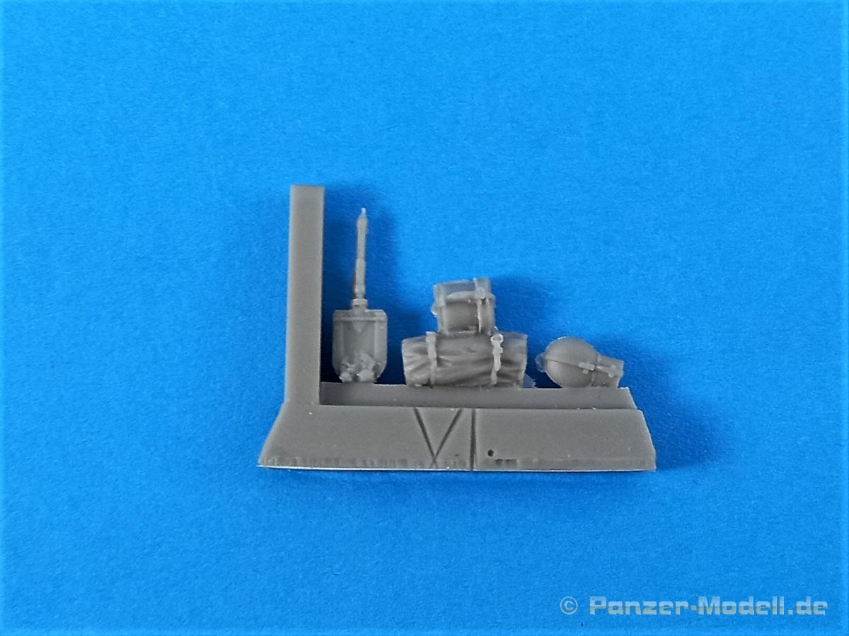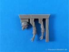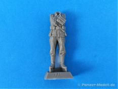 Die kleine Schüttbox (5x4x7 cm) beinhaltet insgesamt 8 Teile aus hellgrauem, blasenfreiem Resin für den Bau des Schützen. Das Resin ist relativ hart und etwas spröde. Die Figur gibt sich in einer legeren und entspannten Pose. Der Körper ist in einem Stück wiedergegeben. Mit angegossen ist eine Handgranate im Koppel, der Brotbeutel und die Tasche für Gasschutzmittel. Kopf, Arme und restliche Ausrüstungsgegenstände müssen noch montiert werden. Der Faltenwurd der Uniform ist realitätsnah dargestellt und passend zur Haltung. Die angegossene Koppeltragehilfe gefällt. Der Kopf mit Stahlhelm ist ebenfalls gut modelliert. Sehr schön dargestellt auch der Kinnriemen des Helms. Vorhandenen Fischhäute dürften leicht zu beseitigen sein. Einige Details wirken etwas verwaschen, eine höhere Schärfe wäre wünschenwert. Die Angüsse der Teile sind ziemlich massiv, ich hätte mir kleinere Angüsse gewünscht, gerade auch beim Kopf. Nicht überzeugen kann mich das Koppelschloß das sehr schwammig bzw. nicht ausgeprägt ist. Größtes Manko ist allerdings auch bei dieser Figuer das Fehlen der Seitentaschen. Diese sind zwar vorhanden, sitzen aber viel zu weit hinten und liegen im nicht sichtbaren Bereich. Die Nähte die zur Knopfleiste zeigen sind im Orginal fast senkrecht unter denen der Brusttaschen. Somit sind die Taschen im sichtbaren Bereich. Der Karabiner ist recht fein gegossen, könnte aber im Detail mehr Schärfe aufweisen. Laut Hersteller wird die Figur der 71. Infanteriedivision (1939 1943) zugeschrieben. Auf der Herstellerseite (www.dennisminiaturesdesign.de) ist Schütze Gustav fertig gebaut und bemalt zu sehen.