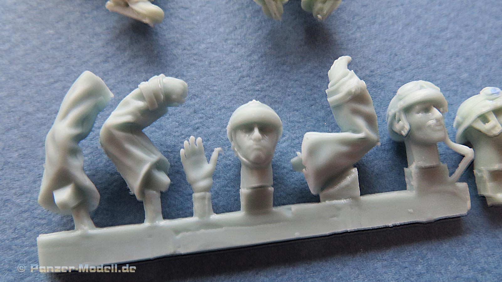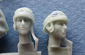 Auch die Köpfe sind recht schön gemacht - für die eine Figur liegen sogar zwei verschiedene Köpfe zur Auswahl bei. Die Gesichter sind gut gemacht und mit individuellem Ausdruck. Die Kopfbedeckungen sind die typischen französischen Helme der Panzertruppe.