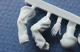 Die Figuren sind relativ komplett gegossen und es müssen nur Arme und Köpfe angeklebt werden. Für die Arme sind quadratische Öffnungen und Stöpfel zur Verbindung eingegossen - dadurch gibt es eine perfekte Passung.