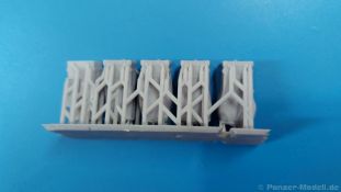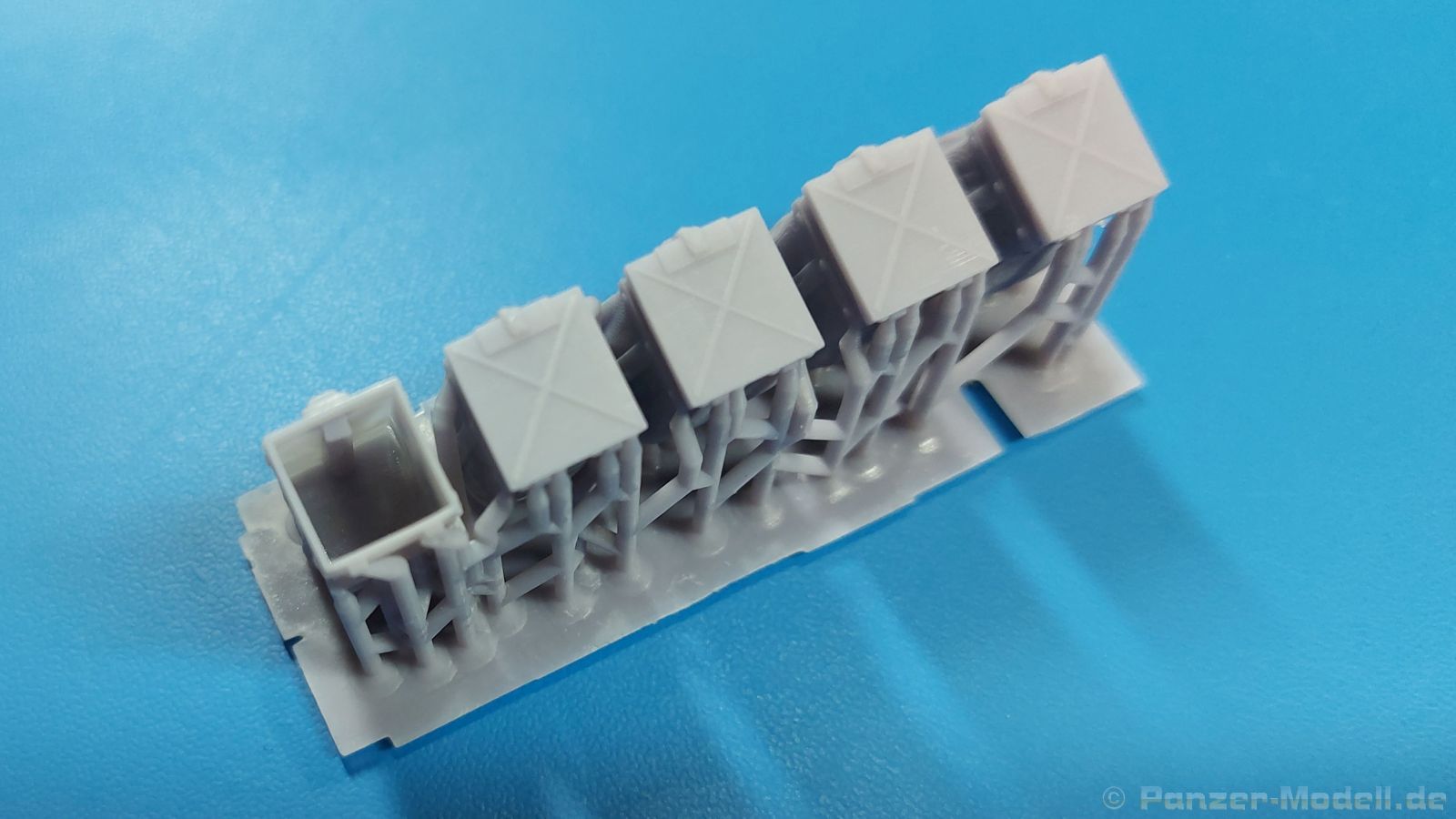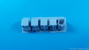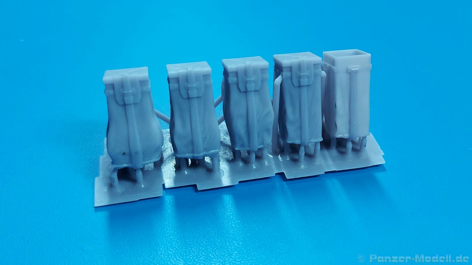 MG-34 ammo bags - “Gurtsack” Heute schauen wir uns aus der 3D-Druckreihe von FC Model Trend ein paar Gurtsäcke für MG im Maßstab 1:16 an. Die fünf Säcke befinden sich in einer 105x60x35 mm großen Blisterverpackung. Die Säcke befinden sich auf einer Druckbasis. Die Stützstrukturen befinden sich an der Unter- und Rückseite und verjüngen sich zu minimalen Angüssen an den Teilen, was ein erleichtertes Abtrennen und nur minimale Versäuberungsarbeiten mit sich bringt. Kein Sack gleicht dem anderen. Sie sind unterschiedlich ausgebeult und stellen damit verschiedene Beladungszustände dar. Auch unterscheiden sie sich im schönen Faltenwurf. Vier Säcke sind mit einem Deckel geschlossen. Details wie die gekreuzten Versteifungsrippen auf den Deckeln, genietete Sackrahmen, Verstärkungs- und Verschlussgurte und -riegel wissen zu gefallen. Einer der Säcke ist ohne Deckel und hohl gedruckt. Dort befinden sich an den Kanten kleine Löcher und ein langer Riss, die ich für einen Fehldruck halte, aber die man sicherlich auch als Abnutzungserscheinungen für einen viel benutzten Sack durchgehen lassen kann. Im Zweifelsfall kann man mit ein wenig Spachtelmasse die Löcher auch verschließen. Es gibt keine Empfehlung für ein bestimmtes Modell. Ich sehe eine mögliche Verwendung für deutsche Panzer, die ein MG-34 als Fla-MG an der Kommandantenkuppel haben (späte Panzer IV, Panther, Tiger). Eine Bau- und Bemalungsanleitung ist nicht vorhanden. Hier ist Selbsthilfe gefragt. Ein schönes Detail, das die Blicke auf sich ziehen wird.