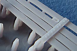 Das Konstrukt mit den Stützstreben sieht schon recht fragil aus und aufgrund der schrägen Anordnung hat man erst den Eindruck, dass es sich um einen Fehldruck handelt, aber erstmal abgetrennt, stehen die Bänke absolut gerade. Man muss nuir höllisch aufpassen, beim Versäubern nichts abzubrechen und auch die dünnen Streben herauszutrennen und sauber in Position zu kleben. Der Hersteller empfiehlt ggf. die Teile in heißes Wasser zu legen um das Resin etwas weicher zu machen, damit es nicht so schnell bricht.