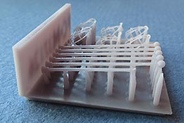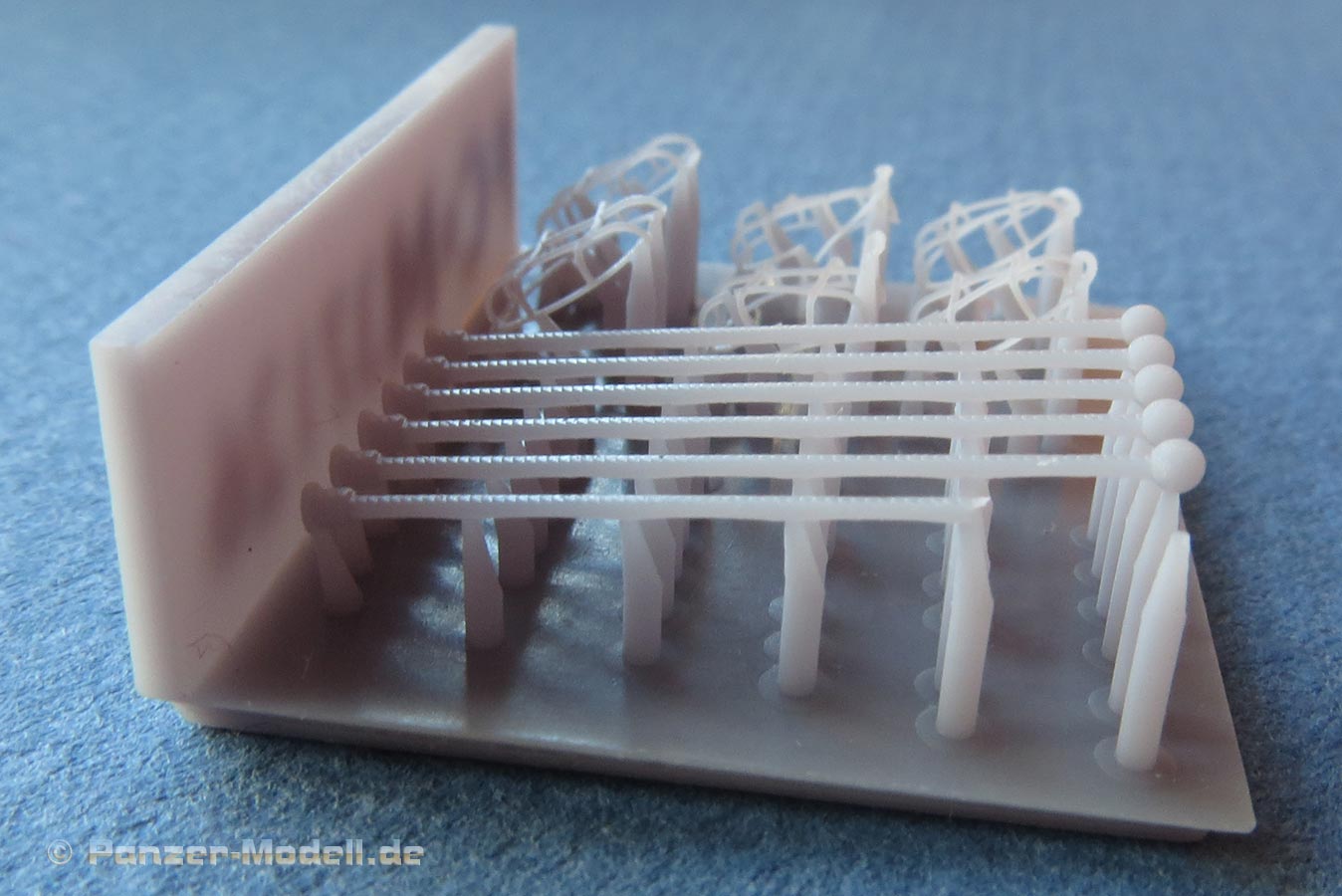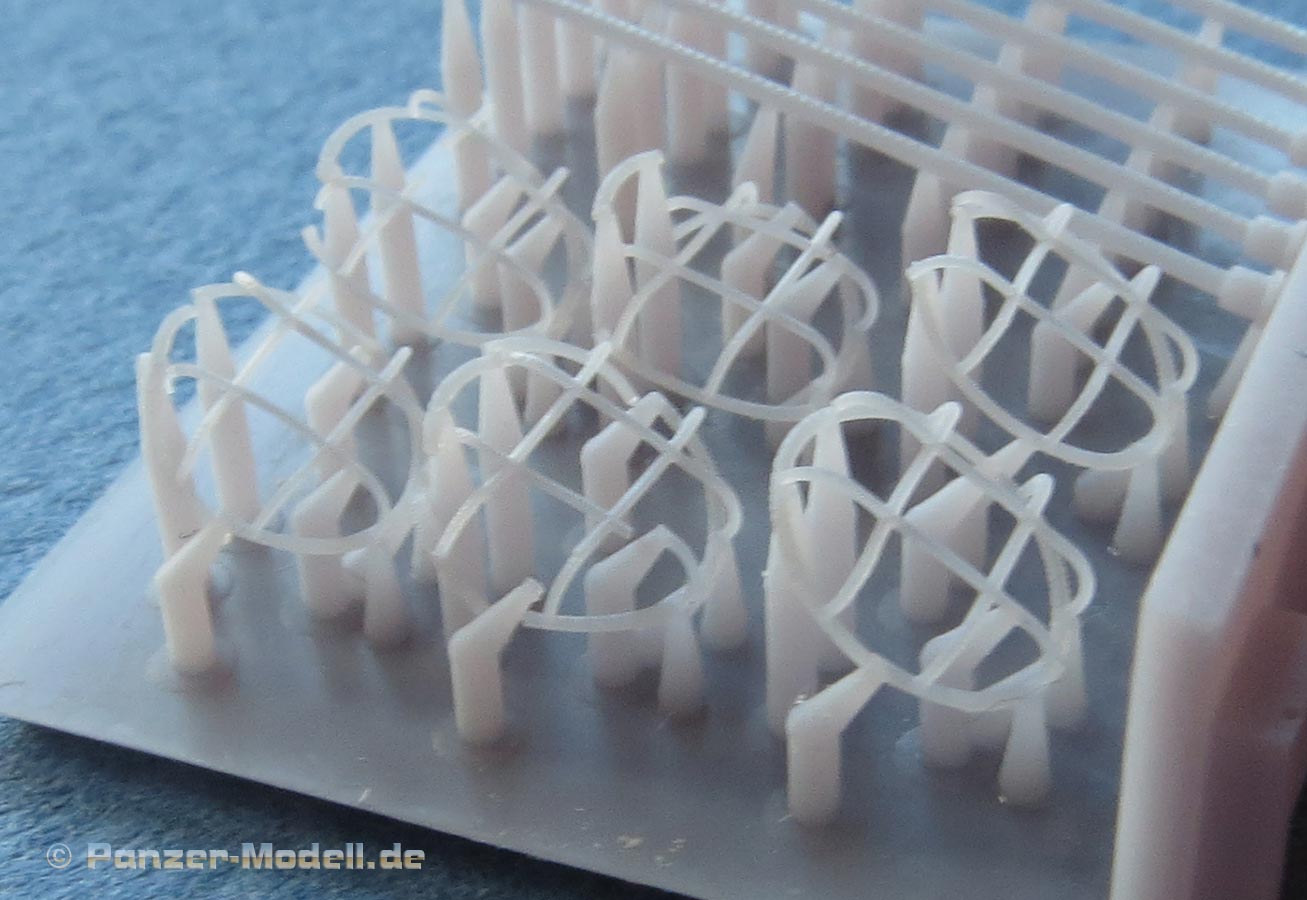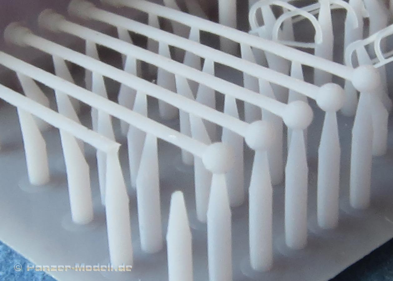 Auf der Grund-Druckplatte finden wir 6 sehr fein gedruckte Schutzgitte und ebenfalls 6 Peilstangen als 3D Druckteile. Damit hat man genug Bauteile für 3 Unimogs oder genug um ausreichend zu probieren diese extrem dünnen und filigranen Teile bruchfrei abzutrennen, zu versäubern und am Modell zu befestigen. Laut Hersteller empfiehlt es sich die 3D Durckteile in heißem Wasser etwas geschmeidiger zu machen, denn ansonsten ist das Druckresin etwas brüchig. Man sieht in dem vorliegen Vorabmuster schon diverse Beschädigungen - man muss hier also wirklich viel geduld und gutes Werkzeug haben.
