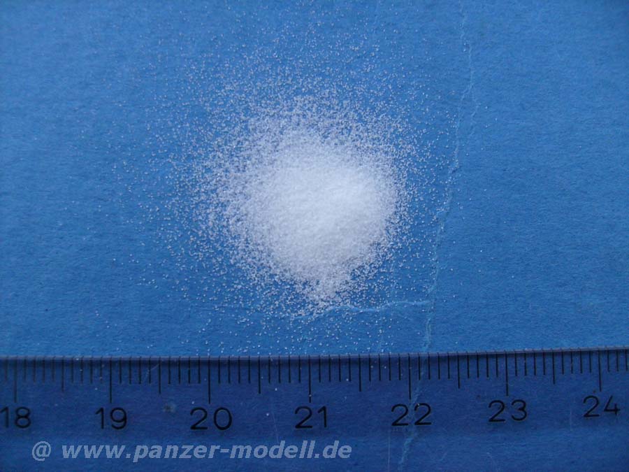 Der grobe Schnee ist ein feines, mineralisches Streu, das als Schnee für Maßstäbe um 1/35 ideal geeignet ist. Die Körnigkeit ist gerade beim trockenen Aufstreuen sichtbar und vermehrter Glitzereffekt sichtbar.