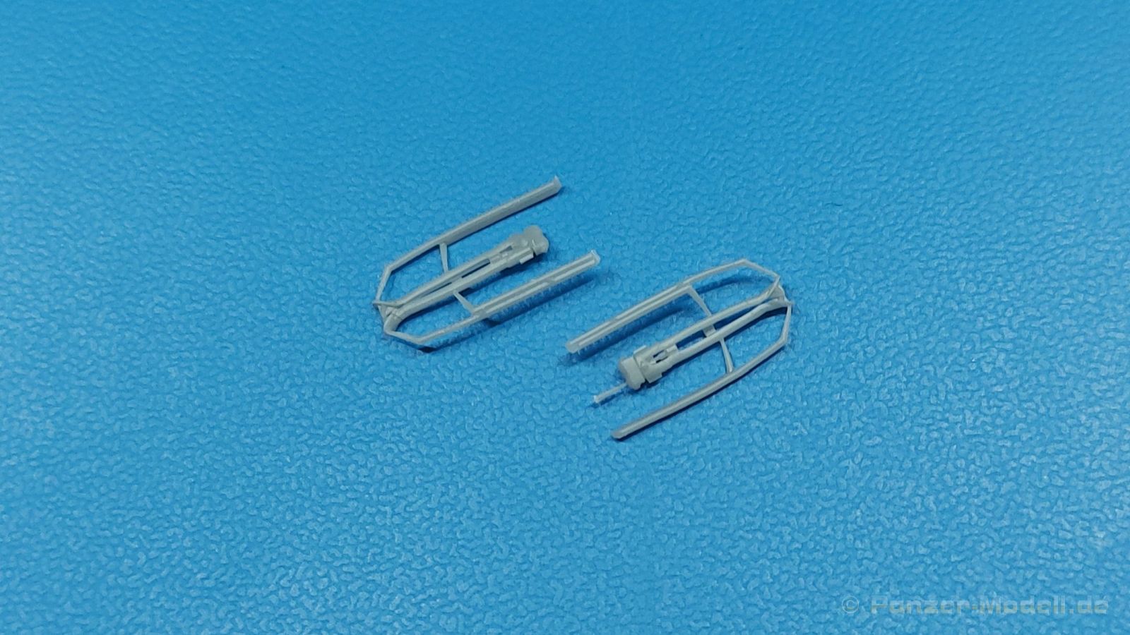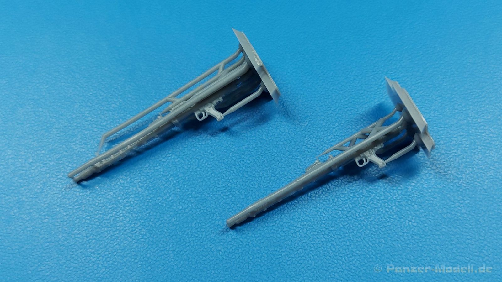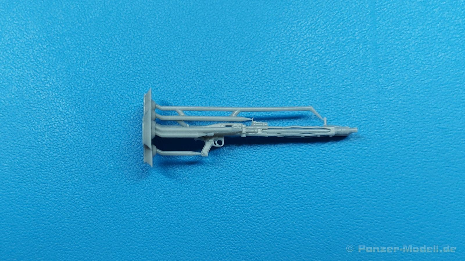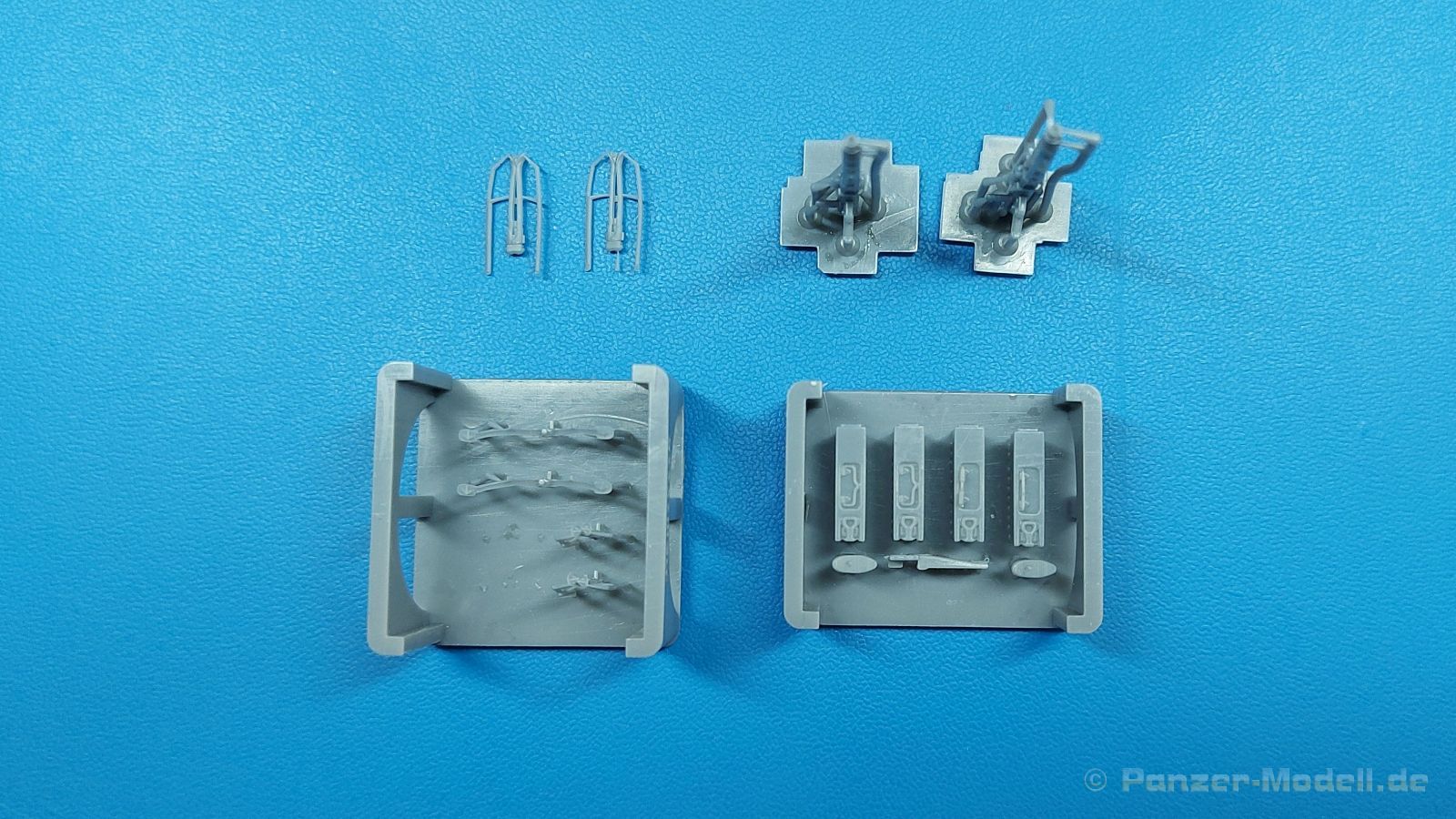 HD Models (Highly Detailed Models) aus Italien kann auch Waffen. 3D-gedruckt haben wir ein frühes MG42 vor uns. Die Teile kommen gut geschützt in einer Blisterverpackung und sind sauber gedruckt und müssen nur von den Stützstrukturen des 3D Drucks befreit werden. Die Stützstrukturen sind so fein, dass sich manche Teile bereits von Träger gelöst haben. Der Satz enthält 2 MG42, 2 Schulterstützen, 2 ausgeklappte Zweibeine, 4 zusammengeklappte Zweibeine, einen Verschlussdeckel und 4 Gurtkästen, verteilt auf 2 Druckträger und jedes MG extra. Ein MG ist mit geschlossenem Deckel und ausgeklappter Kimme und Korn dargestellt, das zweite ist ohne Deckel, Kimme und Korn eingeklappt. Details wie der Abzugsbügel, offener Rohrmantel, Rohrwechselklappe, Griffschalen, Schiebevisier und Rückstoßverstärker sind sehr fein und gut gestaltet. Der T-Griff für den Spannschieber ist wohl noch hinter den Stützstrukturen verborgen. Der Rohrmantel ist rechtsseitig etwas wellig. Die Mündungen sind offen dargestellt. Die separaten Schulterstützen sind glaubhaft in der Form und mit der Riffelung hinten versehen. Schaut man in den separaten Zuführerdeckel, entdeckt man die Kurvenschiene (Transportschiene), die vom Verschluss gesteuert den Gurttransport steuert. Die Zweibeine sind maßstäblich sehr gut gestaltet. Die Erdsporne gefallen mir gut, die Riegel, die das Zweibein zusammengeklappt am Rohrmantel halten, sind vorhanden. Vier Zweibeine sind zusammengeklappt, zwei ausgeklappt. Sogar die Rändelschrauben zwischen den Beinen sind vorhanden. Man könnte sie für Druckreste halten, gehören aber tatsächlich dorthin, wie Fotos im Netz beweisen. Vier schöne, individuell gestaltete Gurtkästen vervollständigen den Satz. Scharniere, Griffe und Riegel sind deutlich gedruckt. Zwei Kästen haben die Tragegriffe angeklappt, zwei sind ausgeklappt. Bei einem der ausgeklappten Griffe sind die Griffschützer auch vorhanden. Ein fantastisches Set, das eine Figur, ein Fahrzeug oder ein Diorama aufwertet! Der Preis mit über 18€ ist im Vergleich zu Plastik schon hoch, aber man bekommt auch was dafür.