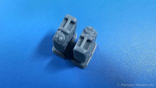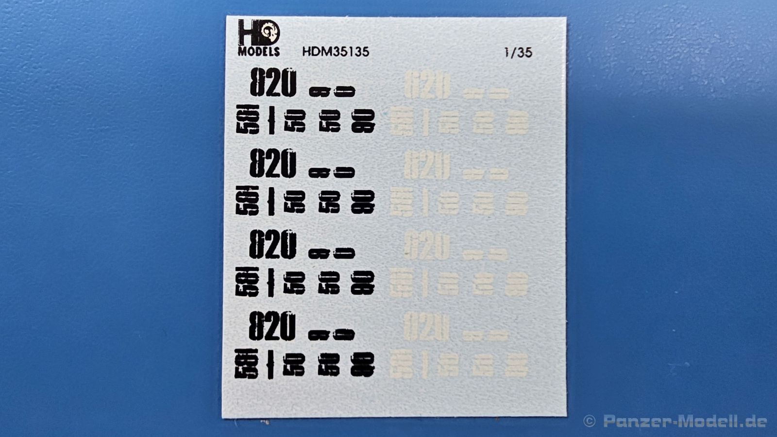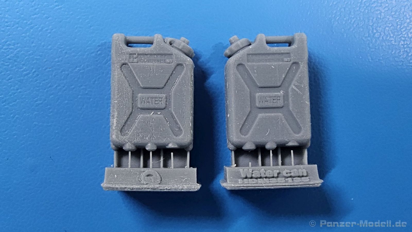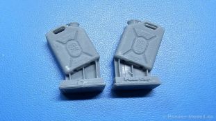Kunststoffkanister von Scepter sind besonders leichte, aus High-Density Polyethylen (HDPE) für das Militär (UN/NATO qualifiziert) hergestellte Kanister, die unter extremen Witterungsbedingungen haltbar sind und als nahezu unzerstörbar angepriesen werden. Sie haben ein Fassungsvermögen von 20 Litern. Es gibt sie sowohl für den Transport von Wasser als auch für Benzin oder Dieselkraftstoff. Damit man die Kanister im Dunklen nicht verwechseln kann, gibt es neben der eingeprägten Schrift deutlich fühlbare Unterscheidungsmerkmale: · Tragegriff(e): Wasser 1x / Kraftstoff 3x · Einfüllkappe mit Ausguß- und Belüftungsventil: Wasser Ja / Kraftstoff Nein · Grundform der Prägeschrift: Wasser in waagerechtem Rechteck / Kraftstoff in aufrechtstehendem Oval HD Models bietet nun in einer Blisterverpackung ein 12-teiliges Set solcher Kanister inklusive Naßschiebebilder in feinstem 3D-Druck an. Laut Packungsbeschreibung sollten es 8 Kraftstoff- und 4 Wasserkanister sein, aber wie Ihr seht, besteht das Muster aus 7 und 5. Der Druck ist sehr fein, die großen Schriftprägungen WATER, bzw. FUEL 20L sind sehr gut zu erkennen, die in dem Maßstab sowieso nicht lesbaren Hinweise sind andeutungsweise vorhanden. Die Stützstrukturen vom Druck befinden sich an den Kanisterböden. Die Wasserkanister haben X-förmige Versteifungsrippen an den Seiten mit dem Schriftzug WATER waagerecht mittig in ein Rechteck eingeprägt. Die Verschlusskappe des Einfüllstutzens hat eine separate Ausguss- und eine Entlüftungskappe und eine Haltelasche, die einen Verlust der Kappe beim Einfüllen verhindern soll. Am gerundeten Rand des Bodens sind Standfüße zu erkennen. Die die Standfestigkeit des Kanisters erhöhen. Ein einzelner Tragegriff ist unten durchbrochen dargestellt. All diese Details hat HD Models sehr schön wiedergegeben. Bei Originalkanistern kann man zwischen den oberen Winkeln des X auch 20L oder US eingeprägt sehen. Den gezeigten Teilen fehlt diese Prägung, aber ich kann auch nicht ausschließen, dass es Originale ohne diese Prägung gab. Auch die Kraftstoffkanister haben X-förmige Versteifungsrippen an den Seiten, aber in der Mitte ist FUEL 20L in einem aufrechtstehenden Oval eingeprägt. Die Verschlusskappe des Einfüllstutzens hat keine separate Ausguss- und eine Entlüftungskappe, aber wie die Wasserkanister eine Haltelasche, die einen Verlust der Kappe beim Einfüllen verhindern soll. Wie bei den alten Wehrmachtskanistern gibt es hier drei unten durchbrochene Tragegriffe. Ein kleiner Naßschiebebilderbogen beinhaltet schablonierte Zahlenmarkierungen sowohl in Schwarz als auch in Weiß. Die Bedeutung der Markierungen hat sich mir nicht erschlossen. Auch waren sie wohl nicht immer angebracht. Sie sind jedenfalls bereits etwas abgescheuert dargestellt, um den Gebrauch darzustellen. Dieses Set stellt auf alle Fälle eine Bereicherung für ein Fahrzeug oder Dioramenszene dar. Da wenig Nacharbeit anfällt, können sie schnell bemalt und verwendet werden.
