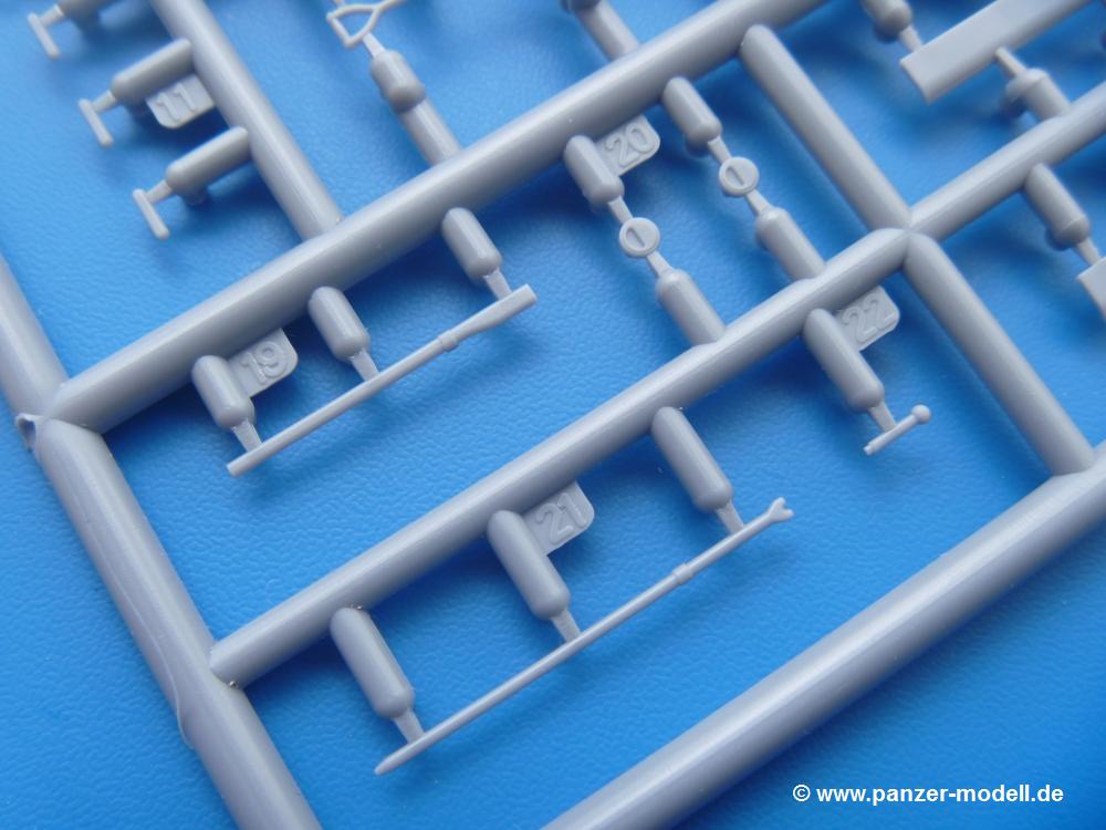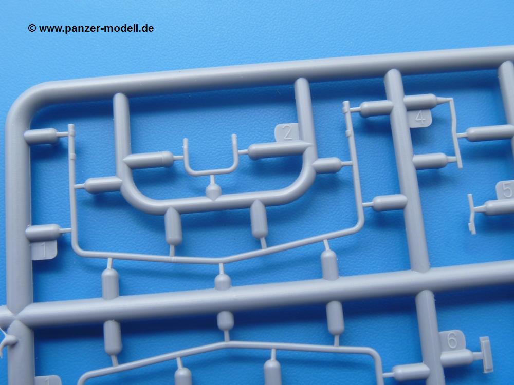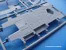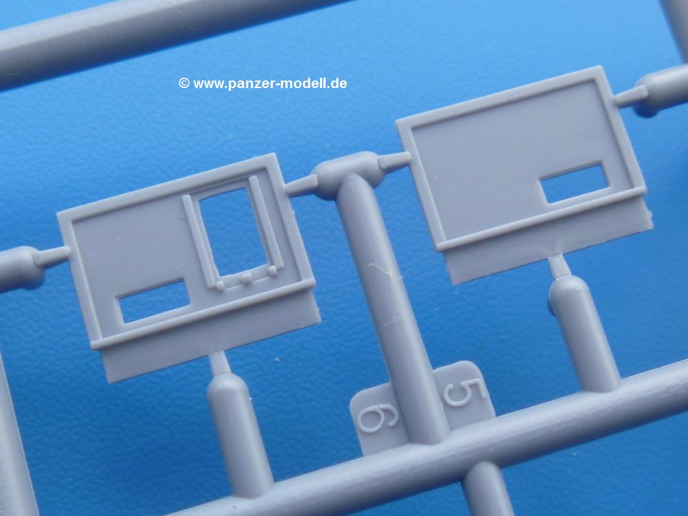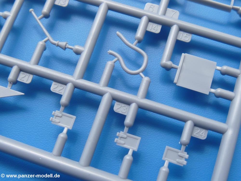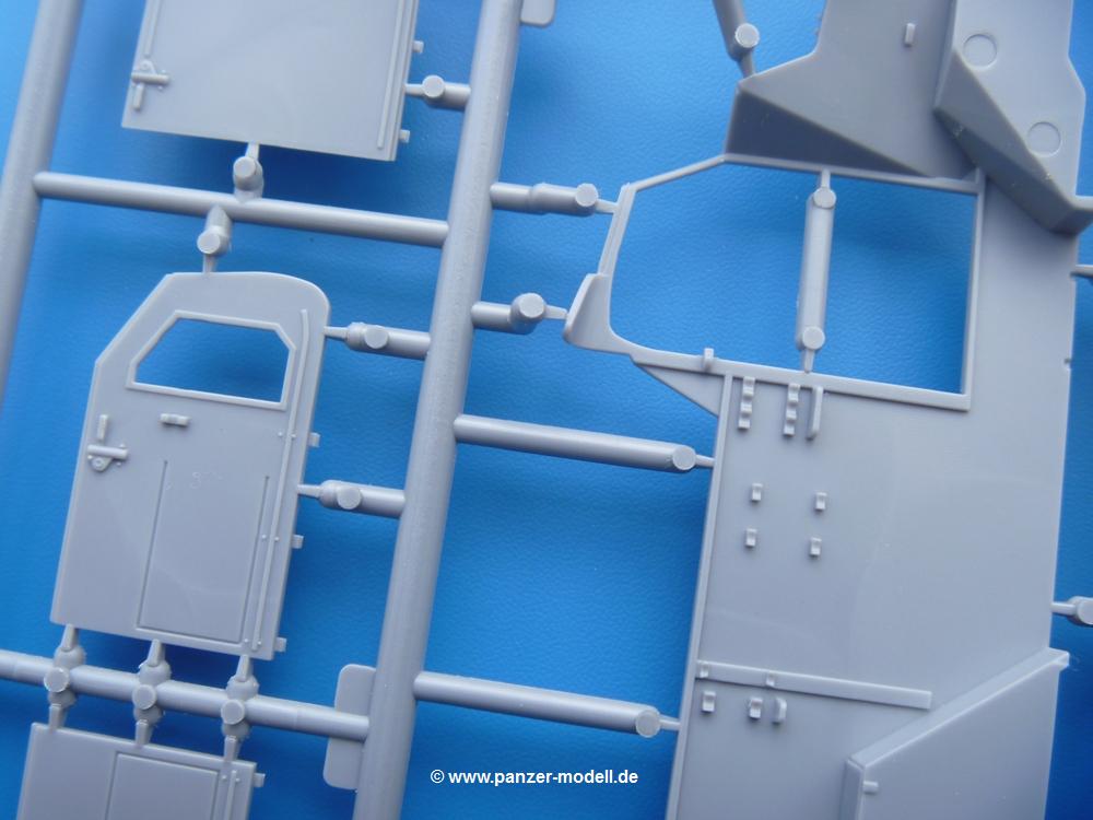 Die Teile aus mittelgrauem Plastik sind sauber ausgespritzt, ohne Grat und Versatz. Die Auswerfer sind meist auf den Spritzrahmen platziert. Einige wenige sind auf Teilen zu finden, aber so platziert, dass sie auch ohne Verspachteln nach dem Zusammenbau nicht mehr stören würden. Die innere Spannung einzelner Spritzlinge hat zum Verbiegen der Hecktür (H9) und des Fensterrahmens der Fahrerhausfront (I8) geführt, welches aber zu beheben sein wird.