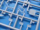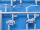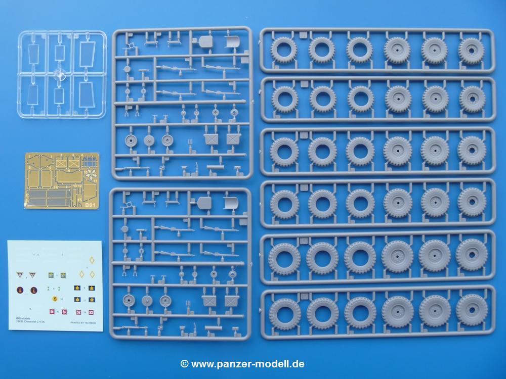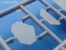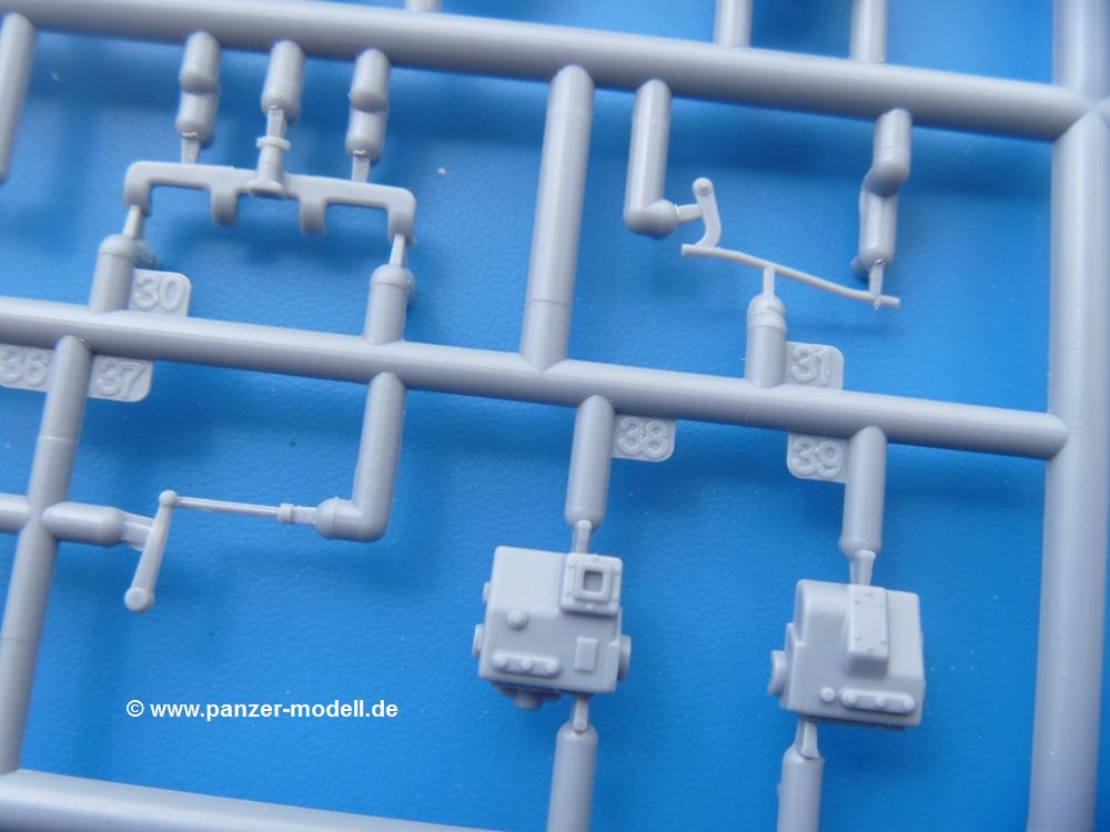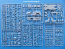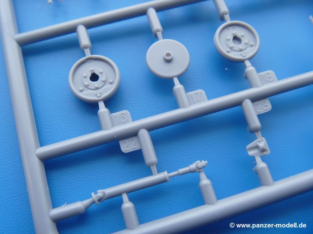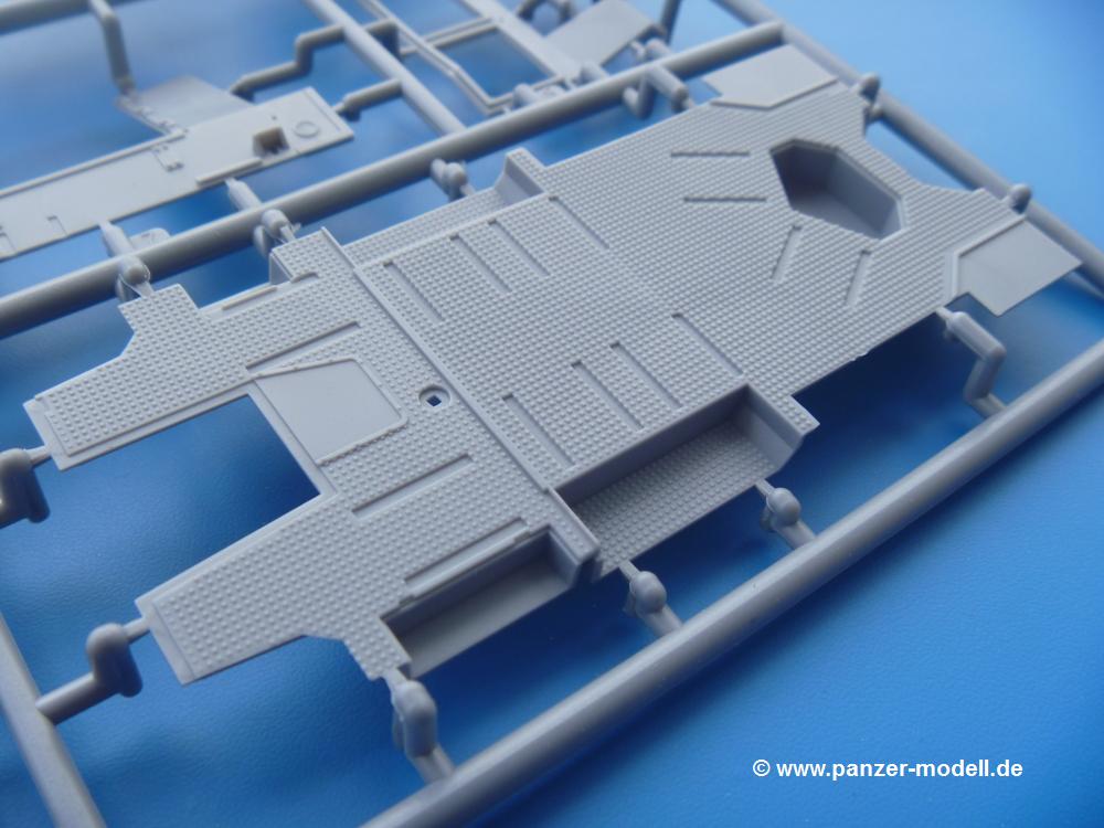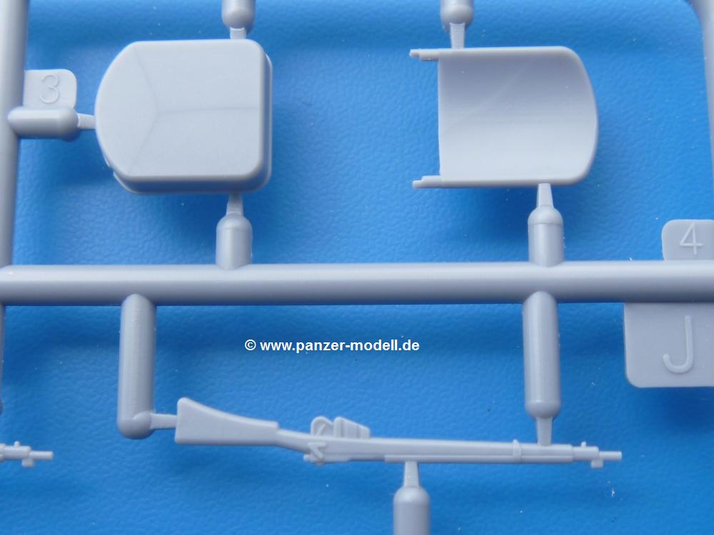 Die Teile aus mittelgrauem Plastik sind sauber ausgespritzt, ohne Grat und Versatz. Die Auswerfer sind meist auf den Spritzrahmen platziert. Einige wenige sind auf Teilen zu finden, aber so platziert, dass sie auch ohne Verspachteln nach dem Zusammenbau nicht mehr stören würden. Die innere Spannung einzelner Spritzlinge hat zum Verbiegen der Hecktür (H9) und des Fensterrahmens der Fahrerhausfront (I8) geführt, welches aber zu beheben sein wird.