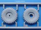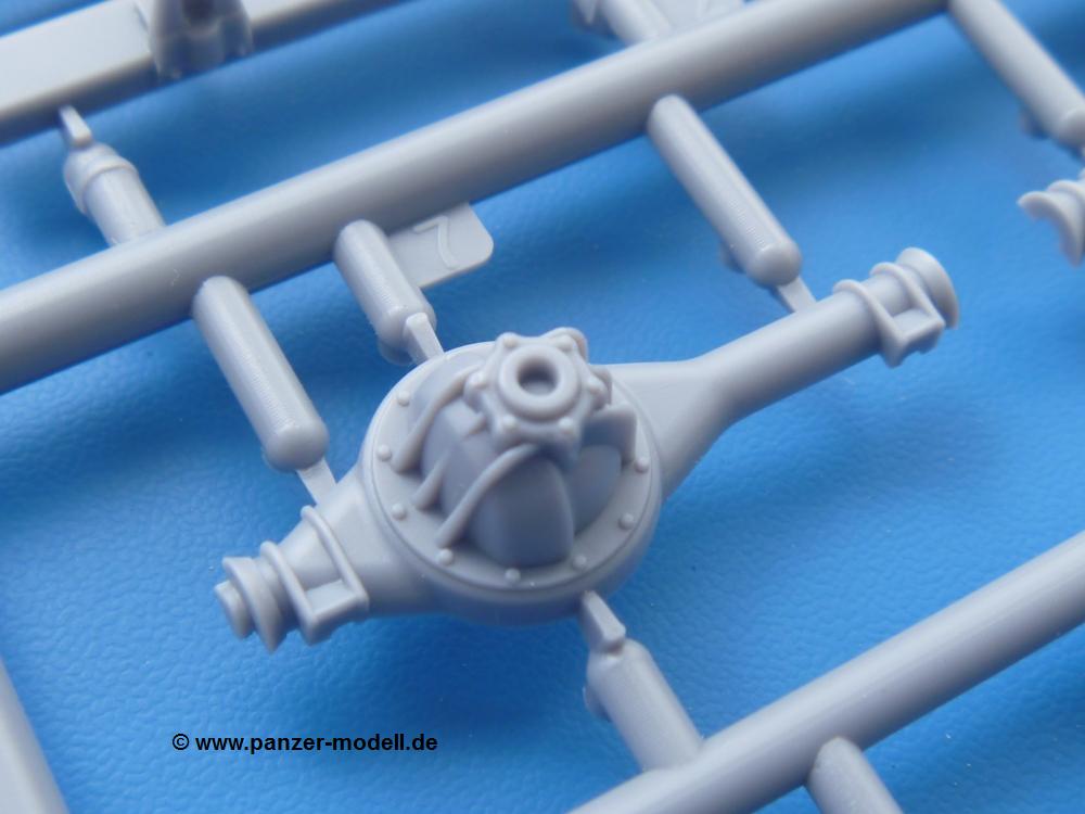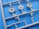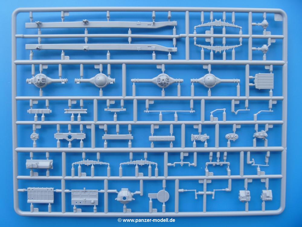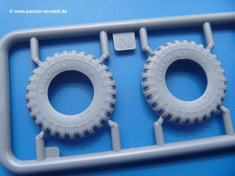 Fahrgestell: Wie heutezutage bei Lkw Modellen meist üblich besteht der Rahmen aus separaten Längs- und Querträgern. Der Aufbau der Teile hinterlässt den Eindruck, dass auch ein Anfänger einen verzugsfreien Rahmen hinbekommt. Die Blattfedern sind schön strukturiert. Der Allradantrieb mit geteilten Achsen, einzelnen Kardanwellen und Getriebe ist toll detailliert. Sämtliche Lenkgestänge der Vorderachse sind dabei. Der Minuspunkt ist, dass man die Räder nur in Geradeausstellung montieren kann. Die Differentialgehäuse erhalten Schutzbleche aus PE-Teilen. Die für den Bausatz benötigten Räder befinden sich am Spritzling N. Jedes Rad besteht aus 2 Hälften. Sehr schön der hervorgehobene Herstelleraufdruck, die Rad-/Felgengröße (Goodyear 10.50-16), das Profil und die Verschraubungen. Es liegen auch noch andere Radspritzlinge mit kleineren (M) und größeren (O) Rädern bei, die laut Bauanleitung aber keine Verwendung finden.