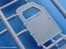 Aufbau: Der Aufbau besteht hauptsächlich aus den großen Seitenteilen, der Boden- und Heckplatte, sowie der Fahrerfront. Die Motorabdeckung besteht aus 5 Teilen und auch die Lamellen des Kühlergrills sind als Einzelteile ausgelegt und geben dem Grill Tiefe. Nicht nur alle Türen sind separat und damit offen oder geschlossen baubar, sondern auch die darin befindlichen Sichtklappen. Für die Frontscheiben gibt es kratzer- und schlierenfreie Klarsichtteile. Türgriffe und Öffnungshebel für die Klappen sind weitere Details.