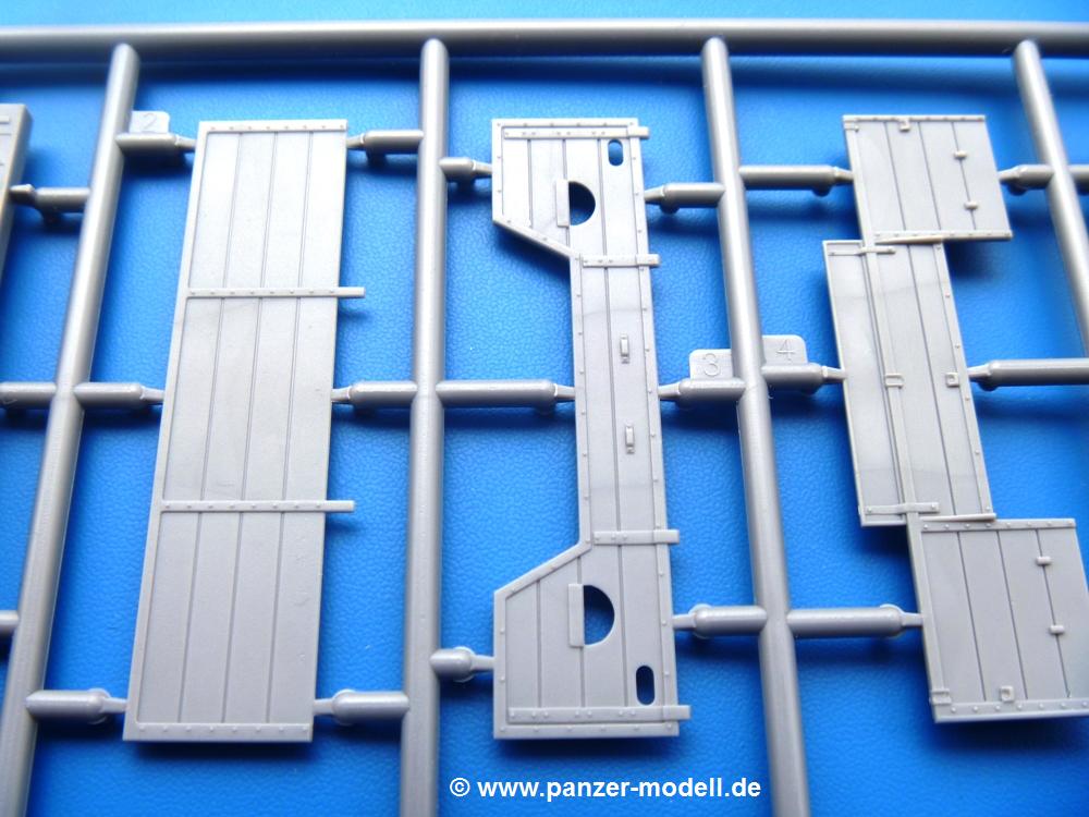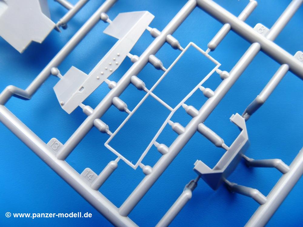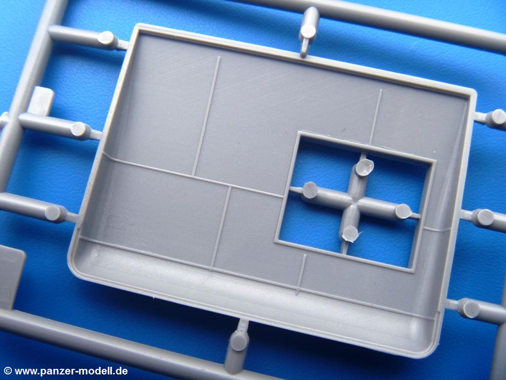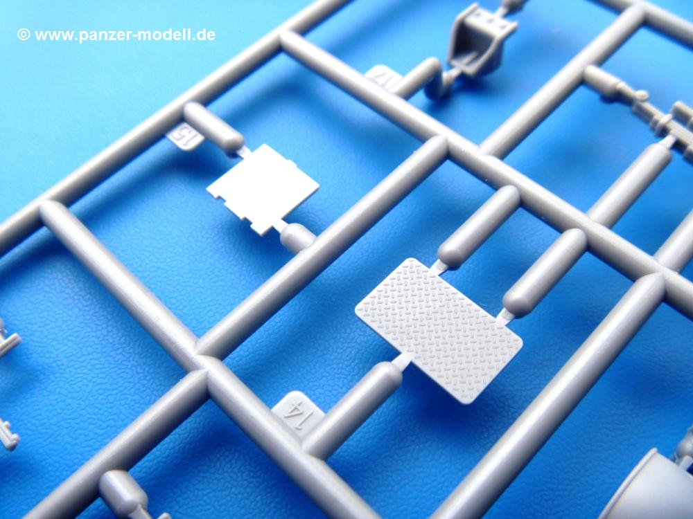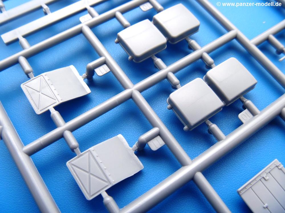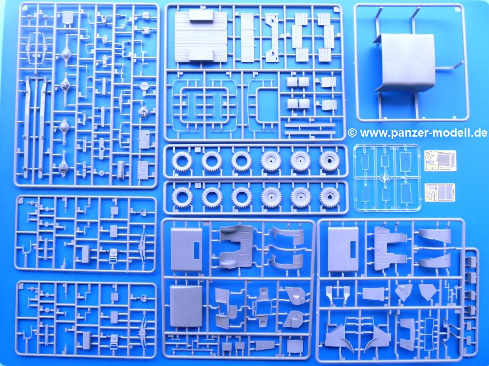 Die Teile aus mittelgrauem Plastik sind sauber ausgespritzt, ohne Grat und Versatz. Die Auswerfer sind meist auf den Spritzrahmen platziert. Einige wenige sind auf Teilen zu finden, aber so platziert, dass sie auch ohne Verspachteln nach dem Zusammenbau nicht mehr stören würden.Fahrgestell: Wie heutzutage bei Lkw Modellen meist üblich besteht der Rahmen aus separaten Längs- und Querträgern. Der Aufbau der Teile hinterlässt den Eindruck, dass auch ein Anfänger einen verzugsfreien Rahmen hinbekommt. Die Blattfedern sind schön strukturiert. Der Allradantrieb mit geteilten Achsen, einzelnen Kardanwellen und Getriebe ist toll detailliert. Sämtliche Lenkgestänge der Vorderachse sind dabei. Der Minuspunkt ist, dass man die Räder nur in Geradeausstellung montieren kann. Jedes Rad besteht aus 2 Hälften. Sehr schön der hervorgehobene Herstelleraufdruck, die Rad-/Felgengröße (Goodyear 9.00-15), das Profil und die Verschraubungen. Am Rahmen finde Tanks mit langen Einfüllstutzen Platz. Auch die Trittbleche für's Fahrerhaus werden am Rahmen befestigt. Hier muss man darauf achten, dass das rechte Blech zwischen Cab 12 und 13 abweicht, während das linke bei beiden gleich ist. Zwischen Fahrerhaus und Ladefläche sitzt ein großer Staukasten mit Halterung für das Ersatzrad quer auf dem Rahmen. Die Staukastenklappen lassen sich offen oder geschlossen bauen.Motor: Der Motor weist viele Einzelteile und somit Details auf. Lichtmaschine, Zündspule, Luftfilter, Keilriemen, Lüfterrad usw. Wenn man den Motor zeigen möchte, sollte man die Motorhaube offen lassen, was zum Glück möglich ist. Der Auspuff ist mehrteilig ausgelegt, welches hoffentlich die Anbringung erleichtert.Fahrerhaus: Der Bausatz enthält Bauteile für 2x 2 Fahrerhäuser. Man hat die Wahl zwischen Cab 12 und Cab 13. Und jede dieser Versionen kann wahlweise mit geschlossenem Dach oder mit Dach mit einer Dachluke gebaut werden. Alle Sitze bestehen aus je 2 Bodenschienen, Sitzpolster und Rückenlehnen. Die Sitzpolster sind mir etwas zu glatt. Ein wenig Struktur wäre schön gewesen. Der Fahrer muss kein Bedienelement vermissen - Gas-, Brems-, Kupplungspedal, Schalt-, Allrad-, Handbremshebel, Lenkstange, Lenkrad, Armaturentafel - alles da, aber man vermisst etwas die Decals für die Armaturen. Feuerlöscher und die Karabiner der Besatzung finden auch ihren Platz im Fahrerhaus. Die Motorhaube(n) liegen als separate Teile bei. Man kann also einen Blick auf den Motor ermöglichen, nur muss man sich für die Scharniere selbst etwas einfallen lassen. Für die Kühlergrills gibt es schöne PE-Teile. Beim Cab 13 Grill sind Chevrolet Logo mit Schriftzug gut gestaltet. Für die Frontscheiben gibt es kratzer- und schlierenfreie Klarsichtteile. An Scheibenwischer in Form von PE-Teilen wurde auch gedacht.Ladefläche: Hier hat die Wahl zwischen 2, bzw. 3 Gestaltungsmöglichkeiten - mit Plane oder nur mit Spriegel. Lässt man die Spriegel weg und verspachtelt die Löcher für die Verbindungszapfen, hat man die 3. Möglichkeit. Die Bodenplatte mit den Längsbrettern ist für alle gleich. Rahmenaufsatzbalken, 4 Staukästen, teils mit separaten Klappen, und die hinteren Schmutzfänger gestalten die Unterseite.Entscheidet man sich für die Spriegel Version, bringt man Seiten-, Frontteile und die Heckklappe an. Letztere kann man auch heruntergeklappt anbauen. Dann folgen noch 2 Doppelsitzpolster auf den Radkästen. Die Spriegel besten aus 3 U-förmigen, sehr feinen Stangen. Vorsicht beim Abtrennen vom Spritzling! Dazu kommen noch 4 ebenso feine Stabilisierungsstangen.Bei der Planenversion bringt man nur die Sitzpolster auf den Radkästen an, dann folgt schon die Plane aus einem Stück, bei der Seiten- und Frontteile integriert sind. Die Plane ist trotz dünnem Material stabil. Innen sind die Spriegel angedeutet, aussen ist ein leichter, aber glaubhafter Faltenwurf vorhanden. Auch an die Zurrseile wurde gedacht. Die Heckklappe kann offen oder geschlossen gebaut werden.Gemäß Anleitung kann man mit den Decals 3 Fahrzeuge darstellen: