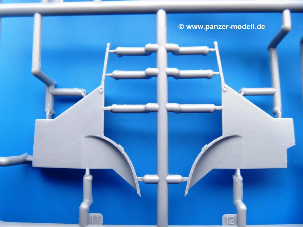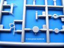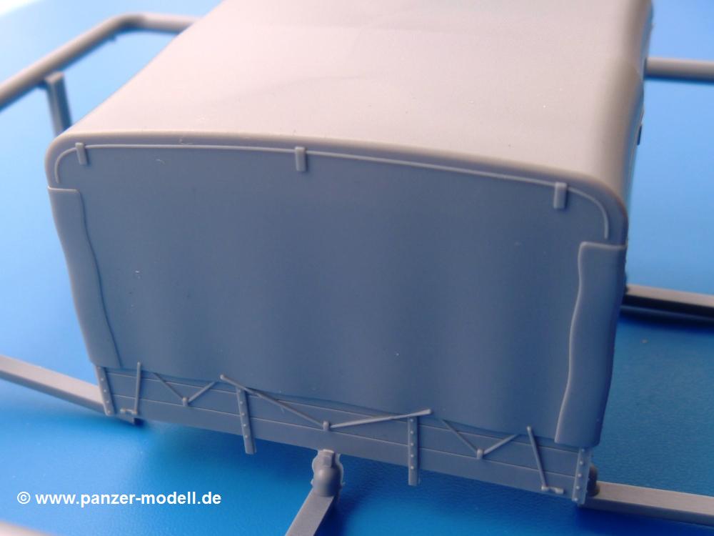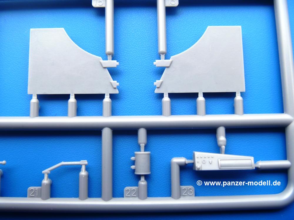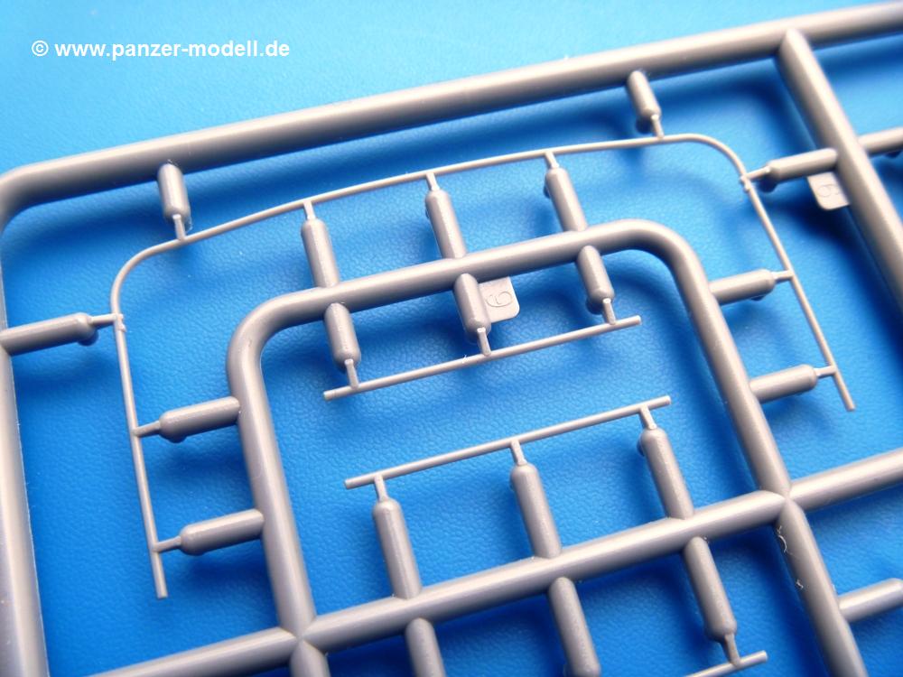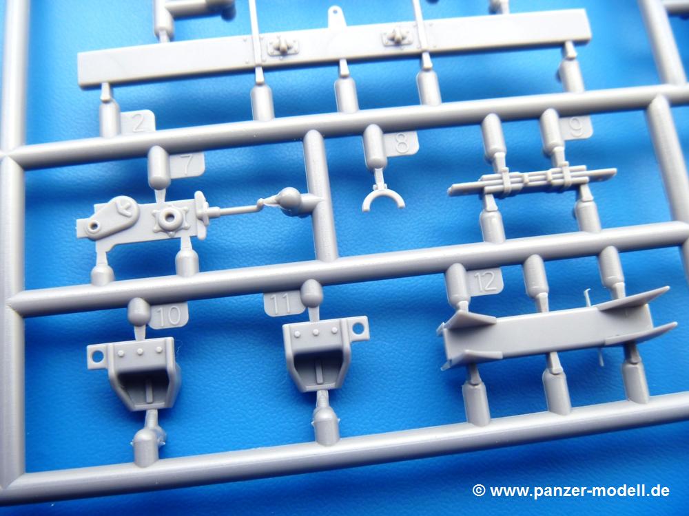 Die Teile aus mittelgrauem Plastik sind sauber ausgespritzt, ohne Grat und Versatz. Die Auswerfer sind meist auf den Spritzrahmen platziert. Einige wenige sind auf Teilen zu finden, aber so platziert, dass sie auch ohne Verspachteln nach dem Zusammenbau nicht mehr stören würden.Fahrgestell: Wie heutzutage bei Lkw Modellen meist üblich besteht der Rahmen aus separaten Längs- und Querträgern. Der Aufbau der Teile hinterlässt den Eindruck, dass auch ein Anfänger einen verzugsfreien Rahmen hinbekommt. Die Blattfedern sind schön strukturiert. Der Allradantrieb mit geteilten Achsen, einzelnen Kardanwellen und Getriebe ist toll detailliert. Sämtliche Lenkgestänge der Vorderachse sind dabei. Der Minuspunkt ist, dass man die Räder nur in Geradeausstellung montieren kann. Jedes Rad besteht aus 2 Hälften. Sehr schön der hervorgehobene Herstelleraufdruck, die Rad-/Felgengröße (Goodyear 9.00-15), das Profil und die Verschraubungen. Am Rahmen finde Tanks mit langen Einfüllstutzen Platz. Auch die Trittbleche für's Fahrerhaus werden am Rahmen befestigt. Hier muss man darauf achten, dass das rechte Blech zwischen Cab 12 und 13 abweicht, während das linke bei beiden gleich ist. Zwischen Fahrerhaus und Ladefläche sitzt ein großer Staukasten mit Halterung für das Ersatzrad quer auf dem Rahmen. Die Staukastenklappen lassen sich offen oder geschlossen bauen.Motor: Der Motor weist viele Einzelteile und somit Details auf. Lichtmaschine, Zündspule, Luftfilter, Keilriemen, Lüfterrad usw. Wenn man den Motor zeigen möchte, sollte man die Motorhaube offen lassen, was zum Glück möglich ist. Der Auspuff ist mehrteilig ausgelegt, welches hoffentlich die Anbringung erleichtert.Fahrerhaus: Der Bausatz enthält Bauteile für 2x 2 Fahrerhäuser. Man hat die Wahl zwischen Cab 12 und Cab 13. Und jede dieser Versionen kann wahlweise mit geschlossenem Dach oder mit Dach mit einer Dachluke gebaut werden. Alle Sitze bestehen aus je 2 Bodenschienen, Sitzpolster und Rückenlehnen. Die Sitzpolster sind mir etwas zu glatt. Ein wenig Struktur wäre schön gewesen. Der Fahrer muss kein Bedienelement vermissen - Gas-, Brems-, Kupplungspedal, Schalt-, Allrad-, Handbremshebel, Lenkstange, Lenkrad, Armaturentafel - alles da, aber man vermisst etwas die Decals für die Armaturen. Feuerlöscher und die Karabiner der Besatzung finden auch ihren Platz im Fahrerhaus. Die Motorhaube(n) liegen als separate Teile bei. Man kann also einen Blick auf den Motor ermöglichen, nur muss man sich für die Scharniere selbst etwas einfallen lassen. Für die Kühlergrills gibt es schöne PE-Teile. Beim Cab 13 Grill sind Chevrolet Logo mit Schriftzug gut gestaltet. Für die Frontscheiben gibt es kratzer- und schlierenfreie Klarsichtteile. An Scheibenwischer in Form von PE-Teilen wurde auch gedacht.Ladefläche: Hier hat die Wahl zwischen 2, bzw. 3 Gestaltungsmöglichkeiten - mit Plane oder nur mit Spriegel. Lässt man die Spriegel weg und verspachtelt die Löcher für die Verbindungszapfen, hat man die 3. Möglichkeit. Die Bodenplatte mit den Längsbrettern ist für alle gleich. Rahmenaufsatzbalken, 4 Staukästen, teils mit separaten Klappen, und die hinteren Schmutzfänger gestalten die Unterseite.Entscheidet man sich für die Spriegel Version, bringt man Seiten-, Frontteile und die Heckklappe an. Letztere kann man auch heruntergeklappt anbauen. Dann folgen noch 2 Doppelsitzpolster auf den Radkästen. Die Spriegel besten aus 3 U-förmigen, sehr feinen Stangen. Vorsicht beim Abtrennen vom Spritzling! Dazu kommen noch 4 ebenso feine Stabilisierungsstangen.Bei der Planenversion bringt man nur die Sitzpolster auf den Radkästen an, dann folgt schon die Plane aus einem Stück, bei der Seiten- und Frontteile integriert sind. Die Plane ist trotz dünnem Material stabil. Innen sind die Spriegel angedeutet, aussen ist ein leichter, aber glaubhafter Faltenwurf vorhanden. Auch an die Zurrseile wurde gedacht. Die Heckklappe kann offen oder geschlossen gebaut werden.Gemäß Anleitung kann man mit den Decals 3 Fahrzeuge darstellen:
