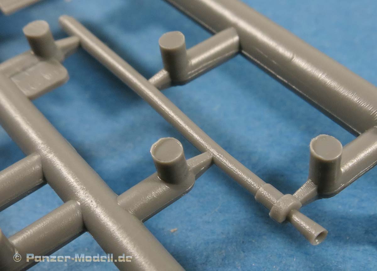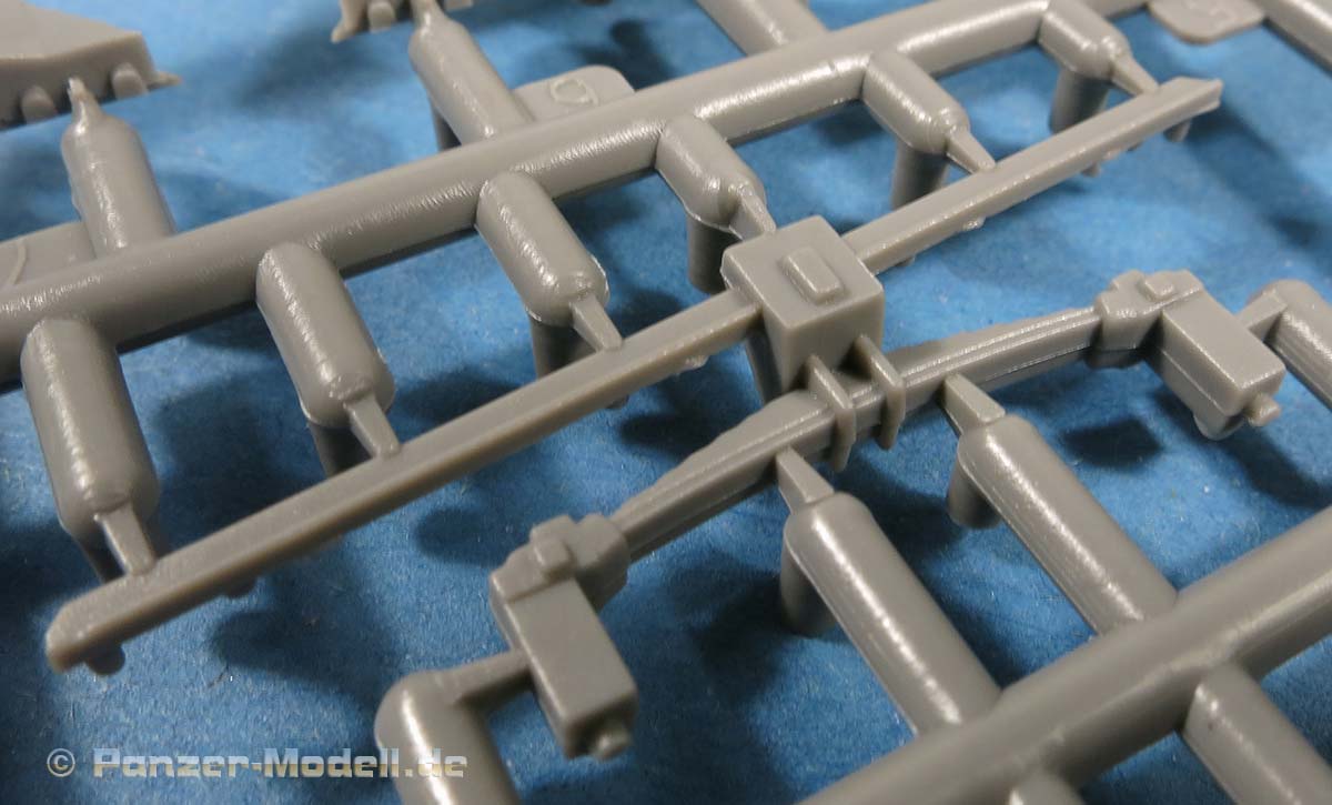 Hier finden wir 17 graue, jeweils recht kleine Spritzlinge (was dafür spräche, dass da noch andere TK-Versionen kommen) in guter Spritzguss Qualität, sowie PE Teile und ein Metallrohr. Die Details machen einen guten und sauberen Eindruck, Auswerferstellen oder Grate stechen nicht ins Auge.