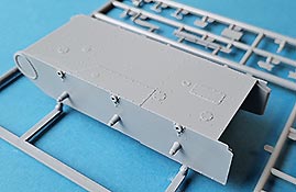 Die Unterwanne ist im Grund einteilig gespritzt, was den Zusammenbau erleichtert. Front und Heckwand werden separat eingesetzt und man hat hier die Auswahl zwischen zwei verschiedenen Heckwänden in früher oder später Auslegung. Die Darstellung er Wannenteile, gerade an der gerundeten Frontplatte und der Heckwand mit der gerundeten Ausbuchtung für den Motorlüfter sind sehr schön ausgeführt und erfreuen mit Nieten und Schweißnahtdetails.