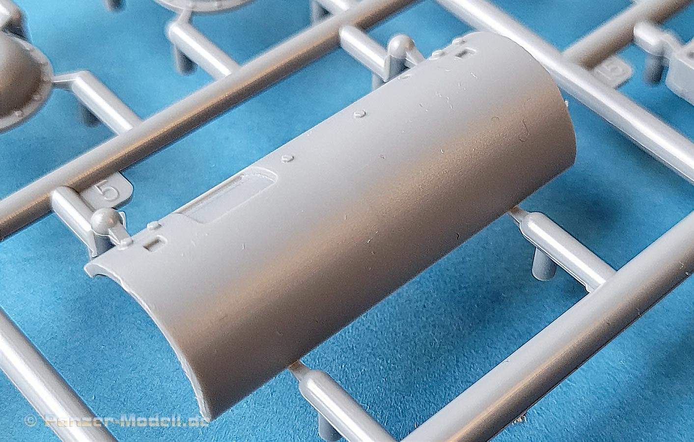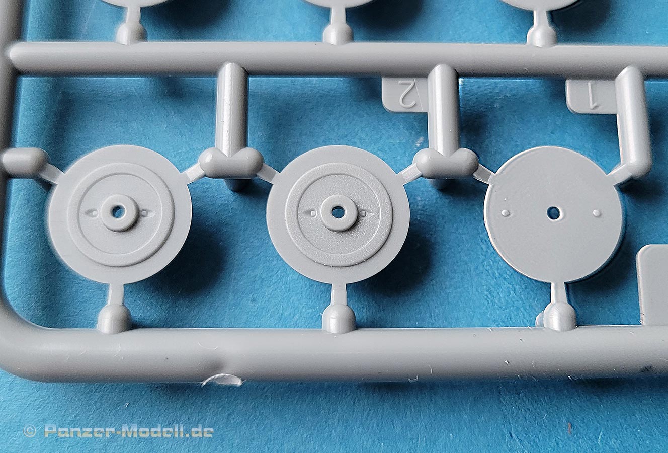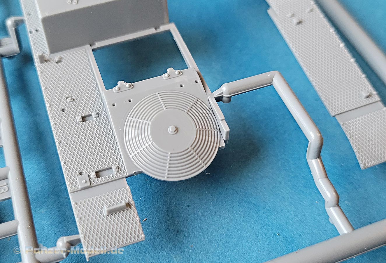 Die Kettenbleche sind ebenfalls direkt mit an die Oberwanne mit angespritzt, was den Bau erleichtert und die Detaillierung mit dem Rautenriffelblechmuster ist wirklich sehr schön und sauber dargestellt. Für alle aufzubringenden Details wie Werkzeug oder auch die Lagerung der Antenne sind entsprechende Markierungen und Aussparungen im Riffelmuster bereits angebracht.