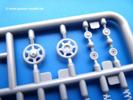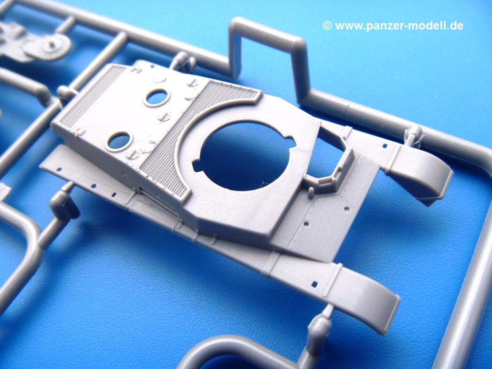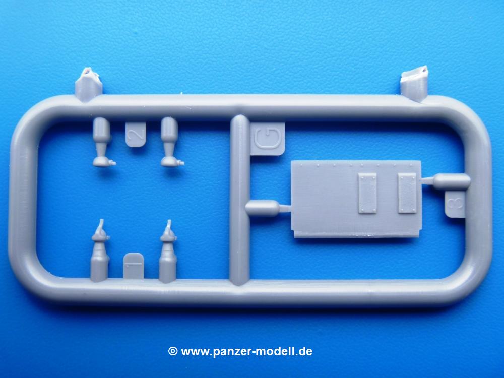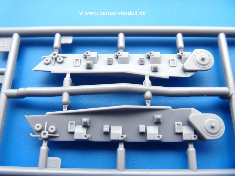 Die Teile aus mittelgrauem Plastik sind sauber ausgespritzt, ohne Grat und Versatz. Die Auswerfer sind meist auf den Spritzrahmen platziert. Feine Details treten scharf hervor.Die Wanne ist mehrteilig in Boden-, Heck-, Bugplatte und Seitenwänden ausgeführt. Ebenso sind Schwingarme, Stoßdämpfer und Kettenspannvorrichtung als separate Teile zu montieren. Die Befestigungsstifte der Schwingarme erscheinen mir ein wenig kurz. Sicheres Verkleben erspart späteren Frust. Alle Räder werden Paaren zusammengeklebt. Nieten und Verschraubungen sind jede Menge vorhanden, die Details treten scharf hervor. Die Ketten bestehen aus verschieden großen Segmenten und Einzelgliedern für die Rundungen der Antriebs- und Leiträder. Die Kettenführungszähne sind auch sehr schön gestaltet. Das Heraustrennen der Einzelglieder wird jede Menge Vorsicht erfordern, da die Glieder extrem fein und zerbrechlich erscheinen.Die Oberwanne besteht aus einem großen Teil mit angegossenen Kettenabdeckungen. Auch hier fallen feine Details wie Nietenreihen, Wartungsklappen, Luftein- und Auslassgrätings auf. An den Staukästen finden wir feine Klavierscharniere. Werkzeuge wie Schaufel, Spitzhacke, Brechstange und Wagenheber beleben das Fahrzeug. Die Fahrerluke kann geöffnet oder geschlossen angebracht werden. Die Scheinwerfer sind mit ihren Schutzbügeln zusammengegossen und wirken ein klein wenig "klotzig", sind aber in dem Maßstab in Spritzguß kaum besser zu gestalten.Der Turm besteht Unter-, Oberteil und Luke. Seitenluken und Sichtklappen sind angegossen, trotzdem aber sehr schön detailliert. Zwar sind auch die 20mm Kanone und die passende Blende im Bausatz vorhanden, aber für den Toldi IIa kommt die 40mm Kanone mit ihrer Blende zum Einsatz. Das Turmheck bekommt noch einen zweiteiligen Staukasten.Dem Bausatz liegen Decals für 2 Fahrzeuge bei. In der Anleitung ist aber nur 1 Version in Wintertarnung über olivgrüner Grundfarbe erwähnt: