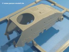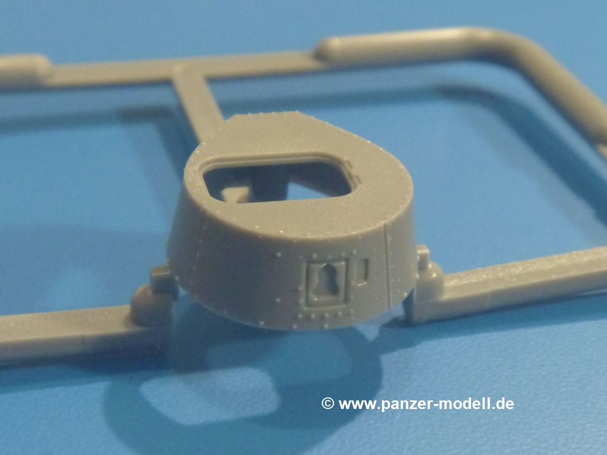 Es gibt nur wenige Teile für den Turm, welches aber keinen negativen Einfluss auf die Detaillierung hat. Nieten, Blechstöße und Scharniere sind schön dargestellt. Die zweigeteilte Kommandantenluke kann geöffnet oder geschlossen gebaut werden. Das Kanonenrohr ist aufgebohrt.