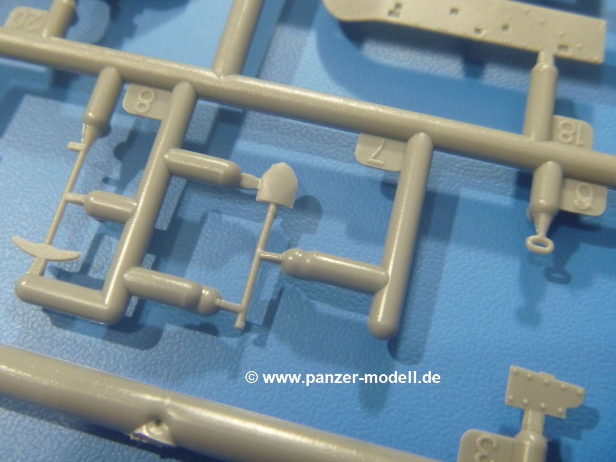 Die Teile aus mittelgrauem Plastik sind sauber ausgespritzt, mit minimalstem Grat und ohne Versatz. Die Auswerfer sind meist auf den Spritzrahmen platziert. Wir entdecken feine Details.