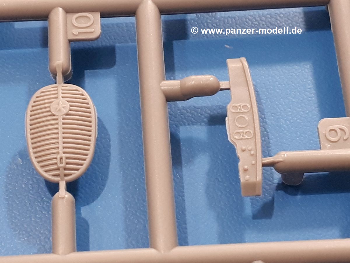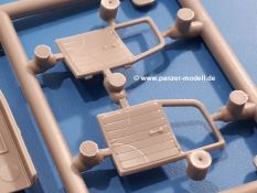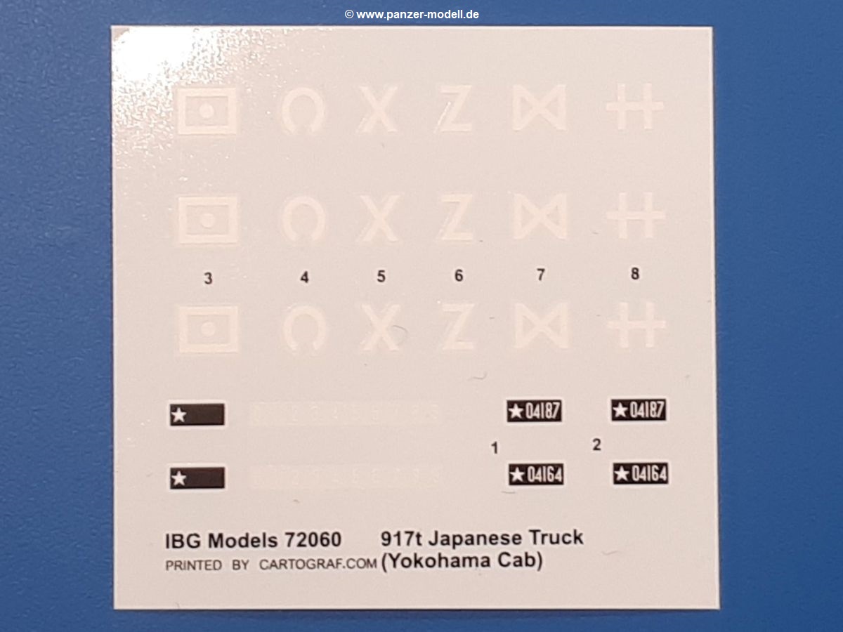 Wie beim deutschen 917T gibt es beim Blick in den Karton keine unangenehmen Überraschungen. Die Teile aus hellgrauem Plastik sind sauber ausgespritzt, ohne Grat und Versatz. Die Auswerfer sind meist auf den Spritzrahmen platziert. Kleine Angüsse erleichtern das Abtrennen der Teile.Auch hier können wir schöne Details entdecken, schon bei dem V8 Motor mit Luftfilter, Lichtmaschine, Anlasser, Riemenscheiben mit Keilriemen, Kühlerpropeller aus PE, Kühlmittelleitungen und schönen Zylinderköpfen inklusive Abgaskrümmern beginnen. Der Kühler selbst zeigt allseitig schöne Details.Der Fahrzeugrahmen besteht zusammengegossenen Längs- und Querträgern. Es muss nur noch der hintere Querträger und die Anhängekupplung, vorn die Stoßstange mit den Peilstangen ergänzt werden. Schlepp/Zurrhaken aus PE werden sowohl vorne als auch hinten angebracht. Die Vorderachse wird an dem querliegenden Blattfederpaket befestigt und mit dem Querlenker und Stabilisator vervollständigt. Doppelblattfederpakete nehmen die Hinterachse auf, die noch die Bremstrommeln, Stabilisator und Kardanwelle erhält. Die Räder zeigen ein sehr schönes Profil für den kleinen Maßstab. Nach dem Einbau des Motors muss noch der Auspuff am Rahmen angebracht werden.Die neue Fahrerkabine (Yokohama Cab) ist gut detailliert. Die Pedale sind bereits angegossen, aber diesmal auf der rechten Seite, da in Japan ja wie in England Linksverkehr herrscht. Das Armaturenbrett weist alle Instrumente und Bedienknöpfe auf. Lenkstange und Lenkrad werden separat angebaut. Die separat anzubauenden Türen (die man also auch offen anbauen kann) haben eine Innenverkleidung. Sogar an die Drehkurbeln der Seitenfenster wurde gedacht. Der 917t besitzt eine einteilige Sitzbank mit einer durchgehenden Rückenlehne. Darüber werden, quer vor dem Rückfenster, 2 Karabiner angebracht. Die Fahrertür bekommt noch einen Außenspiegel aus PE. Eine sitzende Fahrerfigur mit separaten Armen belebt die Fahrerkabine.An das Fahrerhaus werden dann noch die Motorverkleidung, Motorhaube, Kühlergrill und Kotflügel mit Trittbrettern angebracht. (Ich würde die Motorhaube nur auflegen oder offen anbauen, so dass man den Motor sehen kann.) Auf die Kotflügel kommen nur noch die Fahrscheinwerfer und ein Kennzeichen aus PE.Die Pritsche besteht aus dem Pritschenrahmen, -boden, Seiten-, Frontteil und der Heckklappe. Es gibt keine Plane, keine Spriegel. Die hinteren Kotflügel besitzen Trittbretter, die an die Trittbretter vorn anschließen. Links kommt noch ein Staukasten auf das hintere Trittbrett. Auf der linken Rahmenseite wird ein offener PE-Staukasten angebracht, in den 2 Glasflaschen (für Öl oder Wasser) einsetzt.Die Decals sind seidenmatt mit geringem Trägerrand gedruckt. Man kann damit 5 verschiedene Lkw darstellen, leider ohne Angabe der Einheiten: