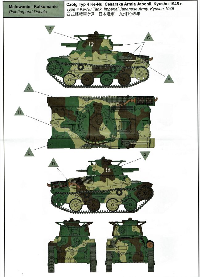 Und wieder etwas für die Freunde des kleinen Massstabs. Der Ke-Nu war eine Kombination von Wannen des Ha-Go und Türmen des Chi-Ha. Ab Ende 1944 wurden rund 100 Stück gebaut und als Type 4 Ke-Nu in Dienst gestellt. Definitiv haben wir wieder einmal einen Exoten auf dem Tisch… Der für IBG typische Stülpkarton (30 x 20 x 4,5 cm) beherbergt sechs graue Spritzlinge, eine kleine PE-Platine, Decals und die Bauanleitung. Die Teile sind wieder absolut sauber gespritzt. Grat oder Verzug findet sich nicht und die Auswerfermarkierungen sind wieder auf den Rahmen platziert. Fischhäute sucht man ebenfalls vergebens. Alles sehr filigran, wobei aber auch die Details durchaus sehr scharf und genau wiedergegeben sind. Im Rahmen A finden sich Ober- und Unterwanne des Panzers. Dazu noch Teile des Antriebs- und die Auspuffanlage. Gleichfalls verschiedene Bordwerkzeuge. Turmteile gibt es im Rahmen C zu entdecken. Hier finden sich auf den Bauteilen allerfeinste Nieten. Auch die filigrane Antenne am Turm ist sehr gut reproduziert. Die Rahmen E und G (jeweils zwei mal vorhanden) enthalten das komplette Laufwerk. Die Kette ist einteilig und die Laufrollen sind, wo möglich, bereits in einer kleinen Guppe zusammengefasst. Sehr gut umgesetzt. Seidenmatt und ohne Trägerrand kommen die winzigen Decals daher. Gemäß Anleitung sind drei Fahrzeuge darstellbar: Imperiale japanische Navy, unbekannte Einheit 1944-45, einfarbig // Imperiale japanische Armee, unbekannte Einheit 1944-45, Flecktarn // Imperiale japanische Armee, Kyushu 1945, Flecktarn. (s.a. Bilder) Die Bauanleitung erstreckt sich über acht Seiten im A4 Format. Die kurzen Beschreibungen sind wie üblich polnisch und enlisch. Dazu japanisch??? Auf der ersten Seite finden sich neben Bauhinweisen noch Angaben zu den Farbherstellern. Das sind Tamiya, Vallejo, Hataka, Lifecolor, AK Interactice und Mission Models. Ebenfalls aufgeführt sind die Decals und die PEs. Die Übersicht aller Teile gibt es auf der zweiten Seite. Ab Seite drei wird der Bau des Kits in insgesamt 15 sinnvollen Schritten beschrieben. Diesmal in übersichtlichen Zeichnungen. Das alles ist sehr gut dargestellt und sollte keine Fragen aufwerfen. Die Anbringung der Decals und die Bemalungsanleitung von den drei Fahrzeugen finden wir auf den letzten Seiten. Ein interessanter kleiner Panzer zum kleinen Preis! Und wenn ich schreibe „kleiner“ Panzer, dann trifft das auf den Ke-Nu durchaus zu. Nicht ganz sechs(!) Zentimeter misst der „Kleine“… J Hauptaugenmerk dürfte bei der Bemalung liegen, denn die Paßgenauigkeit ist bei IBG absolut in Ordnung.