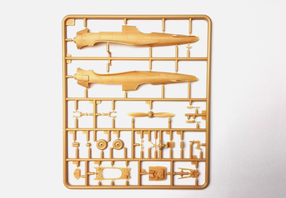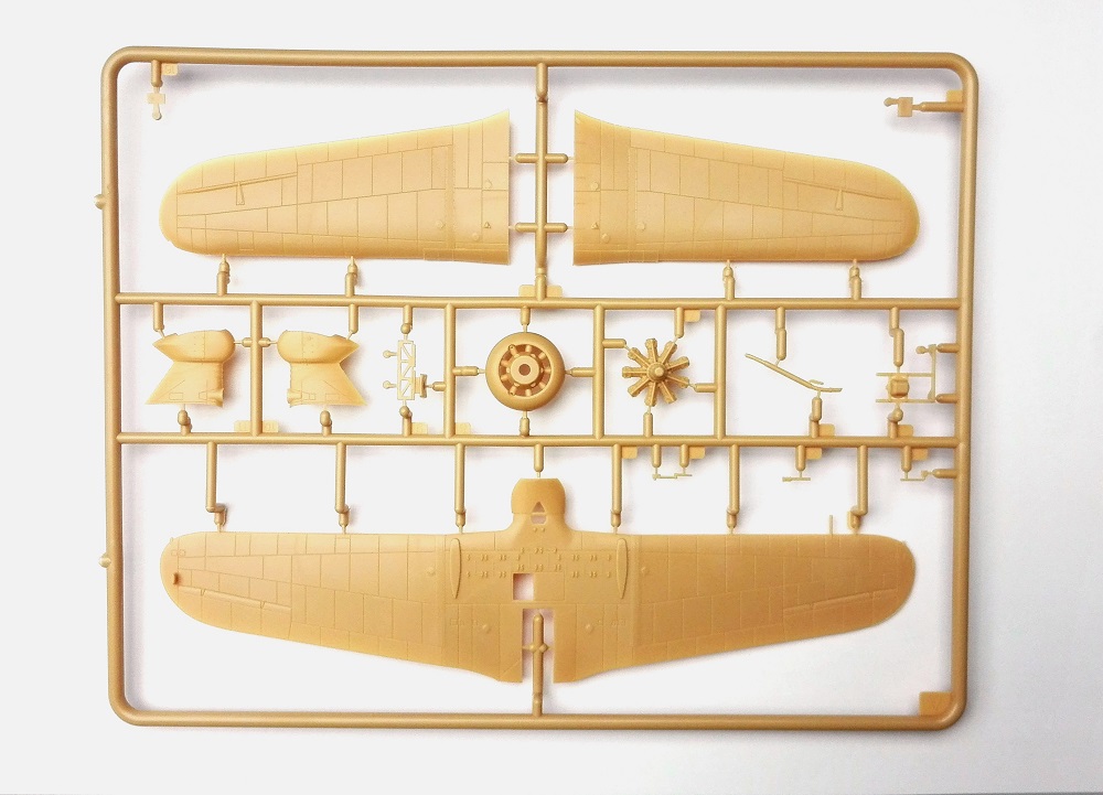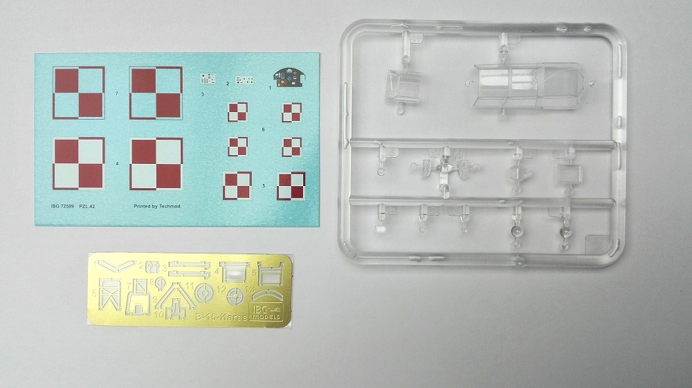 Der Bausatz für diesen polnischen leichten Bomber und Aufklärer besteht aus sechs Spritzrahmen in hellem sandgelben Plastik, einem Spritzrahmen mit Klarsichtteilen, einer kleinen Platine mit PE-Teilen und einem Decalsheet. Insgesamt macht der Bausatz einen sehr guten Eindruck. Der Spritzguss wirkt einwandfrei mit feinen Gravuren und sehr gut ausgearbeiteten Details. Die Angüsse fallen erfreulich klein aus und werden sich leicht entfernen und versäubern lassen. Die Klarsichtteile sind absolut schlierenfrei und die Verstrebungen der Kanzel sind sehr schön erhaben ausgeführt. Das dürfte das Abkleben und spätere lackieren erheblich erleichtern.