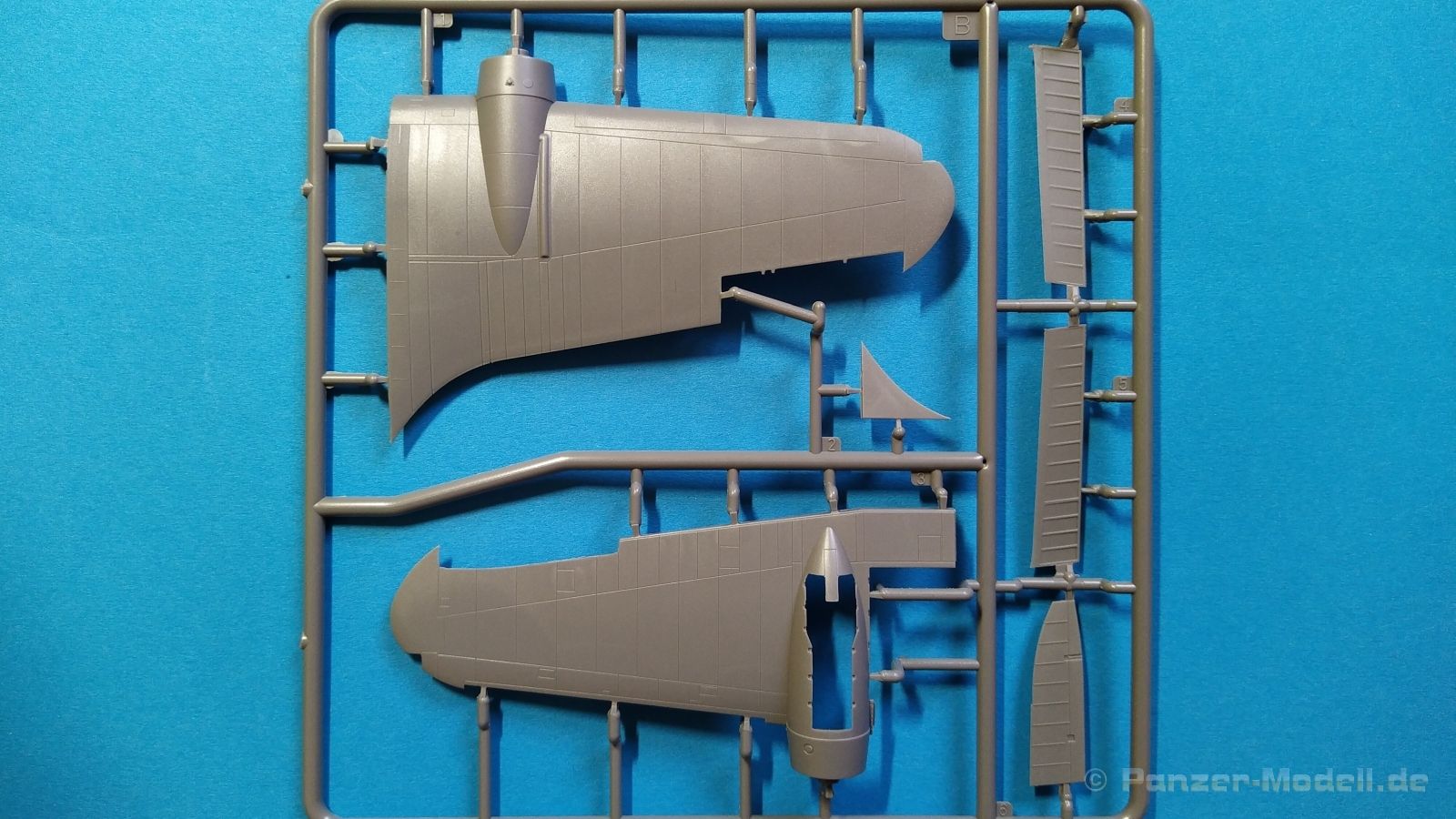 Grundsätzlich besteht der Bausatz wie bei den meisten Flugzeugbausätzen aus linker und rechter Rumpfhälfte und jeweils Ober- und Unterteil für die Flügel rechts und links und weiteren Anbauteilen wie z.B. Höhen- und Seitenruder.