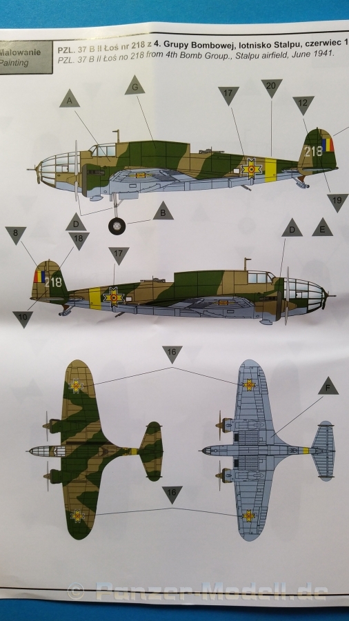 Die Bauanleitung ist zweisprachig ausgelegt. Es gibt Hinweise in polnischer und englischer Sprache. Sie ist sehr detailliert und übersichtlich aufgebaut. Zu Beginn findet man eine Übersicht der enthaltenen Decals und Fotoätzteile sowie Farbangaben für die Hersteller Vallejo, Hataka, Life Color, Mr. Hobby, und AK Interactive. Im Weiteren folgt dann eine Übersicht der enthaltenen Gießäste. Danach folgt die eigentliche Bauanleitung, die sich in 23 Baustufen gliedert. Hier wird pro Baustufe anhand von einfarbigen 3D-Zeichnungen Schritt für Schritt der Weg zum fertigen Modell dargestellt bzw. erklärt. Den Abschluss der Anleitung bilden drei verschiedene Bemalungs- und Markierungsvarianten.