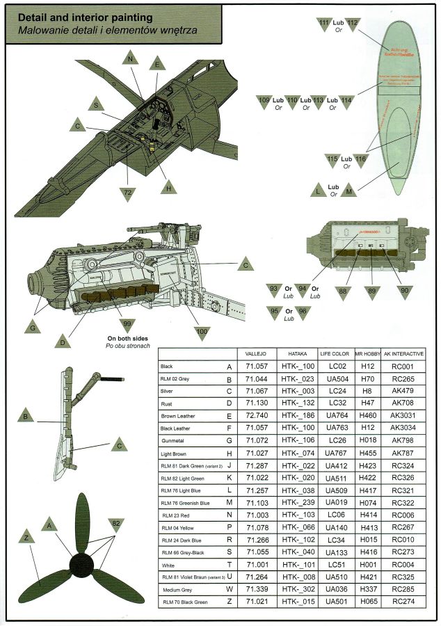 Sieben graue Spritzlinge finden sich in dem üblichen für IBG typischen Karton, dazu ein Rahmen mit Klarteilen. Dazu gibt es zwei recht umfangreiche Abziehbilderbögen, eine filigrane PE-Platine und natürlich die obligate Bauanleitung. Alle Rahmen mit den Bauteilen sind absolut sauber gespritzt. Versatz und/oder Grat ist nicht vorhanden.. Angüsse sind geschickt auf den Rahmen gesetzt und die Teile weisen einen hohen und scharfen Detaillierungsgrad auf. Fangen wir doch mal bei dem Triebwerk an. Für diesen Maßstab ist der Jumo 213A-1 recht schön wiedergegeben. Es sind einige, teils winzige Aggregate zu verbauen bis man den Motor mit den Motorträgern verbinden kann. Sehr schön gemacht und umgesetzt. Detailfanatiker werden sich hier sicher auch noch austoben… Das Cockpit ist ebenfalls gut und ausreichend gestaltet und besitzt die nötige Ausstattung incl. dem Gurtzeug für den Piloten. Die Gerätebretter und Seitenkonsolen können sowohl mit dem Pinsel bemalt oder aber mit Decals belegt werden. Jeder nach seinem Gusto. Ein paar Ätzteile werten den Führerraum weiter auf. Gleichwohl gibt es auch noch zwei ebenfalls ansprechend gemachte MG 131 mit Magazinen die vor der Cockpitfront verbaut werden. Leider verschwindet alles unter einer ebenfalls toll umgesetzten Motorhaube. Eine Option diese offen darzustellen gibt es nicht. Allerdings zeigt sich der Motor später durch die Öffnungen in den Fahrwerksschächten. Auch in diesem Fall hat IBG gute Recherchearbeit betrieben. Und hier kommt bei der Motorabdeckung der neue Spritzling R zum Zuge. Weitere Änderungen sind in der Bauanleitung zu finden und ein zweiter genauerer Blick ist der Sache dienlich. Rumpf und Tragflächen sind mit einer Unzahl von fein ausgeführten Panellinien und Nietenreihen überzogen. Für manche etwas irritierend, aber es gibt genügend Fotos auf denen diese Details deutlich zu sehen sind. Top umgesetzt. Sehr schöne Idee ist auch der Spant, der vor dem Cockpitbereich eingebaut wird. Dieser wird bei dem späteren Einbau der Tragflächen eine große Hilfe sein da die Flächen dann im richtigen Winkel zum Rumpf liegen. Leider ist das Pitotrohr am rechten oberen Flügel mit angegossen. Lieber abtrennen und erst am Ende des Baus wieder ankleben. Für die Komplettierung der Radschächte kommen wieder Ätzteile zum Einsatz und zwei weitere MG 151/20 in den Flügelwurzeln. Diverse Ruderflächen sind einzeln beigelegt und können in der vom Modellbauer gewünschten Stellung fixiert werden. Stifte für die Kontrolle eines ausgefahrenen Fahrwerks sind ebenfalls vorhanden und auf der Oberseite der Tragflächen einzubauen. Ein Detail das immer wieder bei anderen Kits vernachlässigt wurde. Punkten kann auch das gesamte Fahrwerk und wenn ich mich nicht täusche sind die Reifen dezent abgeplattet. Lediglich Bremsleitungen können ergänzt werden. Die Kanzel/n ist/sind schlierenfrei, angenehm dünn gespritzt und werden mit einer Kopfstütze sowie einer Strebe komplettiert. Die Klarheit ist bei allen mitgelieferten Kanzeln sehr gut. Durch die Feinheit der Teile sollte einer Lackierung mit dem Airbrush der Vorzug gegeben werden. Bei einer Pinselbemalung besteht eventuell die Gefahr zu viele Details in Farbe zu ersticken. An Außenlast kann ein Reservetank angebaut werden. Das bleibt jedoch jedem selbst überlassen. Die 16-seitige Bauanleitung im A4 Format ist in schwarz-weiß mit farbigen Akzenten gehalten. Kurze Beschreibungen oder Anleitungen sind in Polnisch und in Englisch. Auf der ersten Seite finden wir etwas zur Geschichte des Flugzeuges und auf Seite 2 die Teileübersicht. Auf Seite drei gibt es eine Bemalungstabelle mit Farbnummern für Valejo, Hataka, Life Color, Mr. Hobby und AK Interactive. 23 Bauschritte führen einen zum fertigen Modell in sinnvoll aufgeteilten, leicht verständlichen Schritten mit ausreichend großen Zeichnungen, Farbangaben wo notwendig incl.. Einzelne Baugruppen, die in einem späteren Bauschritt verbaut werden, erhalten eine weiße Nummer in einem Dreieck. Bei Verwendung der Baugruppe erscheint das Dreieck wieder, dann in schwarzer Schrift. Dreiecke mit der Spitze nach unten verweisen auf Decals. Am Ende der Bauschritte gibt es noch eine Zeichnung des fertigen Modells aus drei Blickwinkeln. Zwei Seiten sind für die Anbringung von Wartungshinweisen reserviert und drei Bemalungsvorschläge gibt es auf den letzten Seiten. Diese sind am Ende des Bildteil zu sehen. Die Decals stammen von Techmod und machen erneut einen exzellenten Eindruck. IBG hat erneut einen weiteren tollen Bausatz geliefert. Richtig gut gemacht und auf der Höhe der Zeit. Aber wieder nichts für Anfänger auf Grund der Komplexität. Für das Gebotene geht auch der Preis absolut in Ordnung!