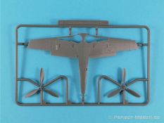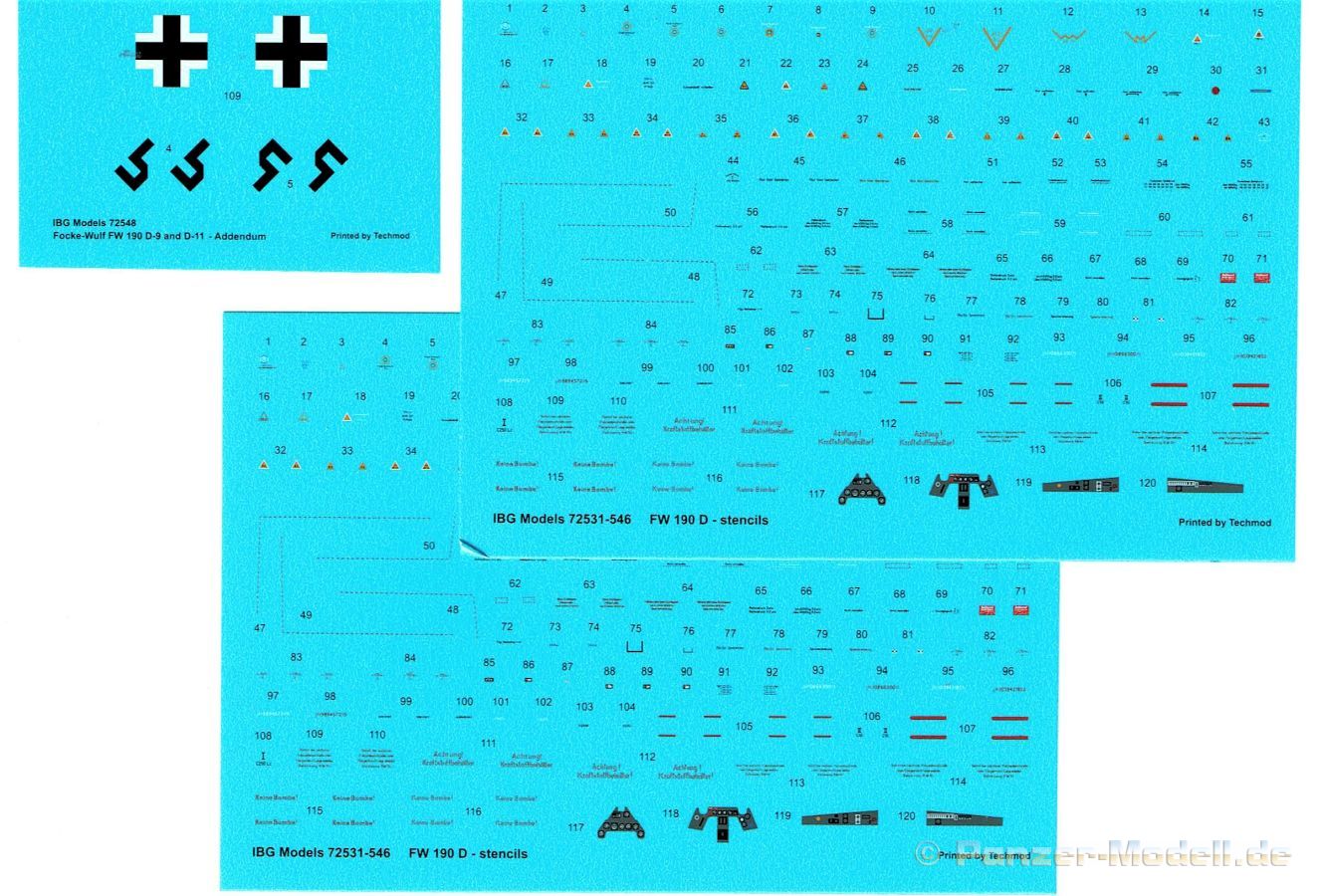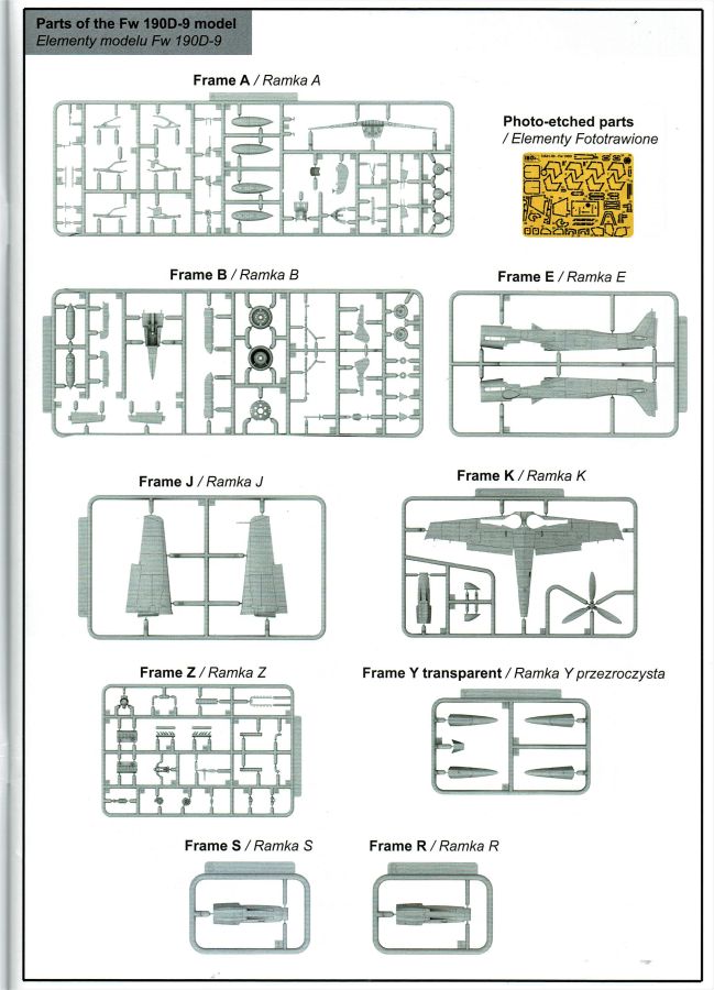 Der Jagdverband 44 (JV 44) war eine Jagdfliegereinheit die mit Me 262 ausgerüstet war und vom Februar bis zum April 1945 elf Wochen lang bestand. In den Phasen des Starts und der Landung waren die Turbos triebwerksbedingt schwerfällig und dadurch äußerst verwundbar. Diesen Umstand machten sich alliierte Jäger gerne zu nutze und fingen die Strahlflugzeuge in diesen Phasen gerne ab. Abhilfe sollte die Platzschutzstaffel JV 44 schaffen. Kurz vor dem Start der Me 262 sollte der Platzschutz starten und den Luftraum um den Fliegerhorst von feindlichen Jagdfliegern säubern. Unter dem Schwarmführer Leutnant Heinz Sachsenberg entstand der sogenannte „Sachsenbergschwarm“ (später auch „Papageistaffel“. Ausgenommen die Rote 2.). Alle Piloten wurden seinerzeit von Generalleutnant Adolf Galland persönlich für die Platzschutzstaffel ausgewählt. Geflogen wurde mit Fw 190 D-9 (drei) und Fw D-11 (zwei). Um nicht irrtümlich von der eigenen Flak beschossen zu werden erhielten die Fws einen ganzflächigen Unterbodenanstrich in Rot mit weißen Streifen durch die Wartungsmannschaften. Auffällig waren auch die Embleme und Sprüche mit denen die Maschinen versehen waren. Dazu aber w.u. mehr. Liegeplätze waren München-Riem und später Ainring in Oberbayern. Werfen wir zunächst einen Blick in den Karton mit Stülpdeckel. Dieser enthält 17 Rahmen in einem hellgrauen Material. Neun davon entfallen auf eine D-9 und weitere acht auf eine D-11 die uns erstmals als Bausatz vorliegt. Dazu kommen zwei identische PE-Platinen, sehr umfangreiche Decals und die obligate Bauanleitung. Nicht zu vergessen die absolut klaren unterschiedlich ausgeformten Kanzeln. Alle Rahmen mit den Bauteilen sind absolut sauber gespritzt. Versatz und/oder Grat ist nicht vorhanden. Die Angüsse sind geschickt auf den Rahmen gesetzt und die Teile weisen einen sehr hohen und scharfen Detaillierungsgrad auf. IBG hat sich auch die Mühe gemacht alle Unterschiede der Jäger darzustellen. Die Spritzlinge A, B, Z und Y sind für beide Maschinen identisch. Ersetzt wurden bei der D-11 Spritzling E durch G (Rumpfhälften), J durch M (Flügeloberseiten) K durch N (Flügel- und Rumpfunterseiten, Propeller) und S und R durch T (Motorhauben). In direktem Vergleich sind die Änderungen sehr gut zu erkennen. Im Bildteil sind im zweiten Block nur die für eine D-11 geänderten Teile fotografisch festgehalten. Fangen wir doch mal bei dem Triebwerk an. Für diesen Maßstab ist der Jumo 213A-1 recht schön wiedergegeben. Es sind einige, teils winzige Aggregate zu verbauen bis man den Motor mit den Motorträgern verbinden kann. Sehr schön gemacht und umgesetzt. Detailfanatiker werden sich hier sicher auch noch austoben… Leider verschwindet fast alles unter der ebenfalls toll gemachten Motorabdeckung und eine Option diese offen darzustellen gibt es nicht. Das Cockpit ist ebenfalls gut und ausreichend gestaltet und besitzt die nötige Ausstattung incl. dem Gurtzeug für den Piloten. Die Gerätebretter und Seitenkonsolen können sowohl mit dem Pinsel bemalt oder aber mit Decals belegt werden. Jeder nach seinem Gusto. Ein paar Ätzteile werten den Führerraum weiter Allerdings zeigt sich der Motor später durch die Öffnungen in den Fahrwerksschächten. Auch in diesem Fall hat IBG gute Recherchearbeit betrieben. Rumpf und Tragflächen sind mit einer Unzahl von fein ausgeführten Panellinien und Nietenreihen überzogen. Für manche etwas irritierend, aber es gibt genügend Fotos auf denen diese Details deutlich zu sehen sind. Top umgesetzt. Sehr schöne Idee ist auch der Spant, der vor dem Cockpitbereich eingebaut wird. Dieser wird bei dem späteren Einbau der Tragflächen eine große Hilfe sein da die Flächen dann im richtigen Winkel zum Rumpf liegen. Leider ist das Pitotrohr am rechten oberen Flügel mit angegossen. Lieber abtrennen und erst am Ende des Baus wieder ankleben. Für die Komplettierung der Radschächte kommen weitere Ätzteile zum Einsatz. Diverse Ruderflächen sind einzeln beigelegt und können in der vom Modellbauer gewünschten Stellung fixiert werden. Stifte für die Kontrolle eines ausgefahrenen Fahrwerks sind ebenfalls vorhanden und auf der Oberseite der Tragflächen einzubauen. Ein Detail das immer wieder bei anderen Kits vernachlässigt wurde. Punkten kann auch das gesamte Fahrwerk und wenn ich mich nicht täusche sind die Reifen dezent abgeplattet. Lediglich Bremsleitungen können ergänzt werden. Die Kanzel/n ist/sind schlierenfrei, angenehm dünn gespritzt und werden mit einer Kopfstütze sowie einer Strebe komplettiert. Die Klarheit ist bei allen mitgelieferten Kanzeln sehr gut. Durch die Feinheit der Teile sollte einer Lackierung mit dem Airbrush der Vorzug gegeben werden. Bei einer Pinselbemalung besteht eventuell die Gefahr zu viele Details in Farbe zu ersticken. Die Bauanleitung im A4 Format ist in schwarz-weiß mit farbigen Akzenten gehalten. Kurze Beschreibungen oder Anleitungen sind in Polnisch und in Englisch. Auf der ersten Seite finden wir etwas zur Geschichte des Flugzeuges in allgemeiner Form und auf Seite drei und vier die Teileübersicht. Auf Seite zwei die übliche Bemalungstabelle mit Farbnummern für Valejo, Hataka, Life Color, Mr. Hobby und AK Interactive sowie die Abbildungen der Decals. Insgesamt 22 Abschnitte sind für die D-9 vorgesehen, während die D-11 mit 20 auskommt. Alle Bauschritte führen einen zum fertigen Modell in sinnvoll aufgeteilten, leicht verständlichen Schritten mit ausreichend großen Zeichnungen und Farbangaben wo notwendig. Optionale Teile sind in der Anleitung in den jeweiligen Abschnitten mit angeführt. Einzelne Baugruppen, die in einem späteren Bauschritt verbaut werden, erhalten eine weiße Nummer in einem Dreieck. Bei Verwendung der Baugruppe erscheint das Dreieck wieder, dann in schwarzer Schrift. Dreiecke mit der Spitze nach unten verweisen auf Decals. Am Ende der Baus gibt es noch eine Zeichnung des fertigen Modells aus drei Blickwinkeln; mit offener oder geschlosse