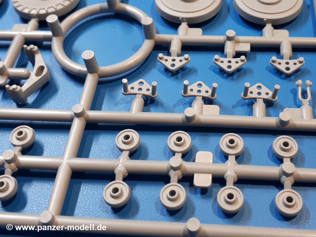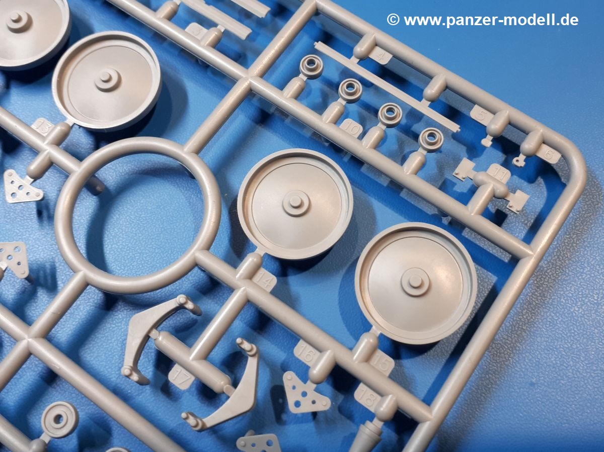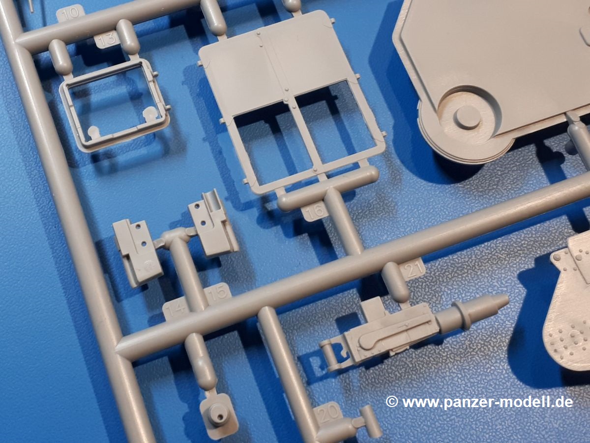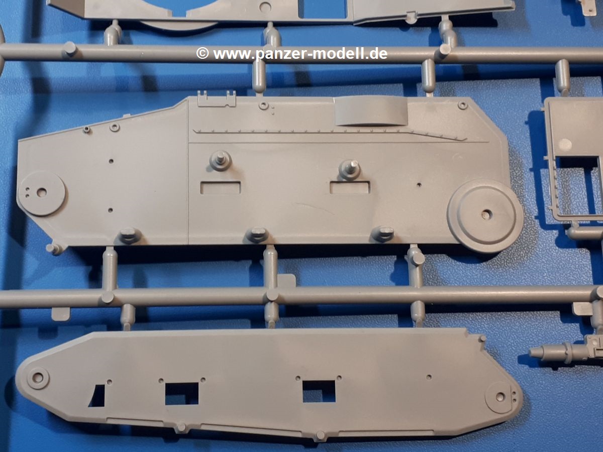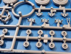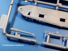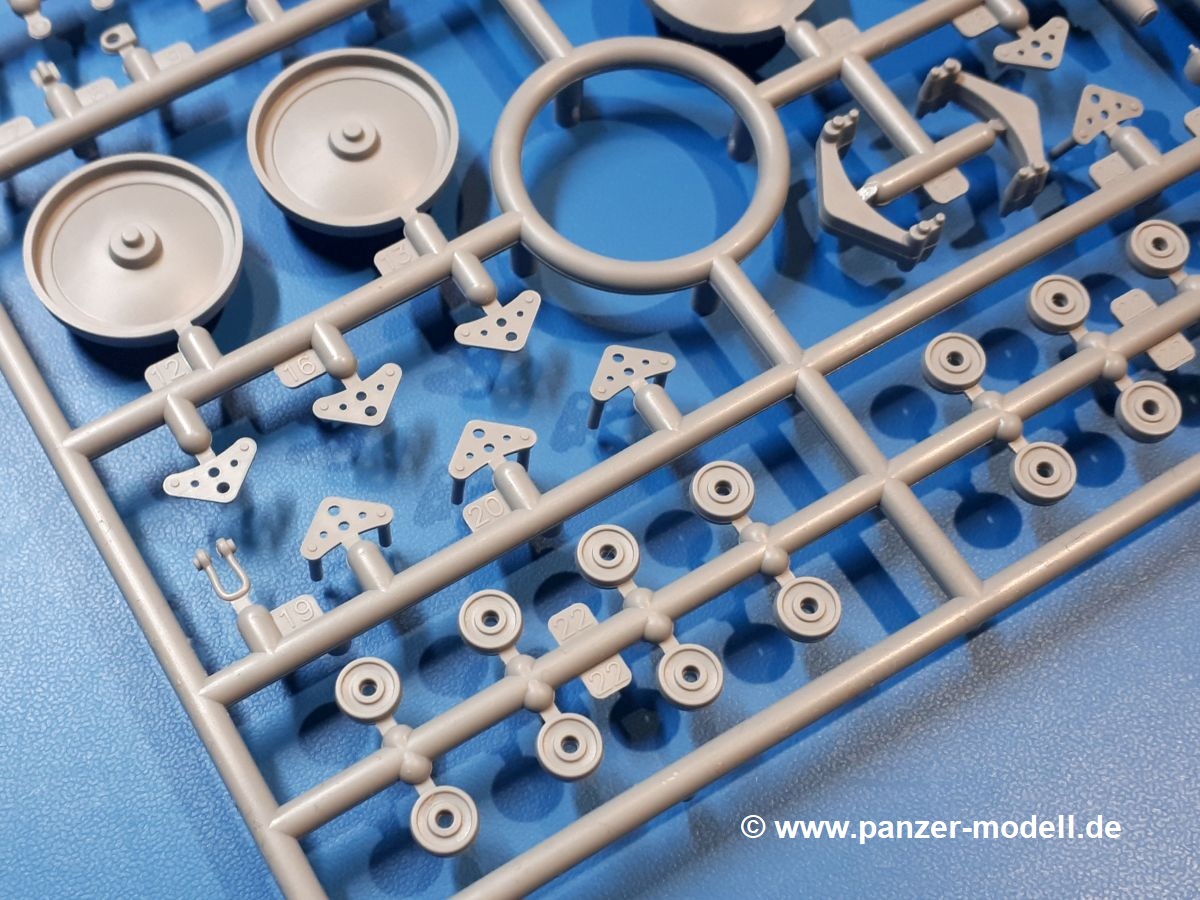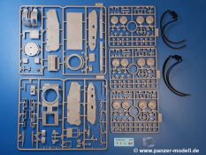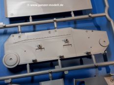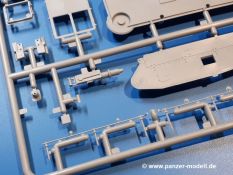 Das Original: Nach dem ersten Weltkrieg war es Deutschland verboten Panzer zu bauen. Nichtsdestotrotz wurde die Entwicklung von Panzern unter den Tarnbezeichnung Groß-, bzw. Leichttraktor vorangetrieben. Mit der Entwicklung des VK31 Leichttraktors wurden 1928 drei Firmen beauftragt. Obwohl 1931 fast 300 Leichttraktoren bestellt wurden, wurde die Bestellung später storniert, da die Prototypen bei Tests im russischen Kazan zu schlecht abgeschnitten hatten. Der Leichttraktor wurde von einem 100 PS Motor angetrieben, der das 9 Tonnen schwere Gefährt bis auf 30 km/h beschleunigen konnte. Als Bewaffnung diente eine 3,7 cm Kampfwagenkanone (KwK) und ein leichtes MG. Die Besatzung bestand aus Fahrer, Funker, Richtschütze und Kommandant. Der Bausatz: Der Karton ist 310 x 235 x 40 mm groß und enthält 5 graue, einen klaren, 2 schwarze Vinylspritzlinge, Decals und die Bauanleitung.Die Teile aus mittelgrauem Plastik sind sauber ausgespritzt, fast ohne Grat und Versatz. Es sind fast keine Auswerferspuren zu finden. Das Plastik macht einen etwas spröden Eindruck. Details wie Scharniere und Nieten sind fein wiedergegeben. Die Teile des Antennenrahmens sind extrem fein ausgeführt. Die einzigen Klarsichtteile, die Scheinwerfergläser, sind kristallklar. Die Vinylkettensegmente sind angenehm weich und sollten sich gut um Leit- und Antriebsräder legen.Die Wanne ist mehrteilig ausgelegt Boden-, Bug-, Heck-, Seitenplatten und Wannenabdeckung. Die Ansatzleisten sind ausreichend groß ausgeführt, so dass auch ein Anfänger die Wanne problemlos und sauber zusammensetzen können müsste. Es sind Öffnungen für Luken, Türen und Lüftungen vorhanden. Die Lüfteröffnung in der Bugplatte wird mit 3 separaten Lamellen versehen. Fahrer, Funkerlukendeckel und Hecktür können theoretisch offen angebaut werden, aber dann schaut man ins leere Innere, falls man keine Figuren in die Luken setzt. Die Öffnungen in der großen Motorklappe werden vor dem Einsetzen mit 6 Lamellen verschlossen. Je Seite werden 3 Hebepilze und am Heck 2 bewegliche Schäkel und Anhängekupplung mit separatem Bolzen angebracht. Die meisten Teile entfallen auf das Fahrwerk. Die 2 Doppelstützrollen pro Seite sind sehr klein, ebenso wie die Bugstützrolle. 3 Laufrollenwagen mit je 4 Doppellaufrollen bilden den Hauptteil des Laufwerks. Die großen Leit- und Antriebsräder sehen sich sehr ähnlich, da die Antriebsräder innenliegende „Zähne“ haben. Fast das ganze Laufwerk verschwindet dann hinter Laufwerksabdeckungen mit Schmutzabführungsöffnungen und feinen Nieten und Scharnieren. Jede Kette aus schwarzem Vinyl ist fein detailliert und besteht aus 2 Segmenten, die verklebt werden. Seitlich vorn links und rechts der Motorabdeckung finden sich die Hauptscheinwerfer wieder, die ausgehöhlt sind und mit kristallklaren Gläsern ausgestattet werden. Die dünnen Kettenbleche überdecken nur die hinteren Hälften der Ketten. Auf den Kettenblechen finden die Halterungen der U-förmigen Rahmenantenne Platz. Die Antenne ist sehr dünn, also beim Abtrennen vom Spritzling Vorsicht walten lassen, besonders beim hinteren Teil der Antenne.Der Turm besteht aus dem Drehring, 2 Turmhälften und dem Turmdach. Auf das Turmdach kommen 2 Optikausblicke. Es gibt wie beim Original keine Dachluken, sondern nur je eine links und rechts. Diese seitlichen Luken können auch geöffnet angebaut werden, sodass man hineinschauen kann, was sich auch lohnt, denn der Turm hat so etwas wie eine Inneneinrichtung. Leider gibt es keine Gegenstücke zu den Optikausblicken, aber die Kanone hat Verschlussblock, Abweiser, Hülsenanschlag und -sack. Auch das MG-Hinterteil ist ausgestaltet mit MG-Gehäuse, Griff und Hülsenfangsack und wird mit einem Trommelmagazin vervollständigt. MG und Kanone stecken in der höhen-beweglichen Rohrwiege, auf die eine große Blende aufgesetzt wird. Der vordere Teil des Kanonenrohres ist halb hohl. Die andere Hälfte wird aufgeklebt, wodurch die Kanonenmündung entsteht. Das MG bekommt noch seine Mündung mit einem kleinen Blendenkragen.Die Decals sind seidenmatt ohne Trägerrand und mit dünnen Trägerfilm. Es gibt nur 3 schwarz-weiße Balkenkreuze, die als Option angegeben sind, aber gemäß den wenigen Fotos, die es vom Leichttraktor gibt, werden sie eigentlich gar nicht gebraucht. Der Lackierungsvorschlag besteht aus einer 3-farb Tarnung (Sand, Grün, Braun) und soll einen Prototyp von 1930 darstellen. Die 16-seitige Bauanleitung im A4 Format ist hauptsächlich in schwarz-weiß mit farbiger Bemalungstafel gehalten. Kurze Beschreibungen oder Anleitungen sind in kyrillisch und in englisch gehalten. Die erste Seite startet mit der Kurzgeschichte, den technischen Daten des Leichttraktors und den benötigten Farben. Es gibt Farbnummern für Revell und Tamiyafarben. Die großformatige Teile- und Spritzlingübersicht zieht sich von Seite 2-3. Der Bau des Fahrzeugs wird in 52 sinnvoll aufgeteilten, leicht verständlichen Schritten erklärt. Das letzte Bild zeigt das fertige Fahrzeug, gefolgt von der Bemalungsanleitung.Klein, aber fein! Sicherlich wird der Leichttraktor als Zwischenglied auf dem Weg zur Panzerwaffe von vielen begrüßt. Zum kleinen Preis von 25 27 Euro in Deutschland großes Kino!Muster bereitgestellt von: