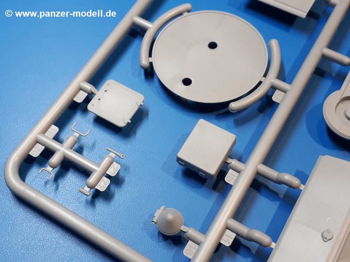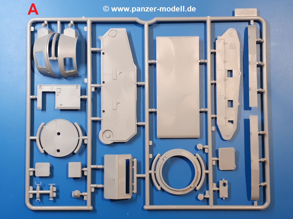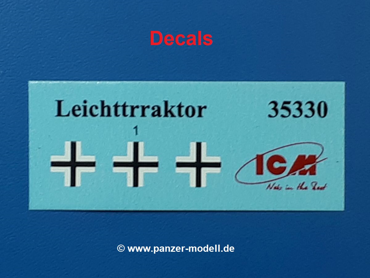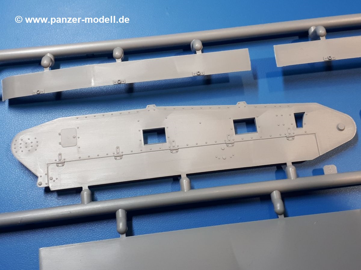 Das Original: Nach dem ersten Weltkrieg war es Deutschland verboten Panzer zu bauen. Nichtsdestotrotz wurde die Entwicklung von Panzern unter den Tarnbezeichnung Groß-, bzw. Leichttraktor vorangetrieben. Mit der Entwicklung des VK31 Leichttraktors wurden 1928 drei Firmen beauftragt. Obwohl 1931 fast 300 Leichttraktoren bestellt wurden, wurde die Bestellung später storniert, da die Prototypen bei Tests im russischen Kazan zu schlecht abgeschnitten hatten. Der Leichttraktor wurde von einem 100 PS Motor angetrieben, der das 9 Tonnen schwere Gefährt bis auf 30 km/h beschleunigen konnte. Als Bewaffnung diente eine 3,7 cm Kampfwagenkanone (KwK) und ein leichtes MG. Die Besatzung bestand aus Fahrer, Funker, Richtschütze und Kommandant. Der Bausatz: Der Karton ist 310 x 235 x 40 mm groß und enthält 5 graue, einen klaren, 2 schwarze Vinylspritzlinge, Decals und die Bauanleitung.Die Teile aus mittelgrauem Plastik sind sauber ausgespritzt, fast ohne Grat und Versatz. Es sind fast keine Auswerferspuren zu finden. Das Plastik macht einen etwas spröden Eindruck. Details wie Scharniere und Nieten sind fein wiedergegeben. Die Teile des Antennenrahmens sind extrem fein ausgeführt. Die einzigen Klarsichtteile, die Scheinwerfergläser, sind kristallklar. Die Vinylkettensegmente sind angenehm weich und sollten sich gut um Leit- und Antriebsräder legen.Die Wanne ist mehrteilig ausgelegt Boden-, Bug-, Heck-, Seitenplatten und Wannenabdeckung. Die Ansatzleisten sind ausreichend groß ausgeführt, so dass auch ein Anfänger die Wanne problemlos und sauber zusammensetzen können müsste. Es sind Öffnungen für Luken, Türen und Lüftungen vorhanden. Die Lüfteröffnung in der Bugplatte wird mit 3 separaten Lamellen versehen. Fahrer, Funkerlukendeckel und Hecktür können theoretisch offen angebaut werden, aber dann schaut man ins leere Innere, falls man keine Figuren in die Luken setzt. Die Öffnungen in der großen Motorklappe werden vor dem Einsetzen mit 6 Lamellen verschlossen. Je Seite werden 3 Hebepilze und am Heck 2 bewegliche Schäkel und Anhängekupplung mit separatem Bolzen angebracht. Die meisten Teile entfallen auf das Fahrwerk. Die 2 Doppelstützrollen pro Seite sind sehr klein, ebenso wie die Bugstützrolle. 3 Laufrollenwagen mit je 4 Doppellaufrollen bilden den Hauptteil des Laufwerks. Die großen Leit- und Antriebsräder sehen sich sehr ähnlich, da die Antriebsräder innenliegende „Zähne“ haben. Fast das ganze Laufwerk verschwindet dann hinter Laufwerksabdeckungen mit Schmutzabführungsöffnungen und feinen Nieten und Scharnieren. Jede Kette aus schwarzem Vinyl ist fein detailliert und besteht aus 2 Segmenten, die verklebt werden. Seitlich vorn links und rechts der Motorabdeckung finden sich die Hauptscheinwerfer wieder, die ausgehöhlt sind und mit kristallklaren Gläsern ausgestattet werden. Die dünnen Kettenbleche überdecken nur die hinteren Hälften der Ketten. Auf den Kettenblechen finden die Halterungen der U-förmigen Rahmenantenne Platz. Die Antenne ist sehr dünn, also beim Abtrennen vom Spritzling Vorsicht walten lassen, besonders beim hinteren Teil der Antenne.Der Turm besteht aus dem Drehring, 2 Turmhälften und dem Turmdach. Auf das Turmdach kommen 2 Optikausblicke. Es gibt wie beim Original keine Dachluken, sondern nur je eine links und rechts. Diese seitlichen Luken können auch geöffnet angebaut werden, sodass man hineinschauen kann, was sich auch lohnt, denn der Turm hat so etwas wie eine Inneneinrichtung. Leider gibt es keine Gegenstücke zu den Optikausblicken, aber die Kanone hat Verschlussblock, Abweiser, Hülsenanschlag und -sack. Auch das MG-Hinterteil ist ausgestaltet mit MG-Gehäuse, Griff und Hülsenfangsack und wird mit einem Trommelmagazin vervollständigt. MG und Kanone stecken in der höhen-beweglichen Rohrwiege, auf die eine große Blende aufgesetzt wird. Der vordere Teil des Kanonenrohres ist halb hohl. Die andere Hälfte wird aufgeklebt, wodurch die Kanonenmündung entsteht. Das MG bekommt noch seine Mündung mit einem kleinen Blendenkragen.Die Decals sind seidenmatt ohne Trägerrand und mit dünnen Trägerfilm. Es gibt nur 3 schwarz-weiße Balkenkreuze, die als Option angegeben sind, aber gemäß den wenigen Fotos, die es vom Leichttraktor gibt, werden sie eigentlich gar nicht gebraucht. Der Lackierungsvorschlag besteht aus einer 3-farb Tarnung (Sand, Grün, Braun) und soll einen Prototyp von 1930 darstellen. Die 16-seitige Bauanleitung im A4 Format ist hauptsächlich in schwarz-weiß mit farbiger Bemalungstafel gehalten. Kurze Beschreibungen oder Anleitungen sind in kyrillisch und in englisch gehalten. Die erste Seite startet mit der Kurzgeschichte, den technischen Daten des Leichttraktors und den benötigten Farben. Es gibt Farbnummern für Revell und Tamiyafarben. Die großformatige Teile- und Spritzlingübersicht zieht sich von Seite 2-3. Der Bau des Fahrzeugs wird in 52 sinnvoll aufgeteilten, leicht verständlichen Schritten erklärt. Das letzte Bild zeigt das fertige Fahrzeug, gefolgt von der Bemalungsanleitung.Klein, aber fein! Sicherlich wird der Leichttraktor als Zwischenglied auf dem Weg zur Panzerwaffe von vielen begrüßt. Zum kleinen Preis von 25 27 Euro in Deutschland großes Kino!Muster bereitgestellt von: