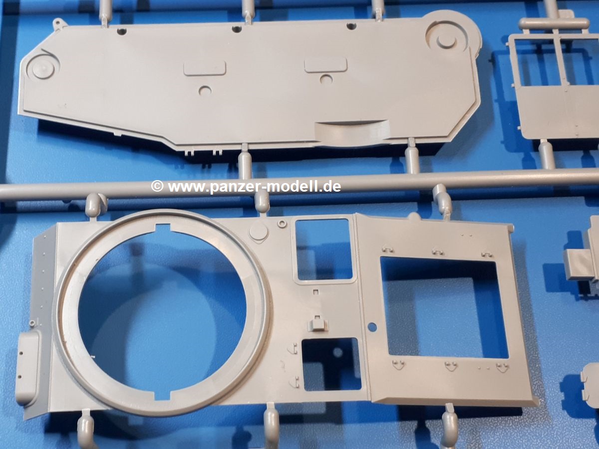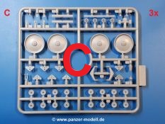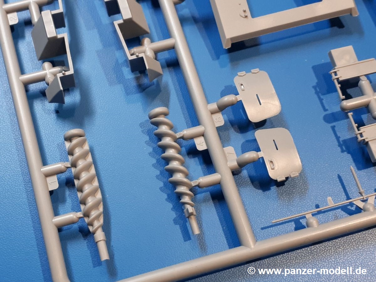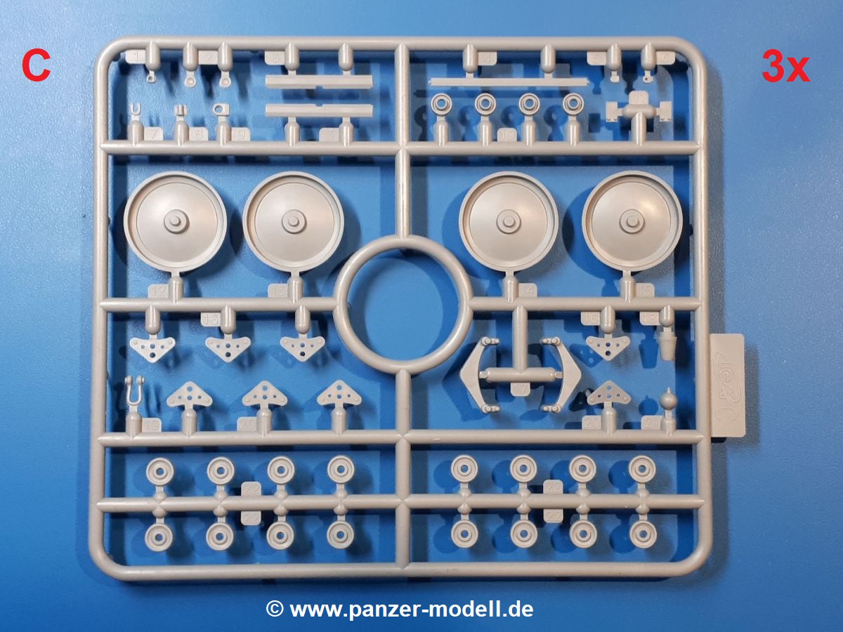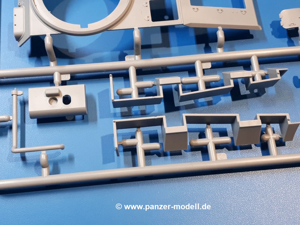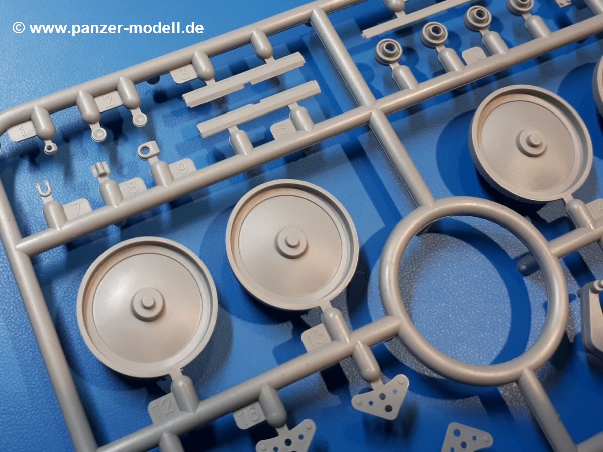 Das Original: Nach dem ersten Weltkrieg war es Deutschland verboten Panzer zu bauen. Nichtsdestotrotz wurde die Entwicklung von Panzern unter den Tarnbezeichnung Groß-, bzw. Leichttraktor vorangetrieben. Mit der Entwicklung des VK31 Leichttraktors wurden 1928 drei Firmen beauftragt. Obwohl 1931 fast 300 Leichttraktoren bestellt wurden, wurde die Bestellung später storniert, da die Prototypen bei Tests im russischen Kazan zu schlecht abgeschnitten hatten. Der Leichttraktor wurde von einem 100 PS Motor angetrieben, der das 9 Tonnen schwere Gefährt bis auf 30 km/h beschleunigen konnte. Als Bewaffnung diente eine 3,7 cm Kampfwagenkanone (KwK) und ein leichtes MG. Die Besatzung bestand aus Fahrer, Funker, Richtschütze und Kommandant. Der Bausatz: Der Karton ist 310 x 235 x 40 mm groß und enthält 5 graue, einen klaren, 2 schwarze Vinylspritzlinge, Decals und die Bauanleitung.Die Teile aus mittelgrauem Plastik sind sauber ausgespritzt, fast ohne Grat und Versatz. Es sind fast keine Auswerferspuren zu finden. Das Plastik macht einen etwas spröden Eindruck. Details wie Scharniere und Nieten sind fein wiedergegeben. Die Teile des Antennenrahmens sind extrem fein ausgeführt. Die einzigen Klarsichtteile, die Scheinwerfergläser, sind kristallklar. Die Vinylkettensegmente sind angenehm weich und sollten sich gut um Leit- und Antriebsräder legen.Die Wanne ist mehrteilig ausgelegt Boden-, Bug-, Heck-, Seitenplatten und Wannenabdeckung. Die Ansatzleisten sind ausreichend groß ausgeführt, so dass auch ein Anfänger die Wanne problemlos und sauber zusammensetzen können müsste. Es sind Öffnungen für Luken, Türen und Lüftungen vorhanden. Die Lüfteröffnung in der Bugplatte wird mit 3 separaten Lamellen versehen. Fahrer, Funkerlukendeckel und Hecktür können theoretisch offen angebaut werden, aber dann schaut man ins leere Innere, falls man keine Figuren in die Luken setzt. Die Öffnungen in der großen Motorklappe werden vor dem Einsetzen mit 6 Lamellen verschlossen. Je Seite werden 3 Hebepilze und am Heck 2 bewegliche Schäkel und Anhängekupplung mit separatem Bolzen angebracht. Die meisten Teile entfallen auf das Fahrwerk. Die 2 Doppelstützrollen pro Seite sind sehr klein, ebenso wie die Bugstützrolle. 3 Laufrollenwagen mit je 4 Doppellaufrollen bilden den Hauptteil des Laufwerks. Die großen Leit- und Antriebsräder sehen sich sehr ähnlich, da die Antriebsräder innenliegende „Zähne“ haben. Fast das ganze Laufwerk verschwindet dann hinter Laufwerksabdeckungen mit Schmutzabführungsöffnungen und feinen Nieten und Scharnieren. Jede Kette aus schwarzem Vinyl ist fein detailliert und besteht aus 2 Segmenten, die verklebt werden. Seitlich vorn links und rechts der Motorabdeckung finden sich die Hauptscheinwerfer wieder, die ausgehöhlt sind und mit kristallklaren Gläsern ausgestattet werden. Die dünnen Kettenbleche überdecken nur die hinteren Hälften der Ketten. Auf den Kettenblechen finden die Halterungen der U-förmigen Rahmenantenne Platz. Die Antenne ist sehr dünn, also beim Abtrennen vom Spritzling Vorsicht walten lassen, besonders beim hinteren Teil der Antenne.Der Turm besteht aus dem Drehring, 2 Turmhälften und dem Turmdach. Auf das Turmdach kommen 2 Optikausblicke. Es gibt wie beim Original keine Dachluken, sondern nur je eine links und rechts. Diese seitlichen Luken können auch geöffnet angebaut werden, sodass man hineinschauen kann, was sich auch lohnt, denn der Turm hat so etwas wie eine Inneneinrichtung. Leider gibt es keine Gegenstücke zu den Optikausblicken, aber die Kanone hat Verschlussblock, Abweiser, Hülsenanschlag und -sack. Auch das MG-Hinterteil ist ausgestaltet mit MG-Gehäuse, Griff und Hülsenfangsack und wird mit einem Trommelmagazin vervollständigt. MG und Kanone stecken in der höhen-beweglichen Rohrwiege, auf die eine große Blende aufgesetzt wird. Der vordere Teil des Kanonenrohres ist halb hohl. Die andere Hälfte wird aufgeklebt, wodurch die Kanonenmündung entsteht. Das MG bekommt noch seine Mündung mit einem kleinen Blendenkragen.Die Decals sind seidenmatt ohne Trägerrand und mit dünnen Trägerfilm. Es gibt nur 3 schwarz-weiße Balkenkreuze, die als Option angegeben sind, aber gemäß den wenigen Fotos, die es vom Leichttraktor gibt, werden sie eigentlich gar nicht gebraucht. Der Lackierungsvorschlag besteht aus einer 3-farb Tarnung (Sand, Grün, Braun) und soll einen Prototyp von 1930 darstellen. Die 16-seitige Bauanleitung im A4 Format ist hauptsächlich in schwarz-weiß mit farbiger Bemalungstafel gehalten. Kurze Beschreibungen oder Anleitungen sind in kyrillisch und in englisch gehalten. Die erste Seite startet mit der Kurzgeschichte, den technischen Daten des Leichttraktors und den benötigten Farben. Es gibt Farbnummern für Revell und Tamiyafarben. Die großformatige Teile- und Spritzlingübersicht zieht sich von Seite 2-3. Der Bau des Fahrzeugs wird in 52 sinnvoll aufgeteilten, leicht verständlichen Schritten erklärt. Das letzte Bild zeigt das fertige Fahrzeug, gefolgt von der Bemalungsanleitung.Klein, aber fein! Sicherlich wird der Leichttraktor als Zwischenglied auf dem Weg zur Panzerwaffe von vielen begrüßt. Zum kleinen Preis von 25 27 Euro in Deutschland großes Kino!Muster bereitgestellt von: