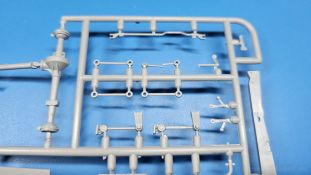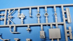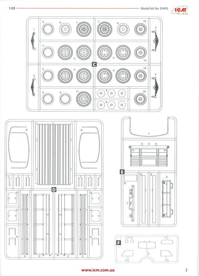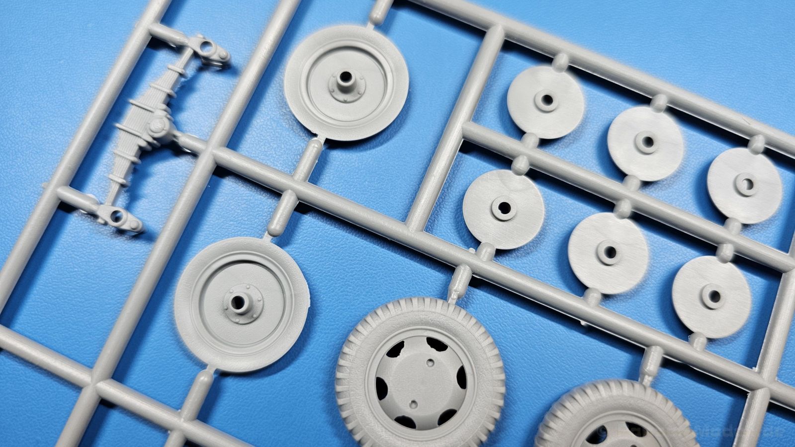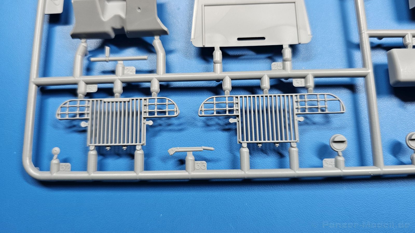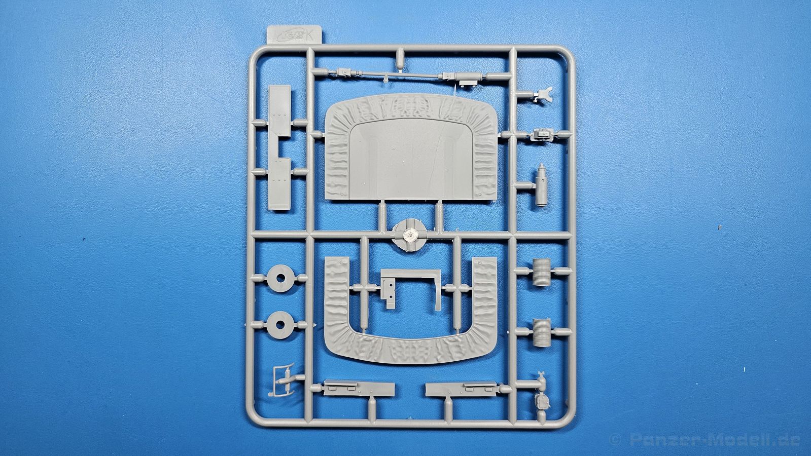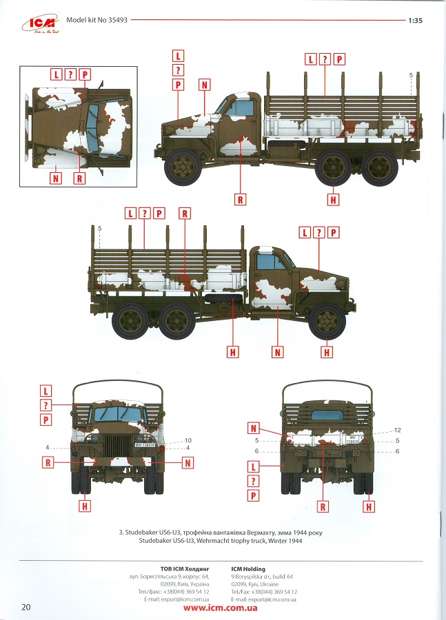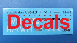 Das Original: Der Schwerlastlastwagen Studebaker US6 wurde von 1941 bis 1945 von der Studebaker Corporation entwickelt und gebaut. Das Fahrzeug zeichnete sich durch eine robuste Konstruktion und eine hervorragende Nutzlastkapazität zwischen 2,3 und 5 to. aus. Sein 6-Zylinder-Hercules-JXD-Motor mit 94 PS und die Antriebsformel 6x4 und 6x6 sorgte für hohe Geländegängigkeit des Studebaker US6. Insgesamt wurden etwa 200.000 Fahrzeuge in dreizehn Varianten hergestellt. Rund 100.000 davon gingen im Rahmen des Leih- und Pacht (Lend & Lease) Abkommens an die Sowjet Union. So gerieten auch viele Fahrzeuge in die Hände der Wehrmacht und wurden dort rege genutzt. Der Bausatz: ICM hat den Studebaker US6 schon länger im Programm und legt ihn im Laufe der Zeit in anderen Versionen und Decaloptionen neu auf. Der Karton mit Klappdeckel und darüber gestülptem Deckel ist 310 x 235 x 60 mm groß und recht stabil. Das farbige Deckelbild zeigt ihn mit sandgelben Tarnlinien und Wehrmachtskennzeichen auf einer unbefestigten Straße mit zwei Opel Blitz. Auf einer Längsseite sind drei Seitenansichten der Markierungsoptionen zu sehen, auf der anderen eine kurze Inhaltsbeschreibung in Englisch. Im Karton befinden sich eine 20-seitige Bauanleitung, 6 hellgraue und 1 Klarsichtspritzling, 1 Planenteil und ein Naßschiebebilderbogen. Die Teile aus hellgrauem Plastik sind sauber ausgespritzt, hier und da mit feinem Grat, aber ohne Versatz. Angüsse sind so gesetzt, dass Details nicht beeinträchtigt werden. Auswerferspuren sind zwar vorhanden, sollten aber nicht stören, da sie sich größtenteils an Stellen befinden, die nach dem Bau nicht mehr einsehbar sind. Die Spritzlinge der Verkaufsbausätze sind in Klarsichtbeutel verpackt. Mein Muster erreichte mich ohne diese zusätzliche Verpackung, so dass es etwas Bruch gab (ein Stabilisator). Ein wenig Klebstoff wird dies beheben. Wie bei den bereits bekannten Modellen gibt es einen Leiterrahmen aus Längs- und Querträgern, die aber aufgrund der eindeutigen Verbindungsstellen verzugsfrei ineinanderpassen sollten. Anbauteile wie Blattfedern, Trittbleche, Tank, Ersatzrad an den Seiten, Stoßstange vorn und Anhängekupplung und Stoßfänger hinten finden ihren Platz am Rahmen. Der Antrieb startet beim gut detaillierten Motor, der alle wichtigen Teile vom Motorblock mit Ölwanne über Vergaser mit Luftfilter, Abgaskanal, Anlasser, Lichtmaschine, Lüfterrad bis hin zum Kühler samt Kühlleitung beinhaltet. Kupplungsdom und Schaltgetriebe schließen hinten an. Der Auspuff ist zwar zweiteilig, aber nicht in Hälften geteilt. Das Endrohr mag man ggfs. noch aufbohren wollen. Der Antriebsstrang mit den Kardanwellen zur Vorder- und den Hinterachsen besteht aus einem Stück. Man muss nur Teile der Differential- und des Verteilergetriebes ergänzen. Die Räder mit eingegossenen Felgen sind aus Plastik. Das militärische Profil zeigt korrekt die versetzten Stollen. Ein feiner Grat läuft um die Räder, ist aber leicht entfernbar. Die Reifenflanken sind mit deutlich erkennbaren, erhabenen Herstellerangaben (Firestone, Radgrößen) versehen. Das geschlossene Fahrerhaus verlangt ob der Teilezahl sauberes Bauen, damit zum Schluss die Türen sauber eingepasst werden können. Im Fahrerhaus sind alle wichtigen Details (Pedale, Schalt-, Handbremshebel, Armaturentafel, Lenkrad, Sitzbank) vorhanden. Sitzbank und Rückenlehne sind recht unspektakulär. Hier könnte man mittels verdünnter Spachtelmasse oder Seidenpapier noch etwas für die Struktur tun. Mehr Struktur hat das Lenkrad, dass auf seiner Rückseite die Griffmulden zeigt. Für die Armaturen gibt Naßschiebebilder für manche Anzeigen, für die kristallklare Windschutzscheibe Aufstellhebel, die aber etwas grob ausgefallen sind und Scheibenwischer aus Plastik. Auch die Fenster für Rückwand und Türen sind glasklar und kratzerfrei. Die Türen können geschlossen oder offen angebaut werden. Innen bringt man Handgriff, Öffnerhebel und Fensterkurbel an, außen ein Öffnerhebel und Rückspiegel. Die Motorhaube wird an das Fahrerhaus vor Montage auf dem Rahmen angebaut. Innen wird noch eine Fahrzeugbatterie eingebaut. Die Haube selbst lässt sich leider nicht ohne Eigenaufwand in geöffnetem Zustand anbauen. Will man den schönen Motor zeigen, sollte man die Haube nur auflegen, statt zu kleben. Der Kühlergrill ist auch etwas grob, aber noch im Rahmen. Es sind zwei verschiedene Grills im Bausatz, aber es soll nur der mit dem erweiterten Schutzrahmen links verwendet werden, obwohl bei den Scheinwerfern wieder die Wahl zwischen normalen Hauptscheinwerfern (mit Klarsichtgläsern) mit Begrenzungsleuchten und zusätzlicher Tarnleuchte links und Tarnscheinwerfern (Tarnabdeckung statt Glas) mit Begrenzungsleuchten ohne zusätzliche Tarnleuchte besteht. Letztere Konfiguration würde auch den einfachen, symmetrischen Grill erlauben, aber die drei Markierungsvorschläge beziehen sich alle auf die erste mit asymmetrischem Grill. Die Blechpritsche besteht aus den Basisteilen Ladefläche, Front-, Seitenwände und Heckklappe. Die Ladefläche besitzt an der Unterseite bereits die Querträger. Es müssen nur die Hilfsträger angebracht werden, mit der die Pritsche am Rahmen aufsitzt, und natürlich die vier Schmutzfänger mit Stützträgern und ein hinterer Staukasten mit dem Rücklichtrahmen. Auf der Oberseite der Pritsche erkennt man gut die Längsrillung. Die Sitzbänke können herunter- oder hochgeklappt montiert werden. An der Lattung der Sitzbänke und der Seitenteile erkenne ich eine Holzmaserung. Es gibt fünf vollständige Spriegel, aber keine Information, wo und wie sie zu lagern sind, wenn sie nicht in die Seiten eingesteckt werden. Will man sie in die Seiten eingesteckt anbauen, müssen sie gem. Anleitung gekürzt werden. Es liegt auch ein sehr schönes Planenteil mit zusätzlichen Teilen für Front und Heck bei. Will man die Plane anbringen, soll man die Lattungen der Front- und Seitenteile abschneiden, obwohl die Planenteile innen A